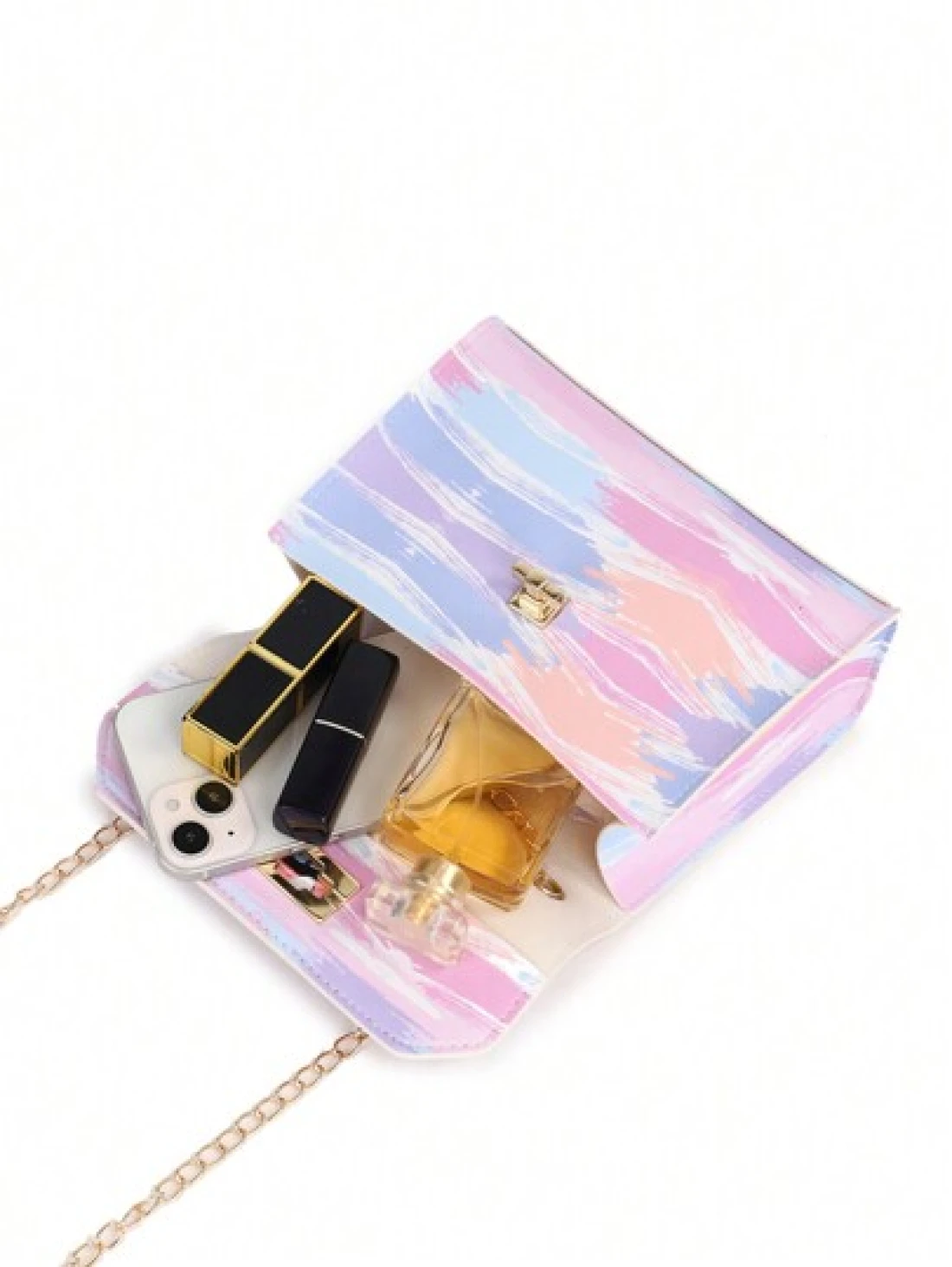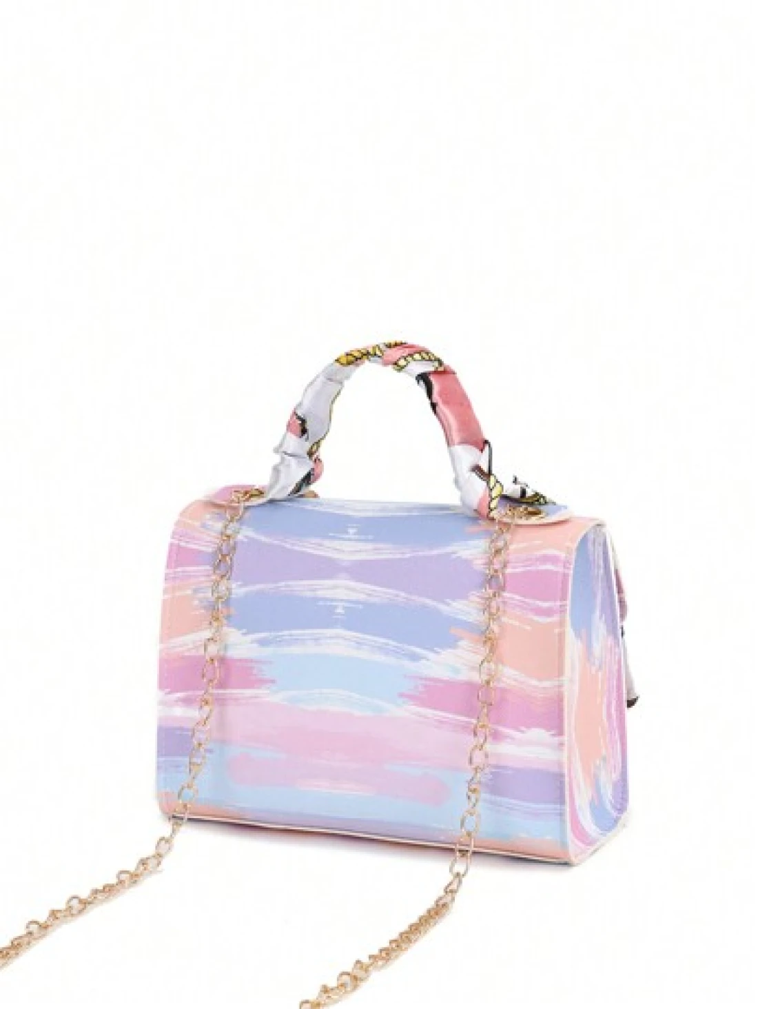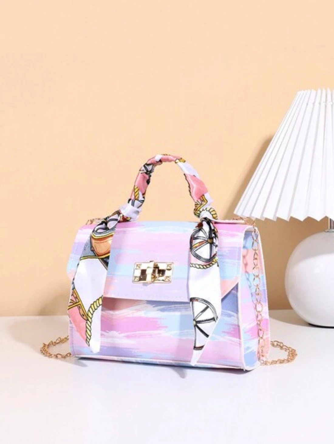 حقيبة يد بطية ومقبض سلسلة مع زخرفة حريرية بطبعة مضغوطة