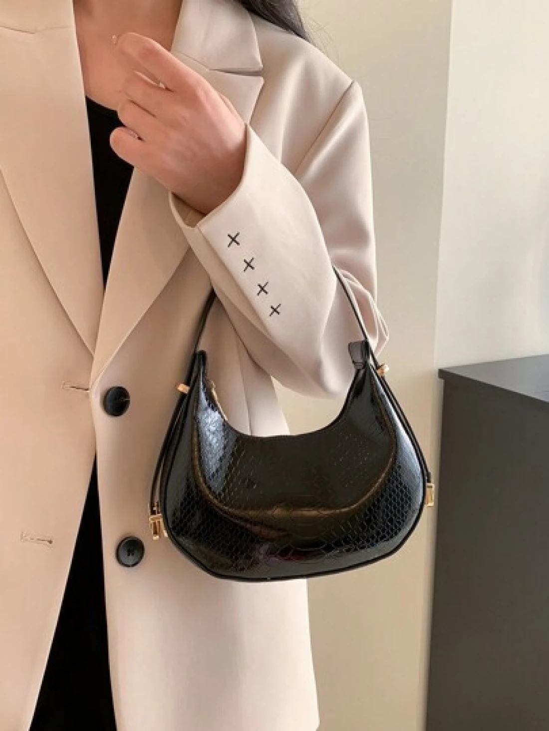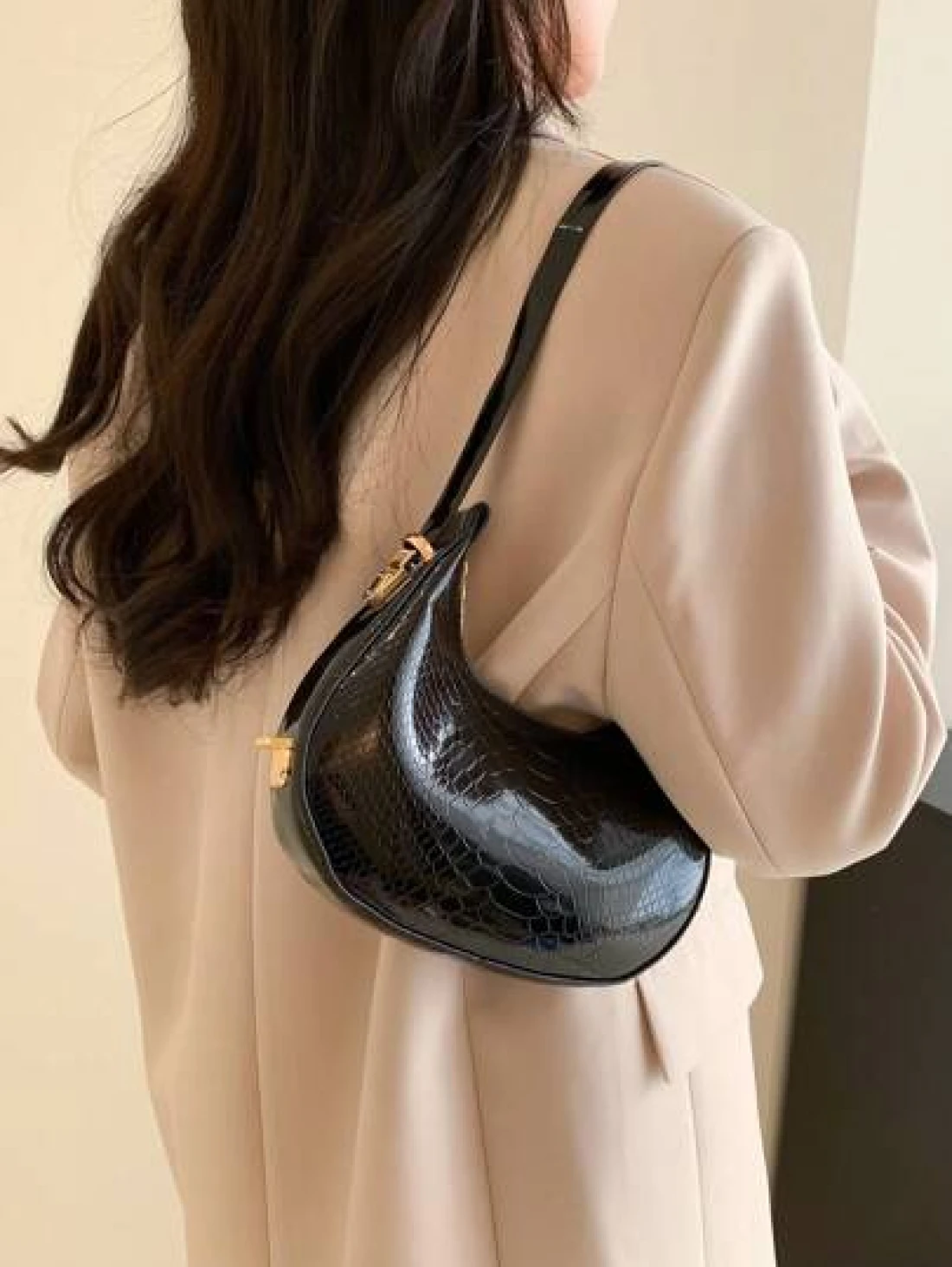 حقيبة هوبو منقوشة بجلد الثعبان المعدني بلون صلب، حقيبة كتف منقوشة بجلد التمساح ، حقيبة باقيت صيحة الموضة، حقي