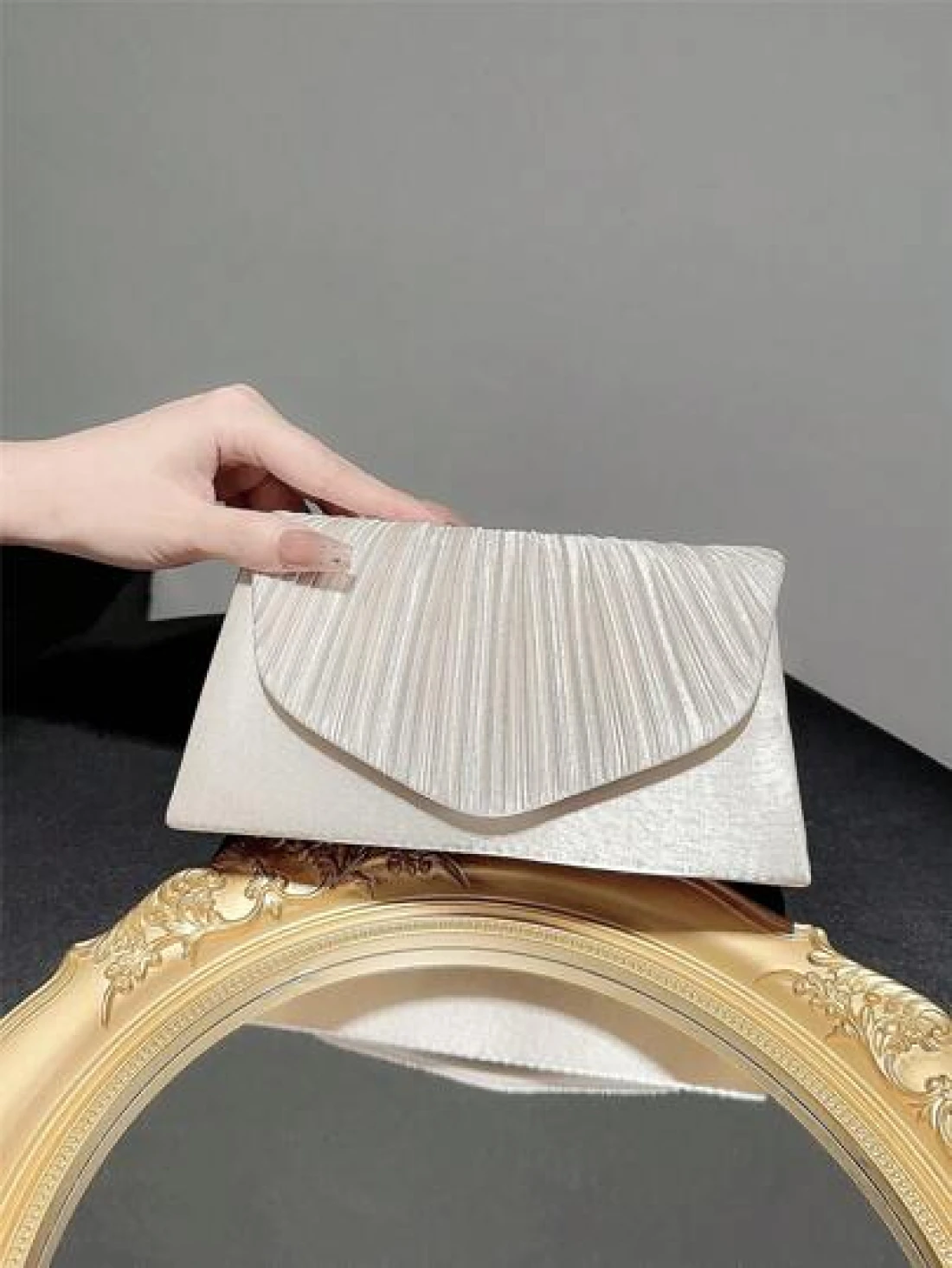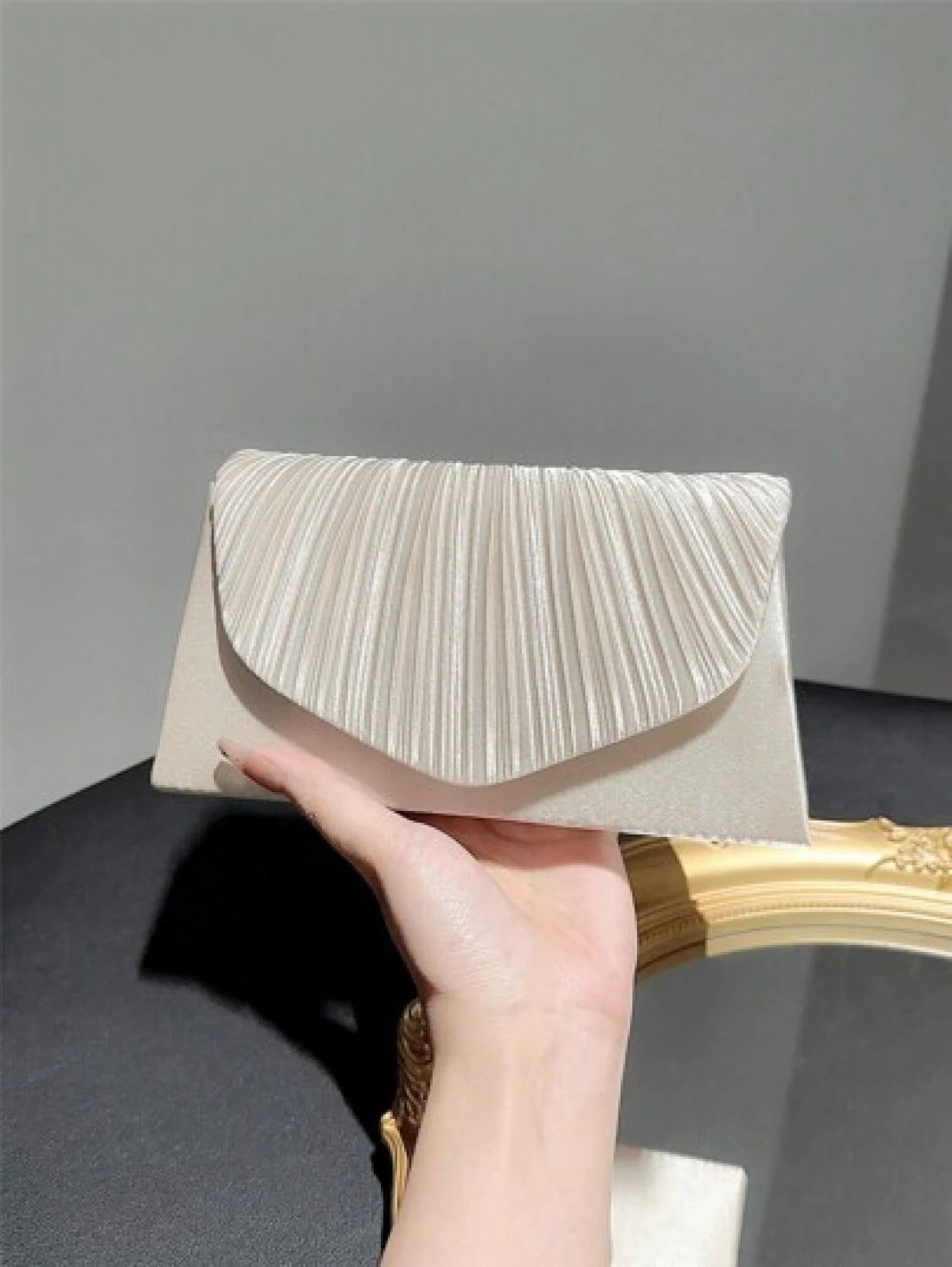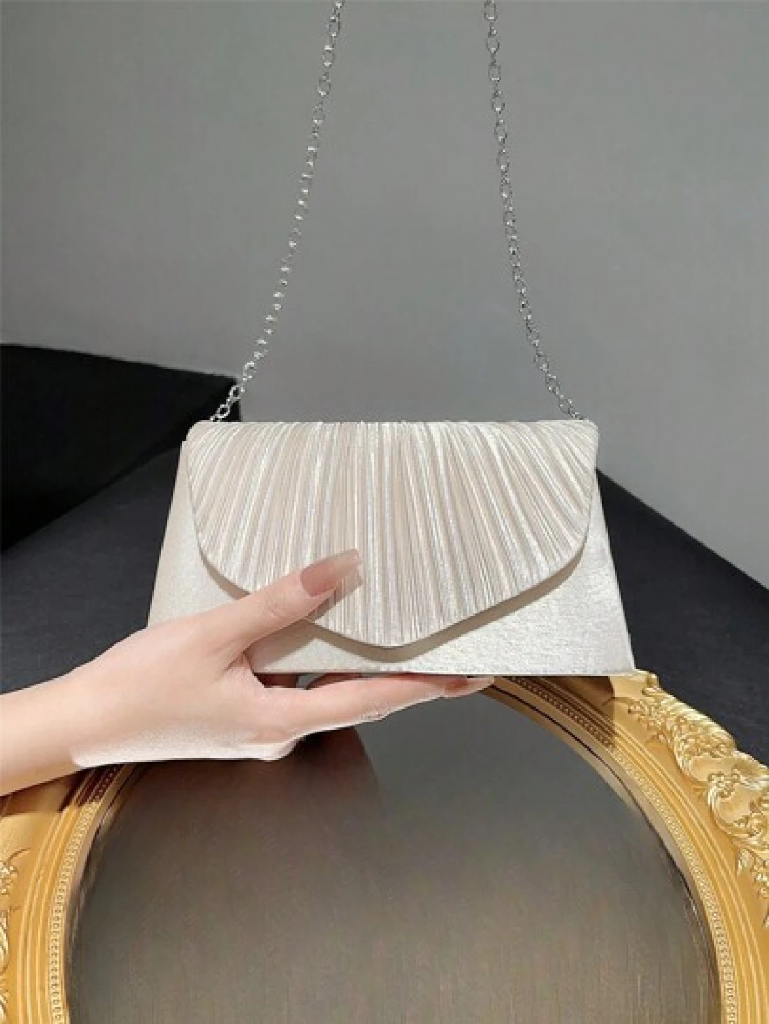 حقيبة كلاسيكية وأنيقة للمرأة بتصميم بسطوني وطية. مثالية للحفلات الرسمية والأعراس الرومانسية والرقصات والفعاليات المسائية.يمكن استخدامها كحقيبة يد ،حقيبة ظرف ،أو حقيبة سلسلة. تناسب الفساتين المسائية أو الفساتين الرسمية.