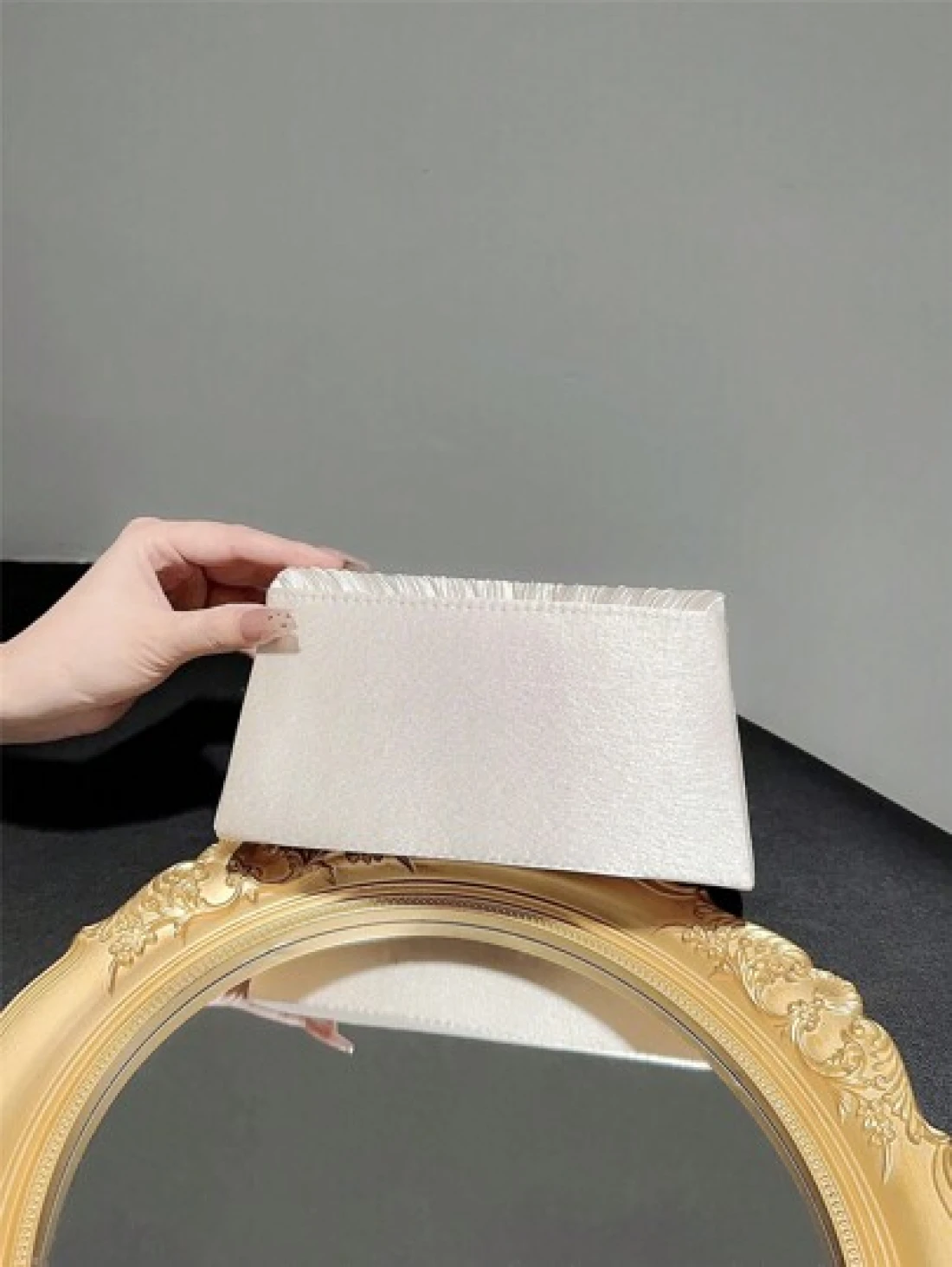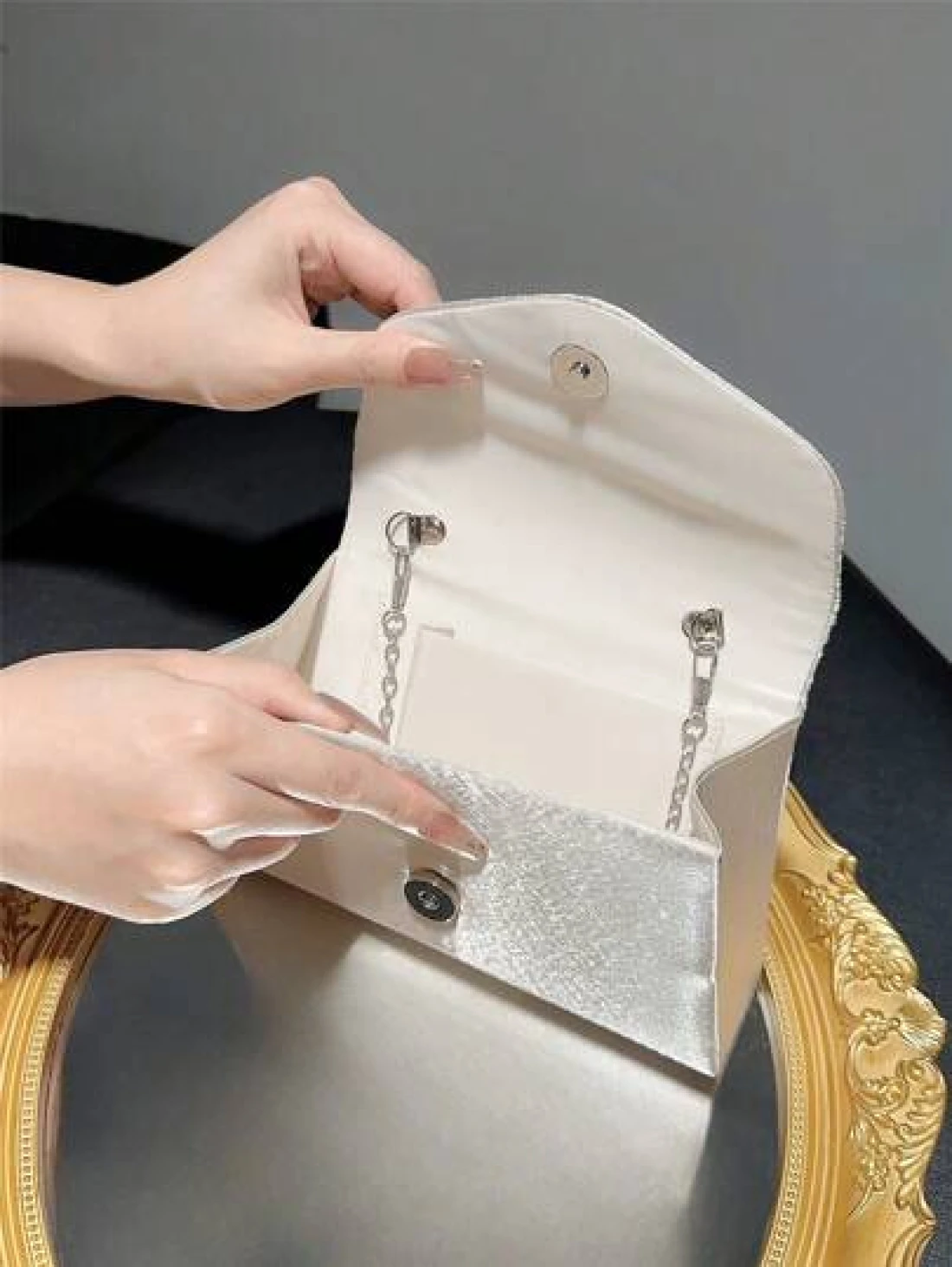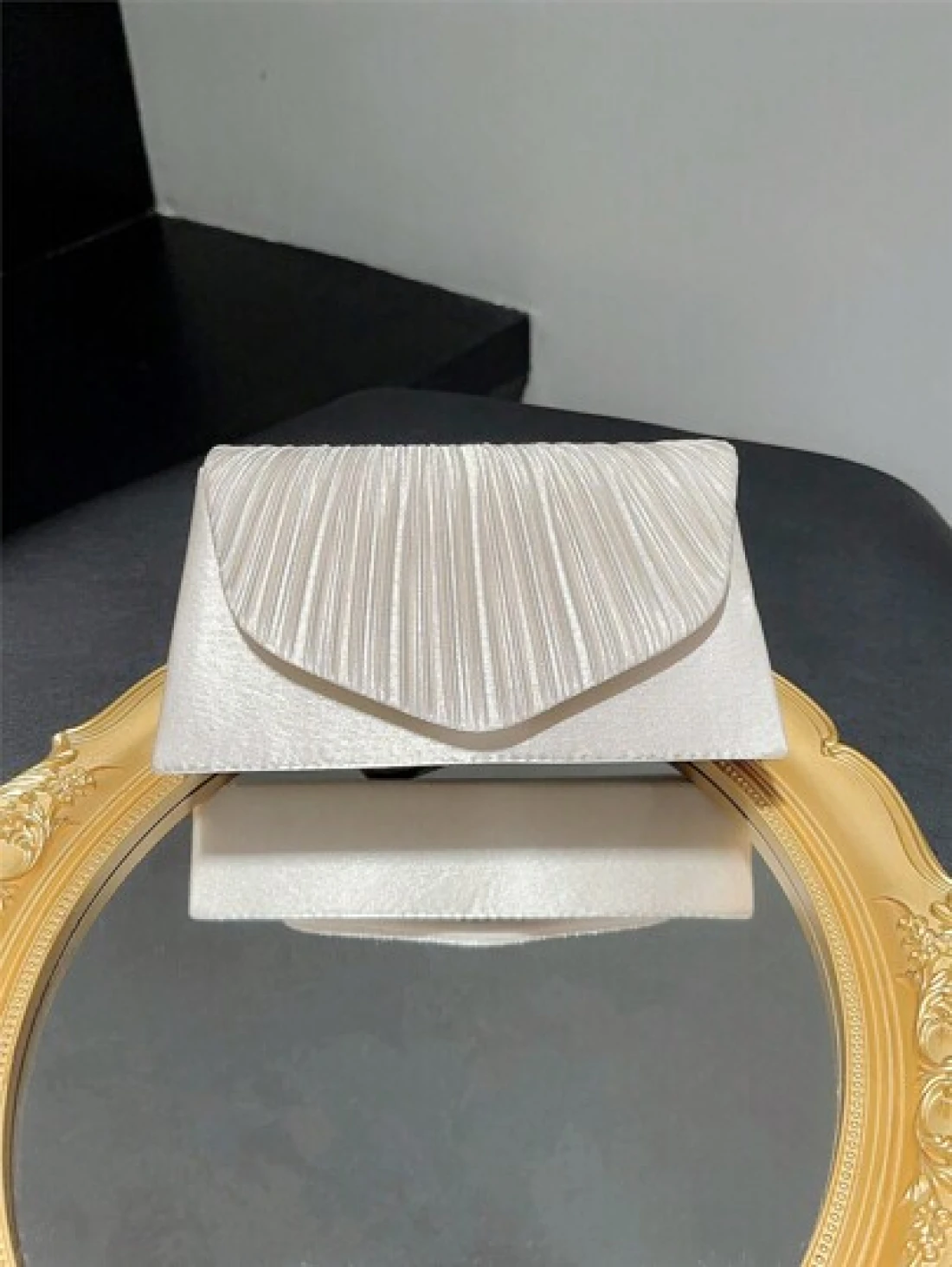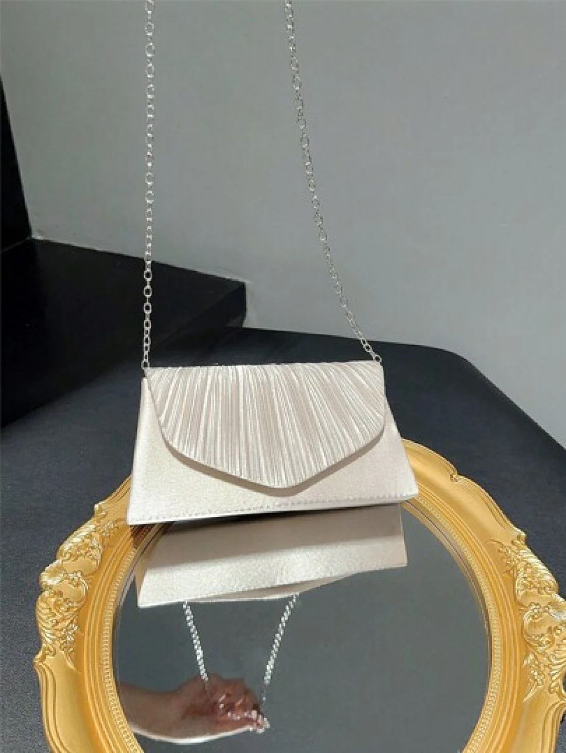 حقيبة كلاسيكية وأنيقة للمرأة بتصميم بسطوني وطية. مثالية للحفلات الرسمية والأعراس الرومانسية والرقصات والفعاليات المسائية.يمكن استخدامها كحقيبة يد ،حقيبة ظرف ،أو حقيبة سلسلة. تناسب الفساتين المسائية أو الفساتين الرسمية.