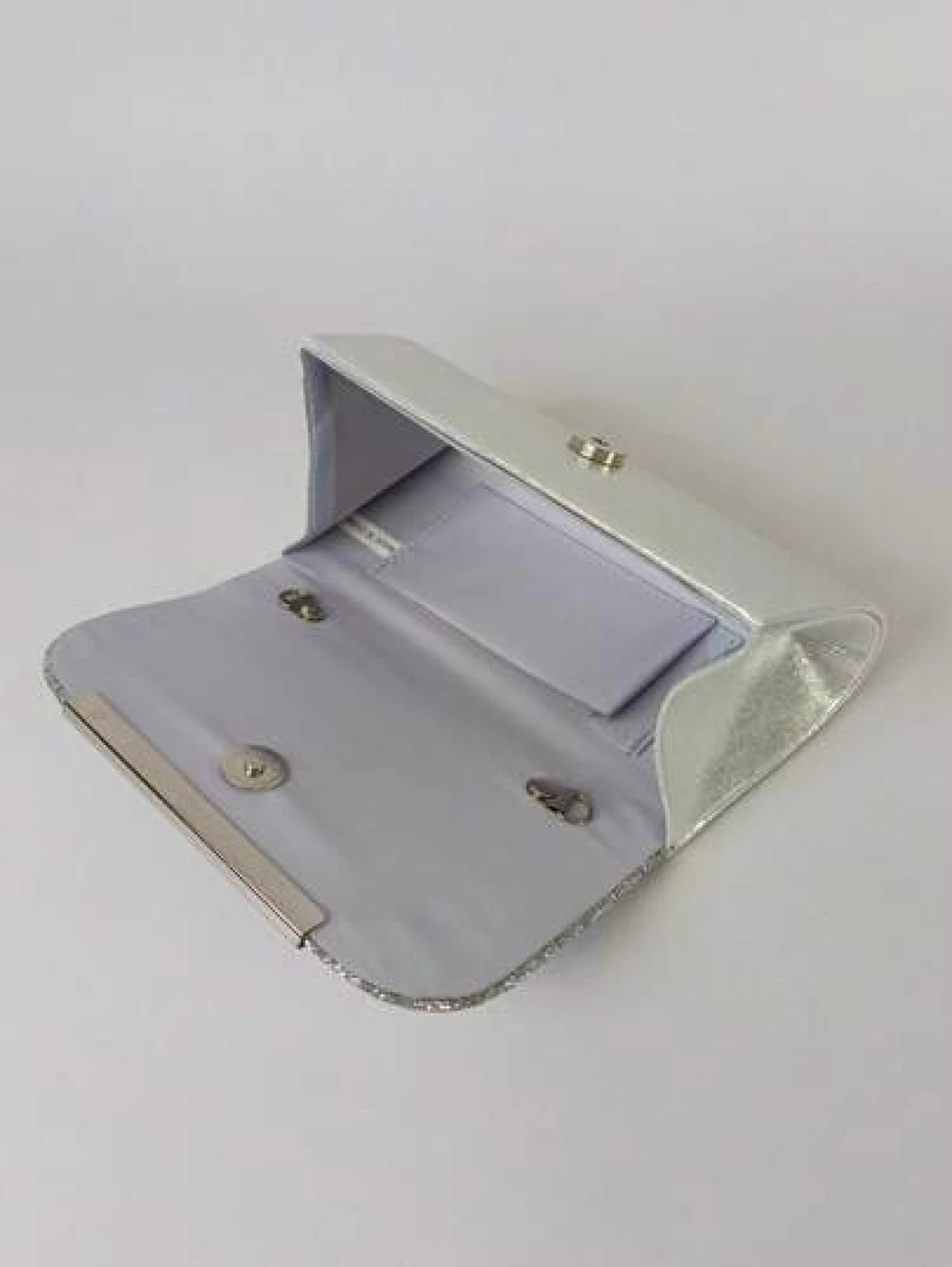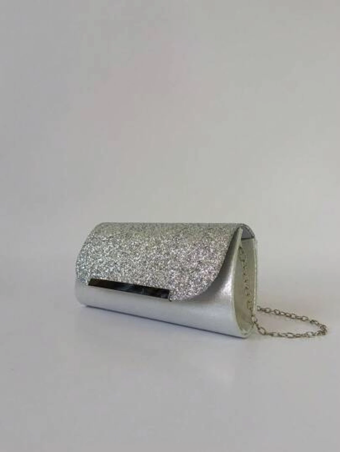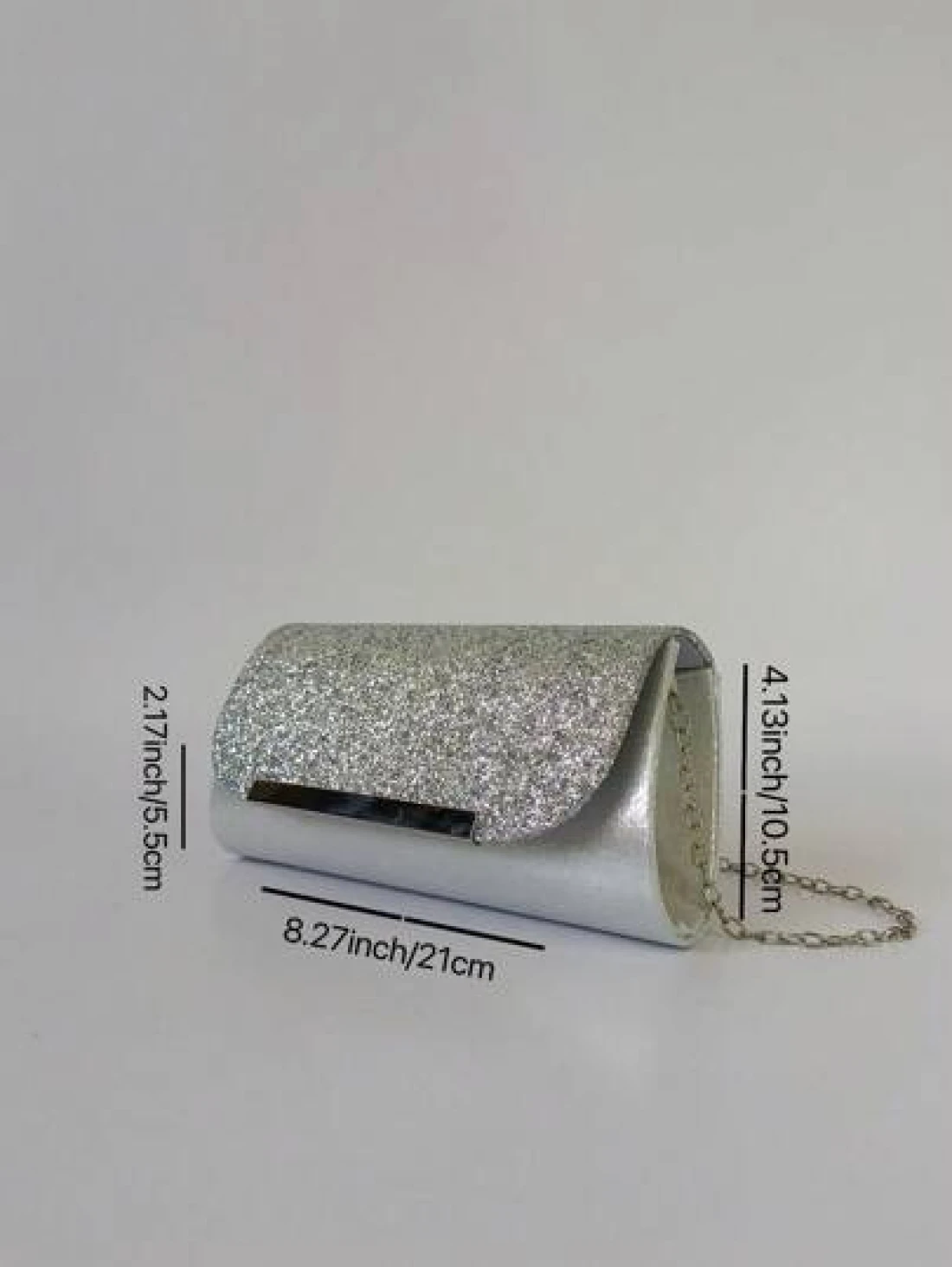 هذه الحقيبة المسائية تتميز بتصميم راق. الجسم الرئيسي مصنوع من الترتر الفضي اللامع الذي يتلألأ ويتوهج تحت الضو