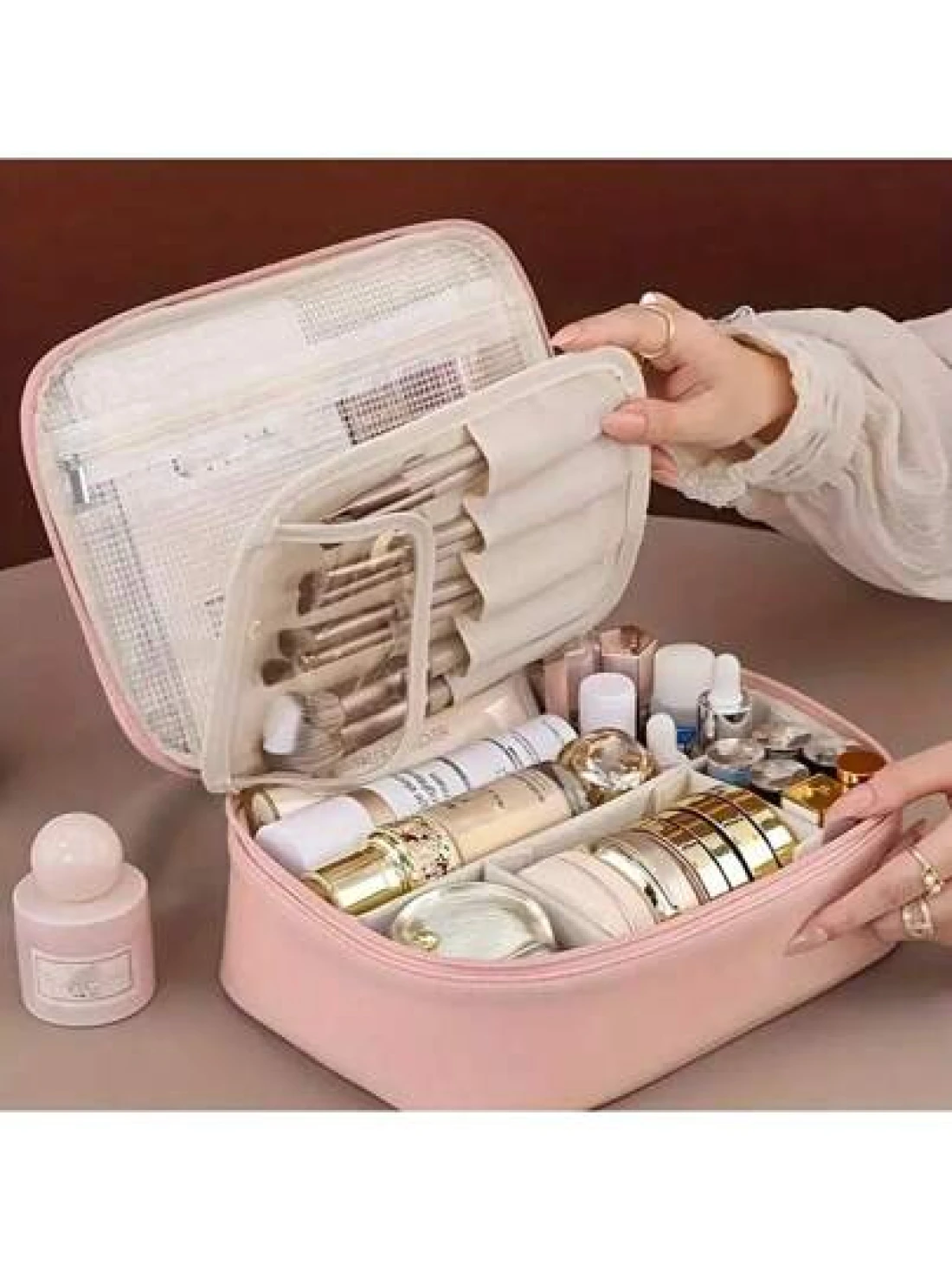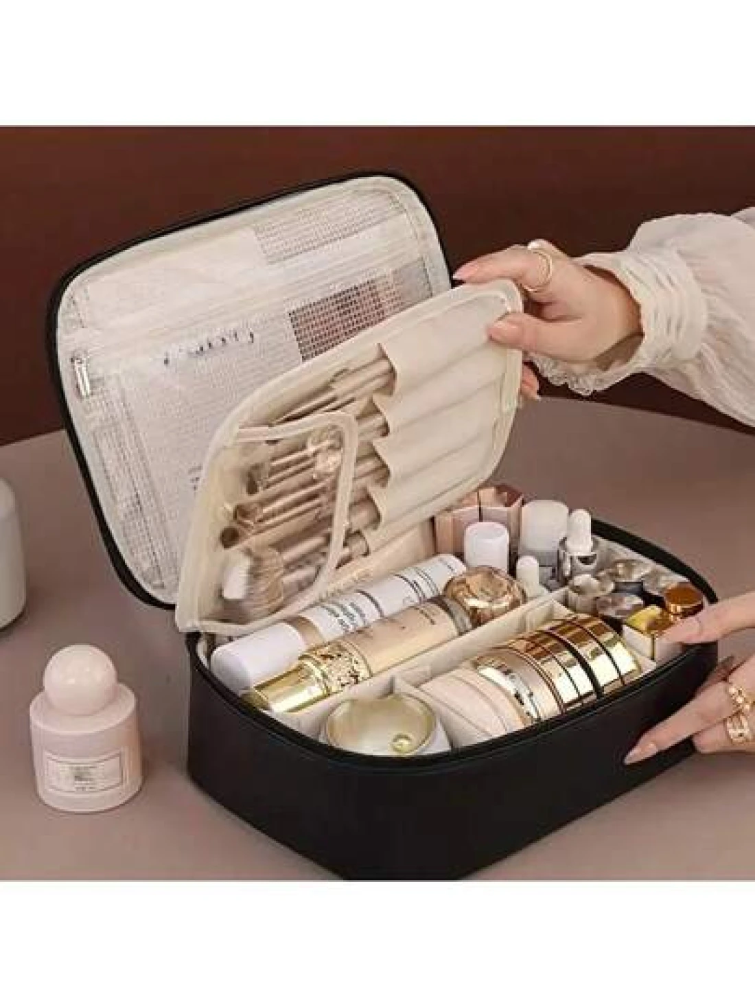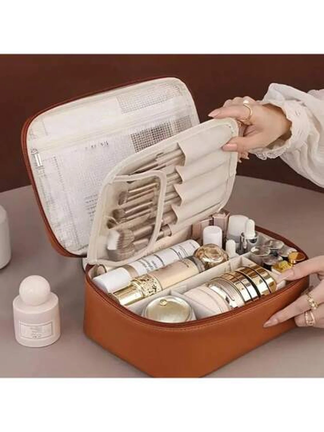 Multi Layer Large Capacity Removable Makeup Bag Faux Leather Travel Cosmetic Storage Box With Brush Holder Portable Unisex Beauty Essentials Case Non Alcoholic Cosmetics Organizer Solution Elegant Des