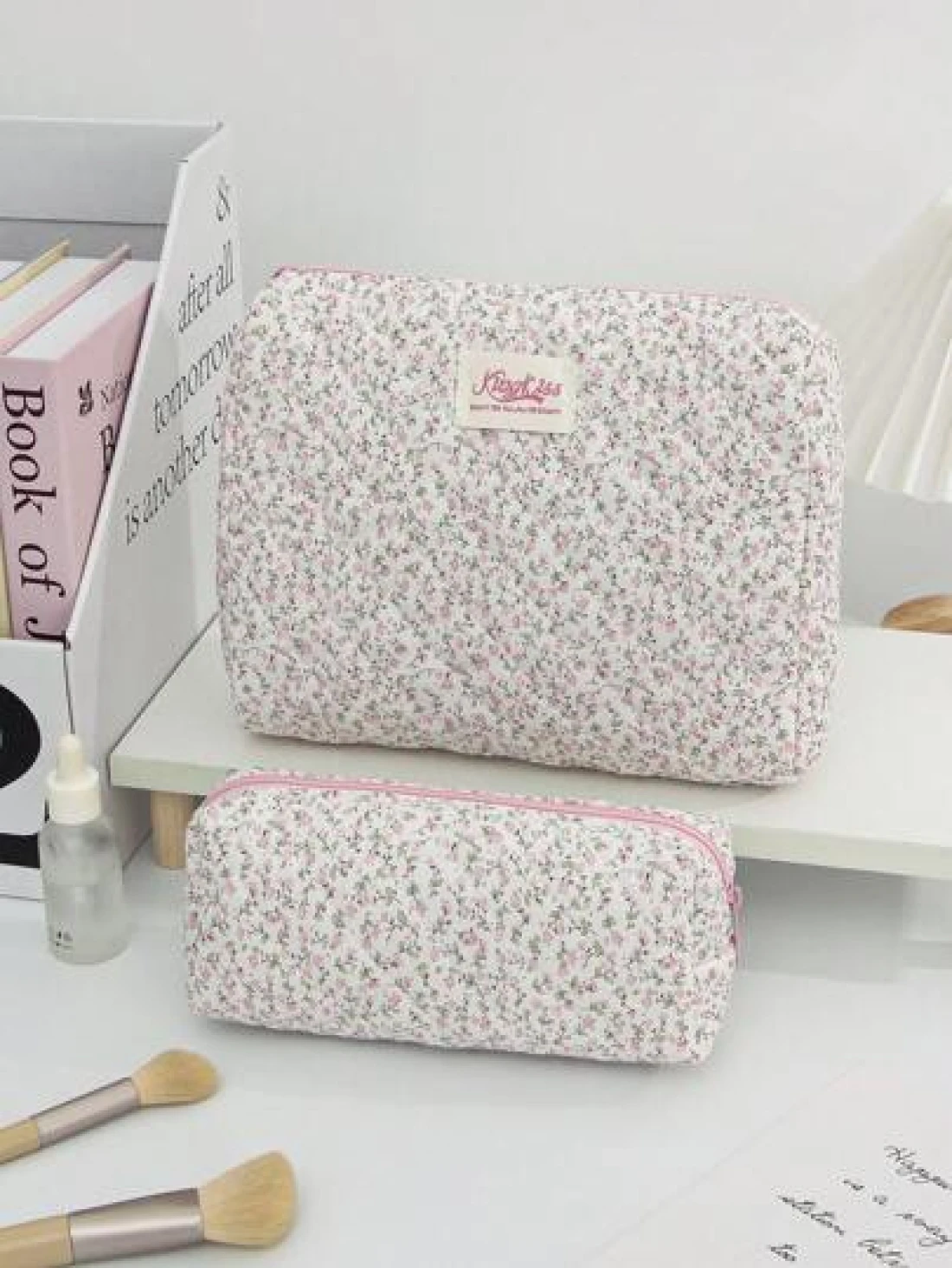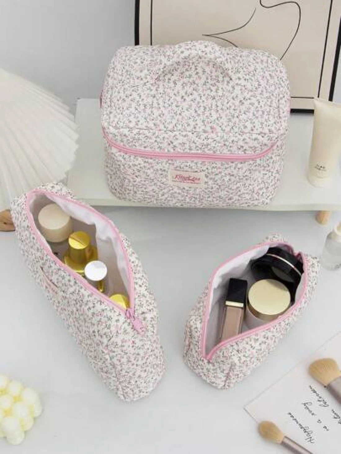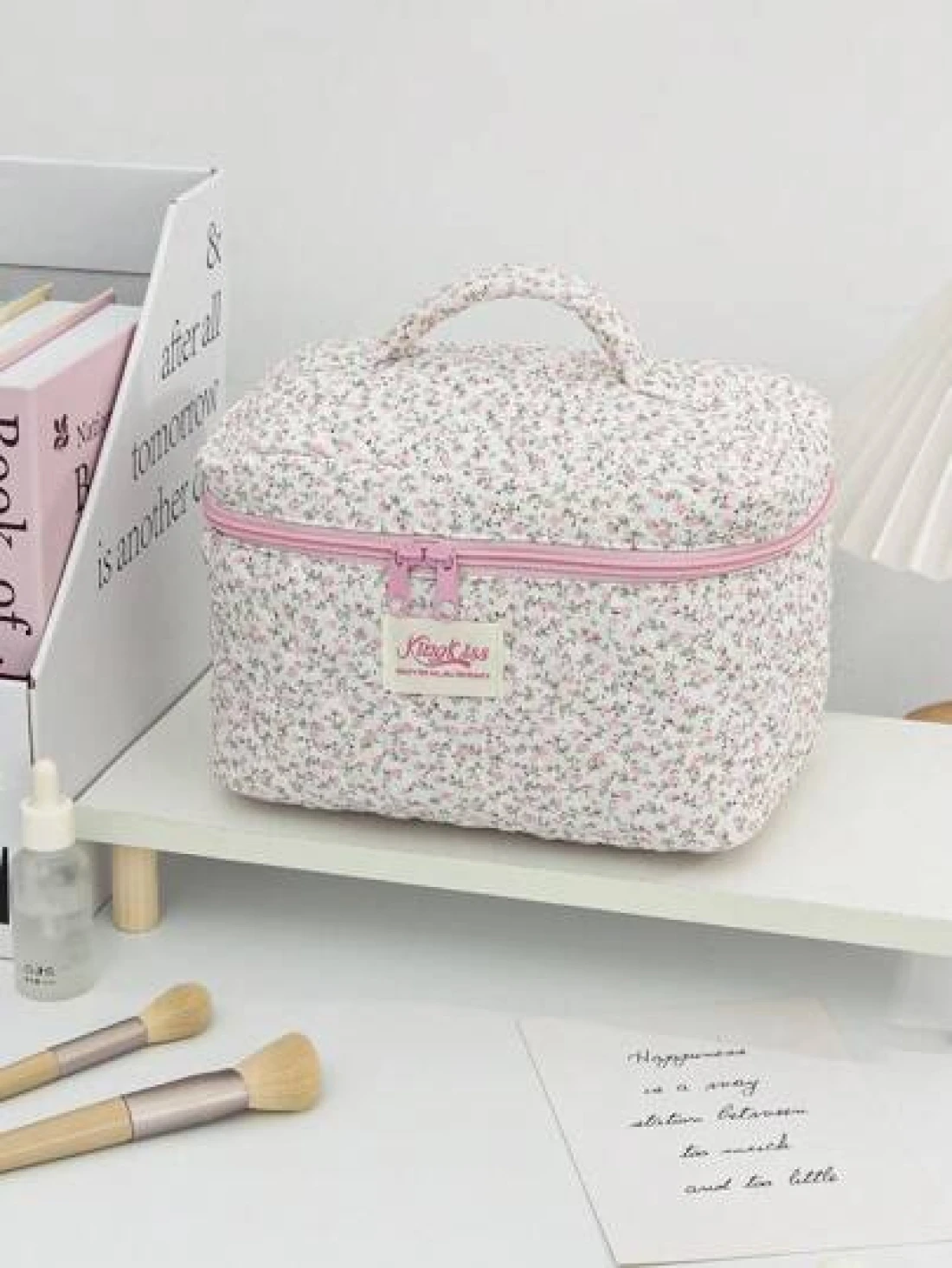 قطعة واحدة / مجموعة حقيبة مستحضرات تجميل وردية ذات طبعة زهور كبيرة السعة مبطنة مزودة بسحاب لحفظ أدوات التجميل
