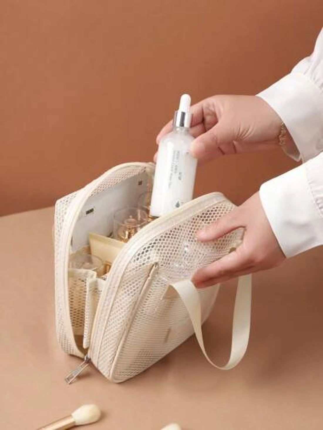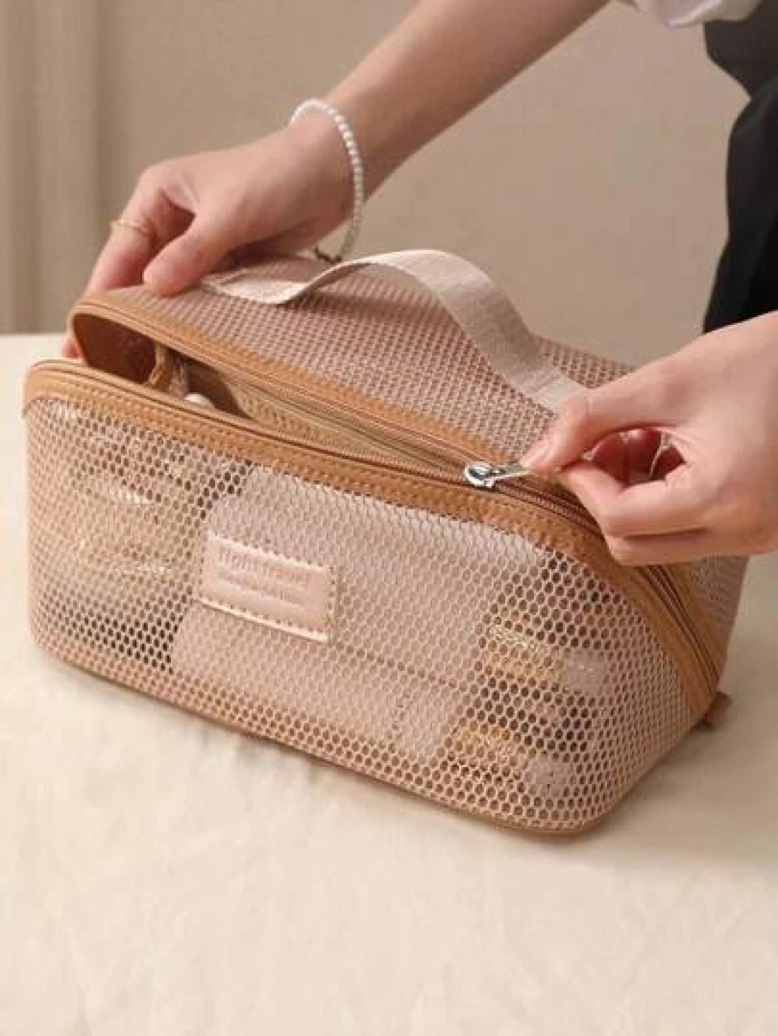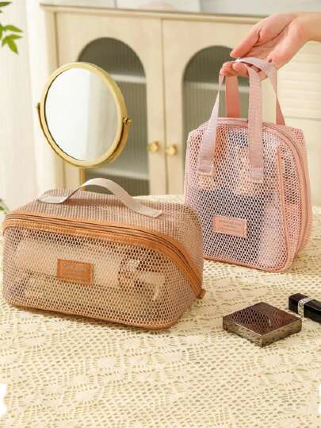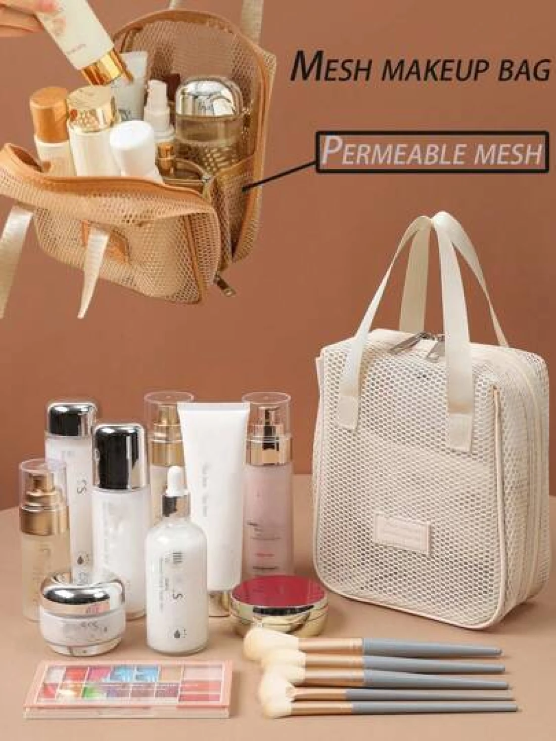 قطعة واحدة حقيبة مستحضرات التجميل للسفر والعطلات، سعة كبيرة من النايلون الشبكي، حقيبة مستحضرات تجميل متعددة