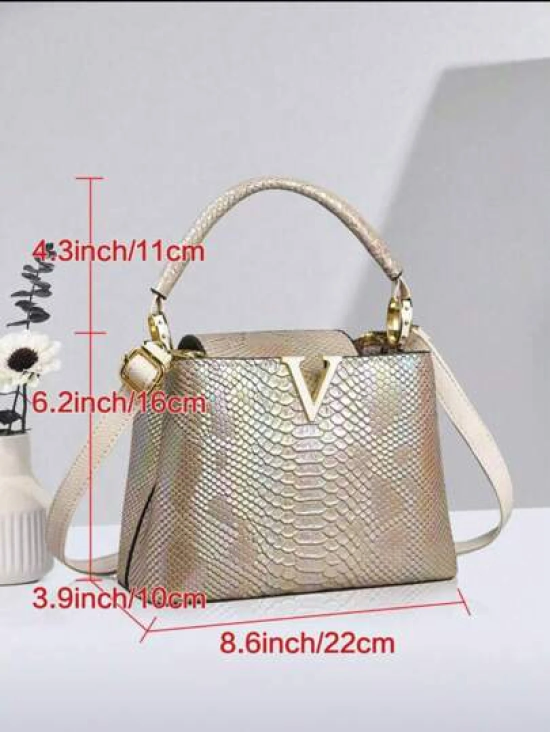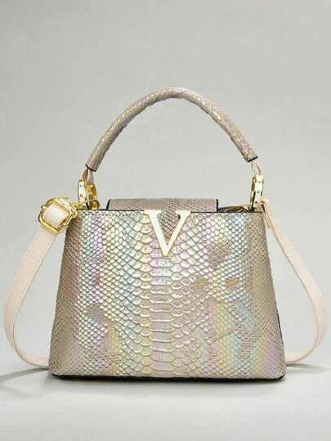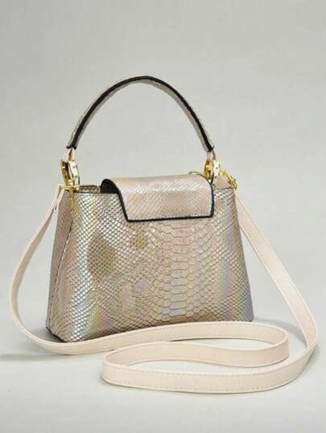 حقيبة يد أنيقة للسيدات من الجلد المزخرف بنمط الثعبان مع تصميم متعدد الطبقات ومكمّلات ذهبية، حقيبة كتف متعددة