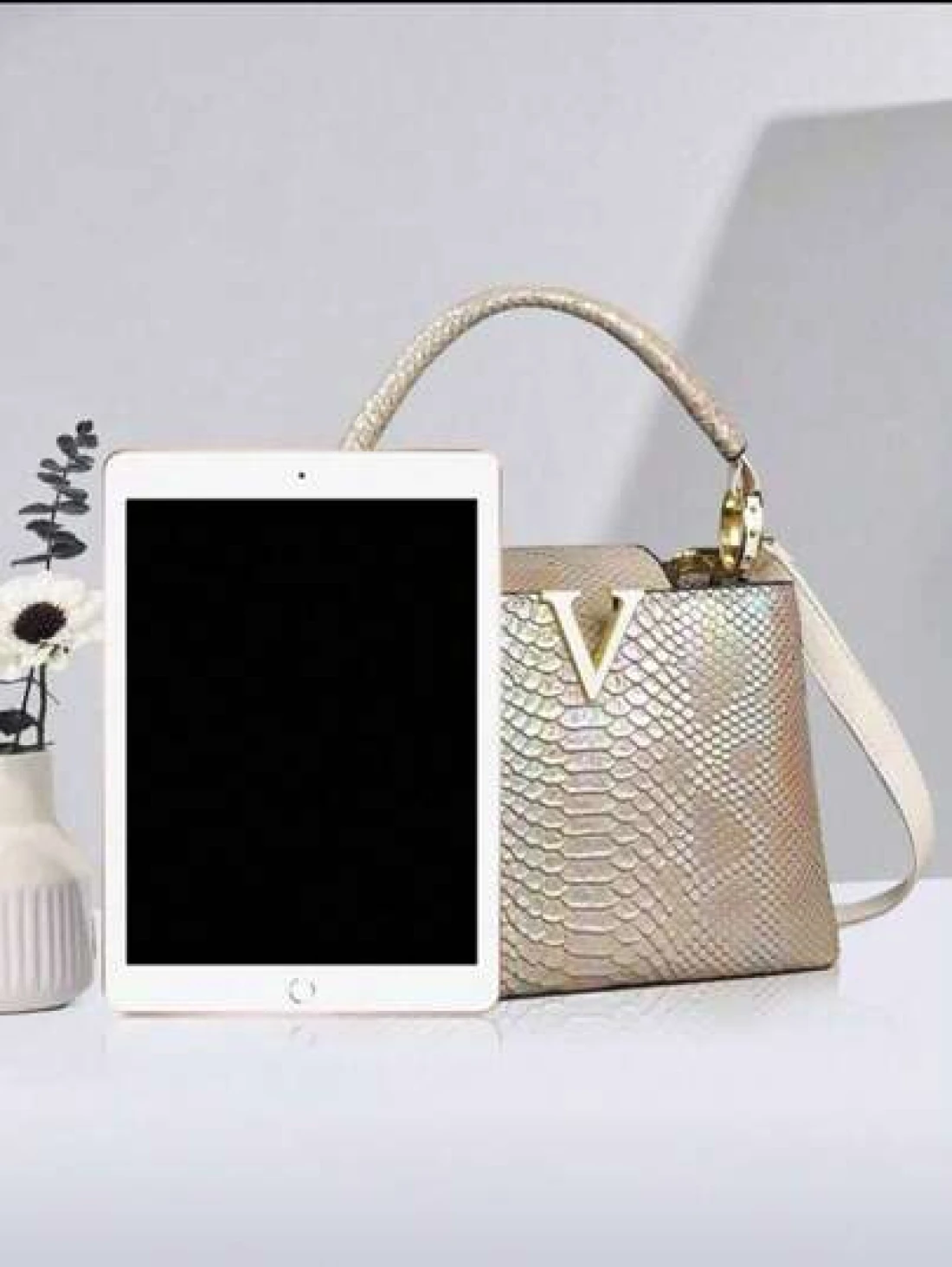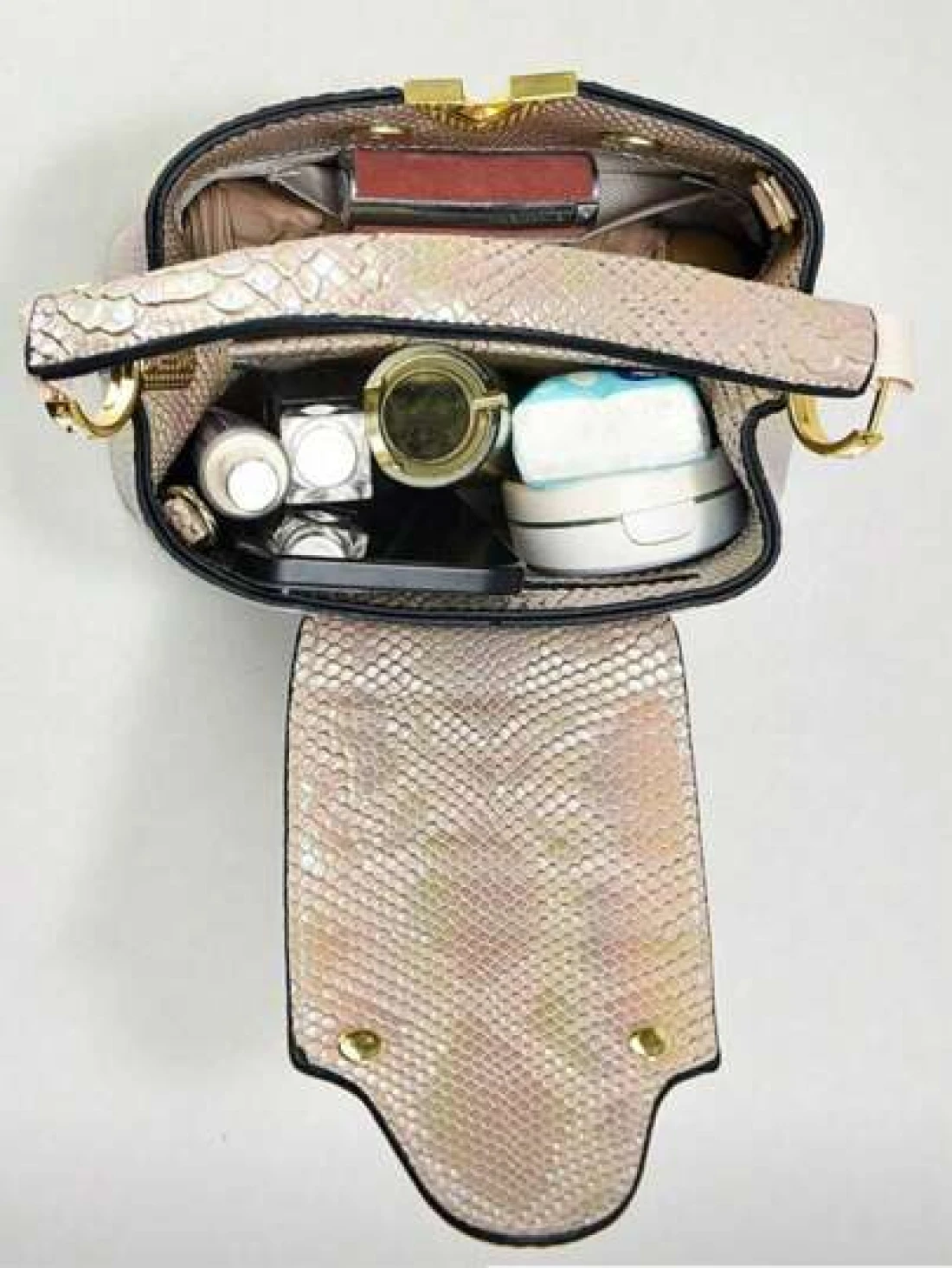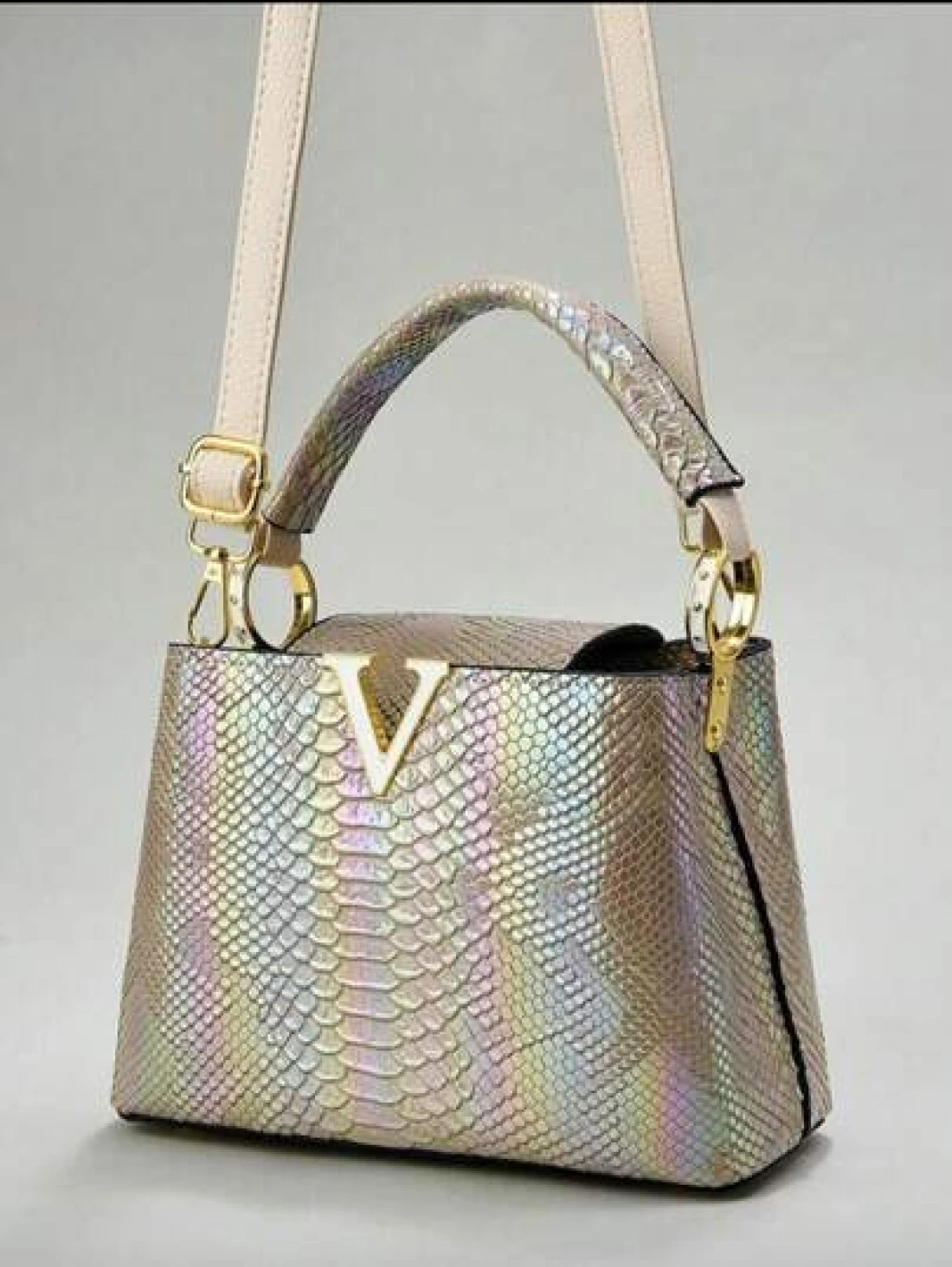 حقيبة يد أنيقة للسيدات من الجلد المزخرف بنمط الثعبان مع تصميم متعدد الطبقات ومكمّلات ذهبية، حقيبة كتف متعددة