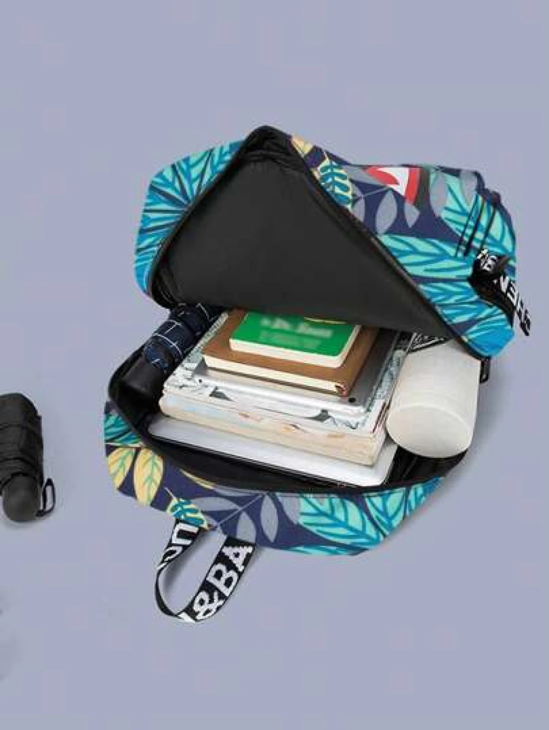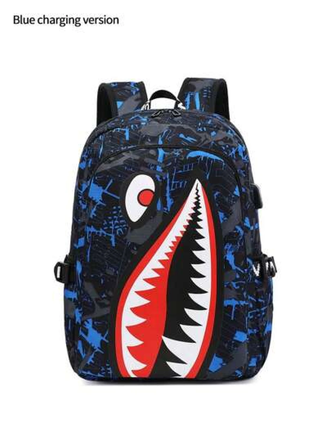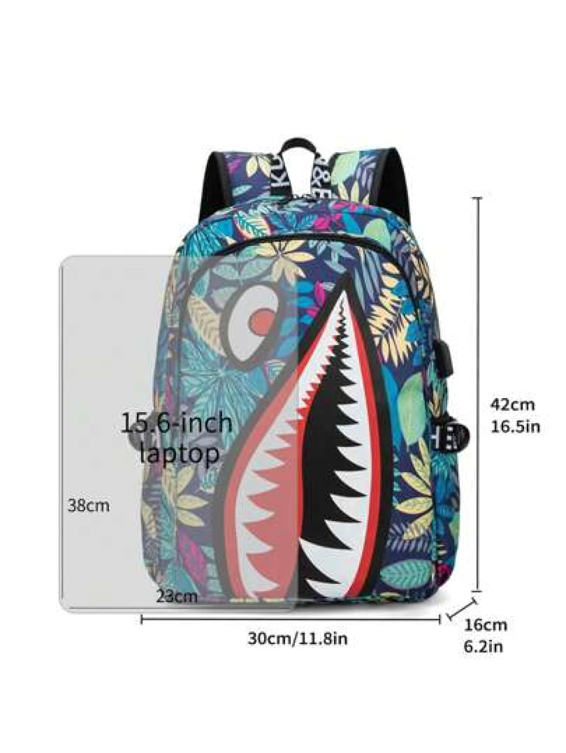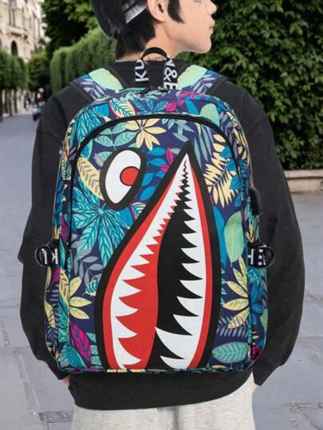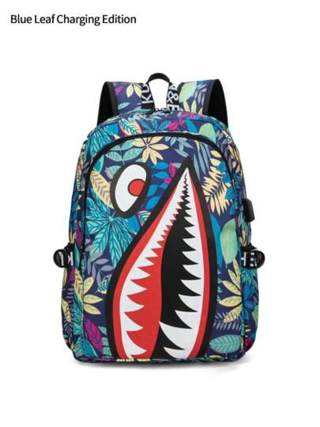 حقيبة ظهر وحقيبة كتف كبيرة من النايلون مقاومة للماء وخفيفة الوزن بتصميم جامعي، سعة كبيرة، تصلح لحمل كمبيوتر محمول حتى 14 بوصة، أشرطة قابلة للتعديل، هدية شخصية مميزة للأصدقاء الذكور، تصميم مشترك (جميع الأشرطة والحروف عشوائية) بطباعة فم سمكة مميز وألوان متباينة وطباعة أوراق