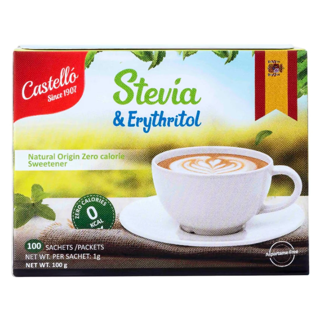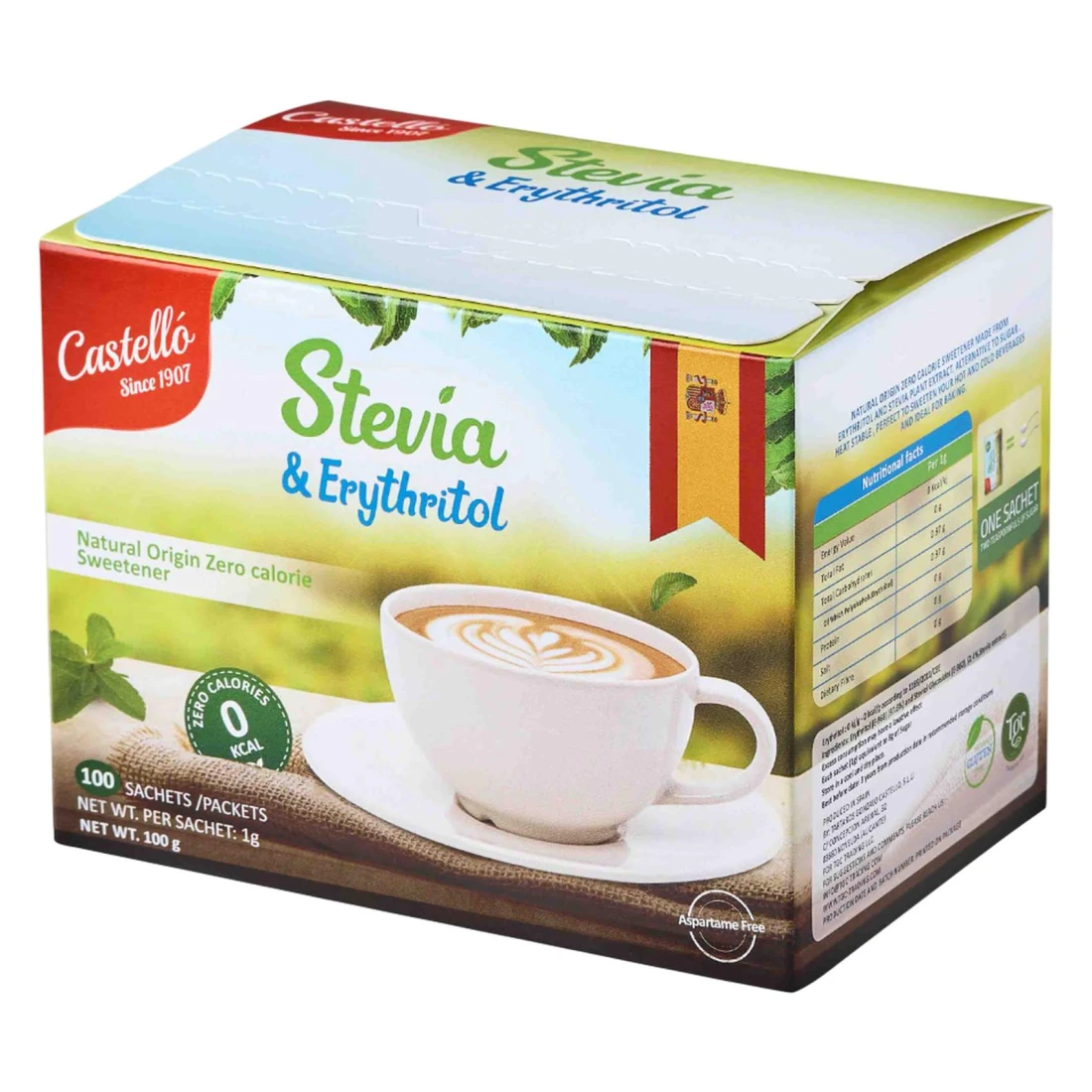 كاستيلو ستيفيا وإريثريتول، أكياس مُحلي طبيعي خالٍ من السعرات الحرارية، 100 غرام