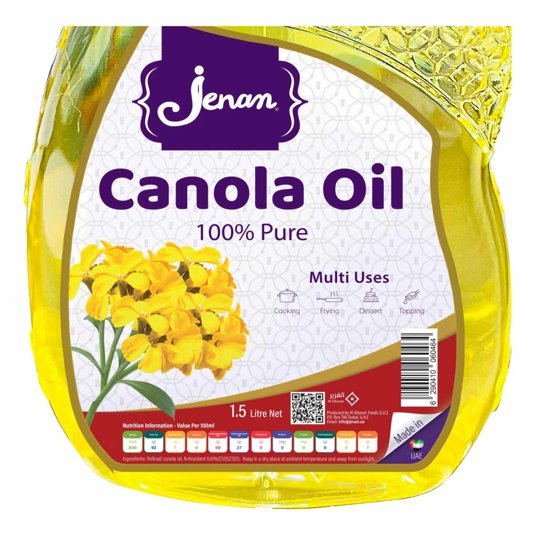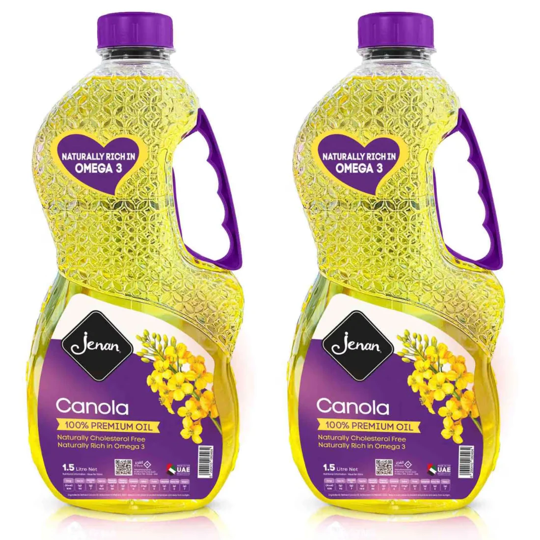 زيت الكانولا من جينان 1.5 لتر حزمة من 2 هو زيت طهي عالي الجودة مصنوع من بذور الكانولا. وهو غني بأحماض أوميغا 3 وأوميغا 6 الدهنية، مما يجعله خيارًا صحيًا للطهي اليومي. تحتوي هذه الحزمة على زجاجتين سعة كل منهما 1.5 لتر، مثالية للمنازل أو المطابخ التجارية.