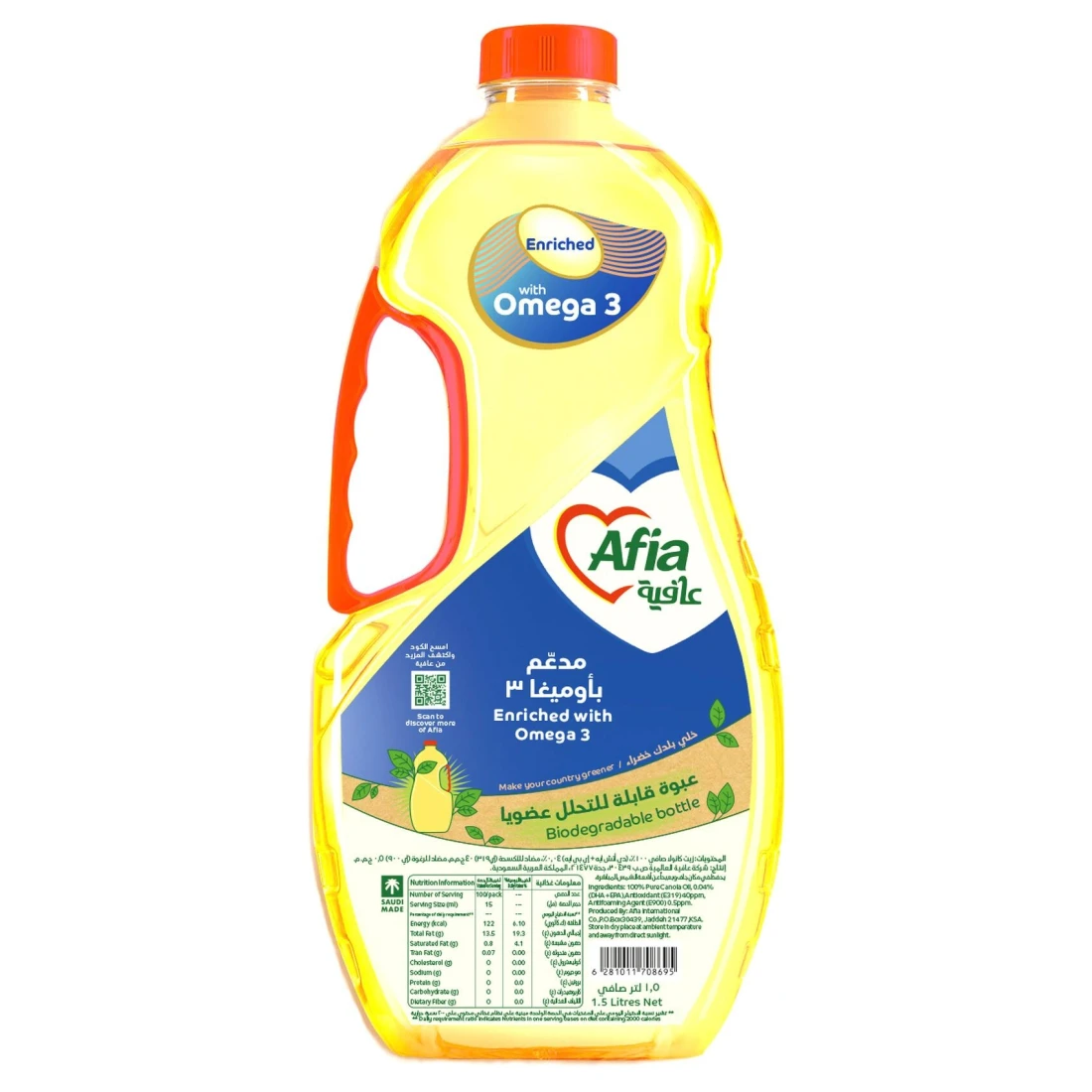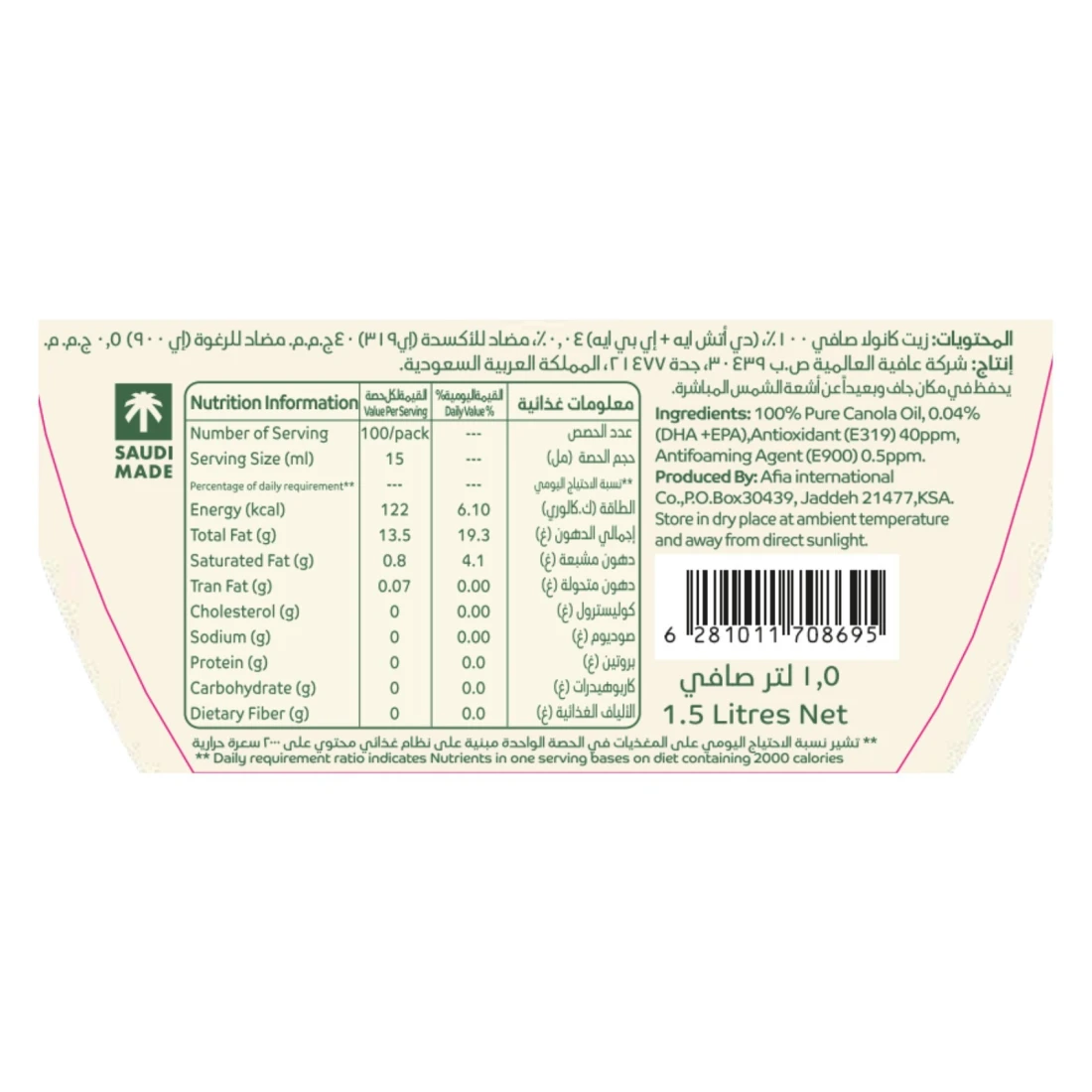 ingredients : 100% Pure Canola Oil, 0.04% (Dha +Epa), Antioxidant (E319) 40Ppm, Antifoaming Agent (E900) 0.5Ppm