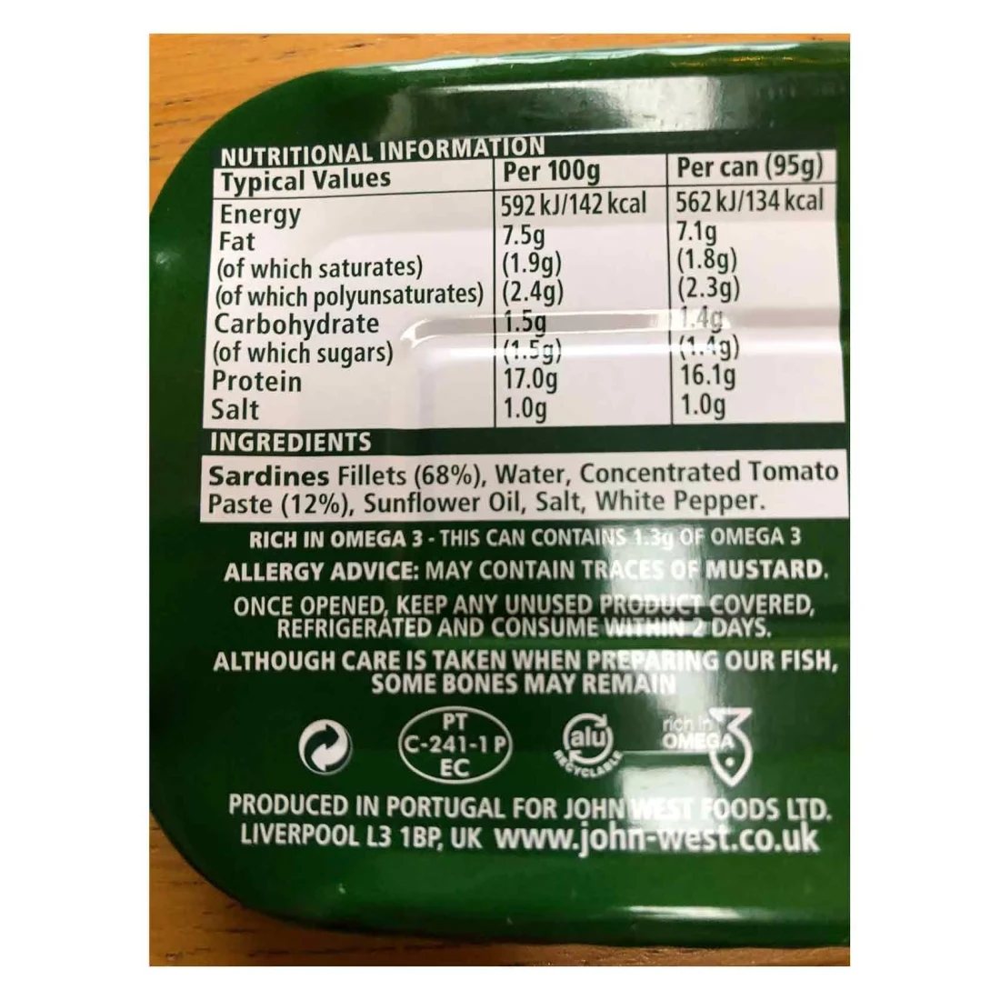 ingredients : فيليه السردين (68%) ، ماء ، معجون طماطم مركز (12%) ، زيت عباد الشمس ، ملح ، فلفل أبيض