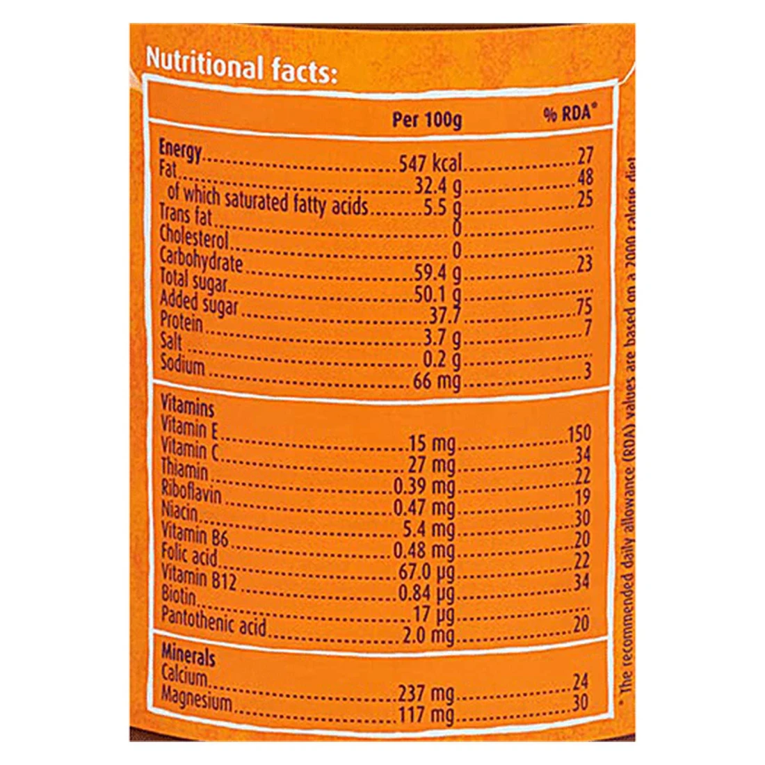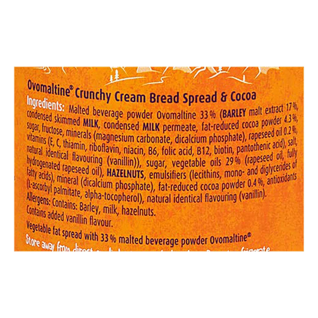 ingredients : مسحوق مشروب الشعير أوفومالتين 33% (مستخلص الشعير 174 حليب خالي الدسم مكثف، نفاذ الحليب المكثف، مسحوق الكاكاو قليل الدسم 43% سكريات، فركتوز، معادن (كربونات المغنيسيوم، فوسفات ثنائي الكالسيوم)، بذور اللفت 0.2% فيتامينات (هـ، ثيامين، ريبوفلافين، نياسين، 86، حمض الفوليك، 812، بيوتين، حمض البانتوثينيك المشبع، نكهة طبيعية مطابقة (فانيلين))، سكر، زيوت نباتية 29% (بذور اللفت من زيت بذور اللفت المهدرج بالكامل)، بندق، مستحلبات (ليسيثين، أحادي وثنائي الجليسريد من أي إضافات)، معدن (فوسفات ثنائي الكالسيوم)، مسحوق الكاكاو قليل الدسم 0.49%، مضادات الأكسدة أكوبيل بالميتات، ألفا توكوفيرول)، نكهة طبيعية متطابقة (فانيليا)