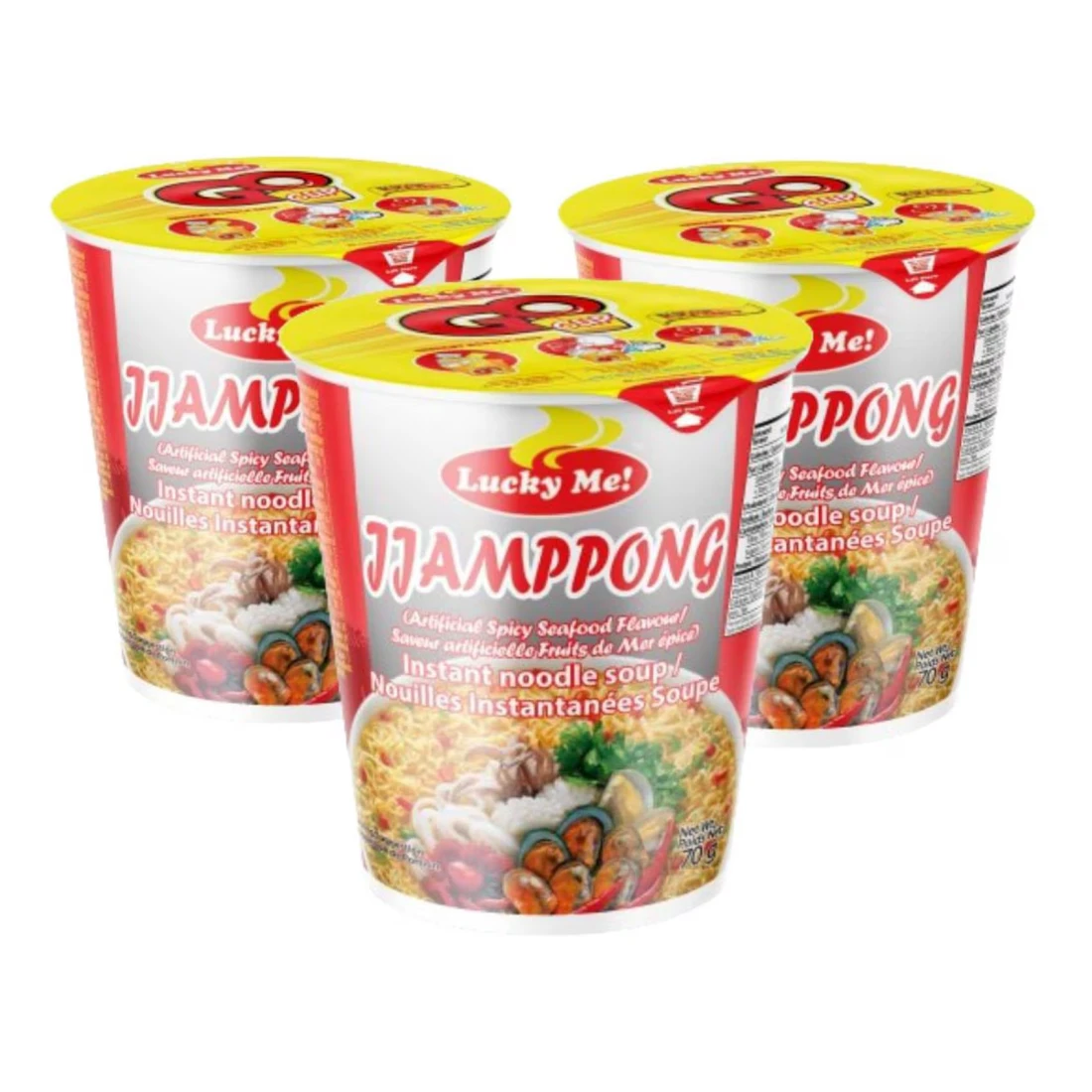شوربة المعكرونة الفورية لاكي مي ججامبونغ هي شوربة معكرونة فورية شهيرة على الطريقة الكورية. تحتوي هذه الحزمة على 3 حصص فردية بوزن 70 غرام من المعكرونة الغنية والمتبلة جيداً، مثالية لوجبة سريعة ولذيذة. فقط أضف الماء الساخن واستمتع بوعاء مشبع من معكرونة ججامبونغ في دقائق.