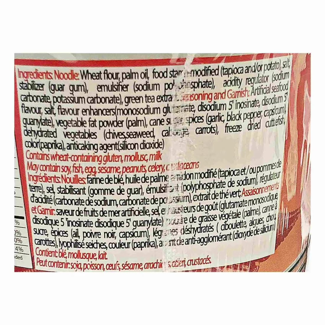 ingredients : نودلز: دقيق قمح، زيت نخيل، نشا غذائي معدل (تابيوكا و/أو بطاطا)، ملح، مثبت (صمغ الغوار)، مستحلب (فوسفات الصوديوم)، منظم حموضة (كربونات الصوديوم، كربونات البوتاسيوم)، مستخلص الشاي الأخضر، توابل وتزيين: نكهة المأكولات البحرية الاصطناعية، ملح، معززات النكهة (غلوتمات أحادي الصوديوم، إينوزينات ثنائي الصوديوم، غوانيلات ثنائي الصوديوم)، مسحوق دهن نباتي (نخيل)، سكر القصب، بهارات (ثوم، فلفل أسود، فليفلة)، خضروات مجففة (ثوم، أعشاب بحرية، ملفوف، جزر)، حبار مجفف بالتجميد، لون (فلفل حلو) وعامل مضاد للتكتل (ثاني أكسيد السيليكون)