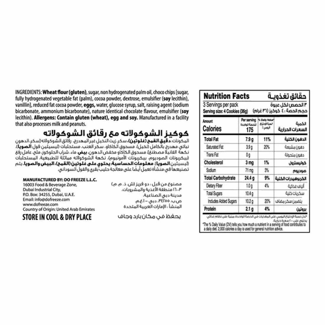 ingredients : دقيق القمح (الغلوتين)، سكر، زيت النخيل غير المهدرج، رقائق الشوكولاته [سكر، دهون نباتية مهدرجة بالكامل (زيت النخيل)، مسحوق الكاكاو، دكستروز، مستحلب (ليسيثين الصويا)، فانيلين]، مسحوق الكاكاو قليل الدسم، بيض، ماء، شراب الغلوكوز، ملح، عامل رفع (بيكربونات الصوديوم، بيكربونات الأمونيوم)، نكهة شوكولاته طبيعية مطابقة، مستحلب (ليسيثين الصويا).
