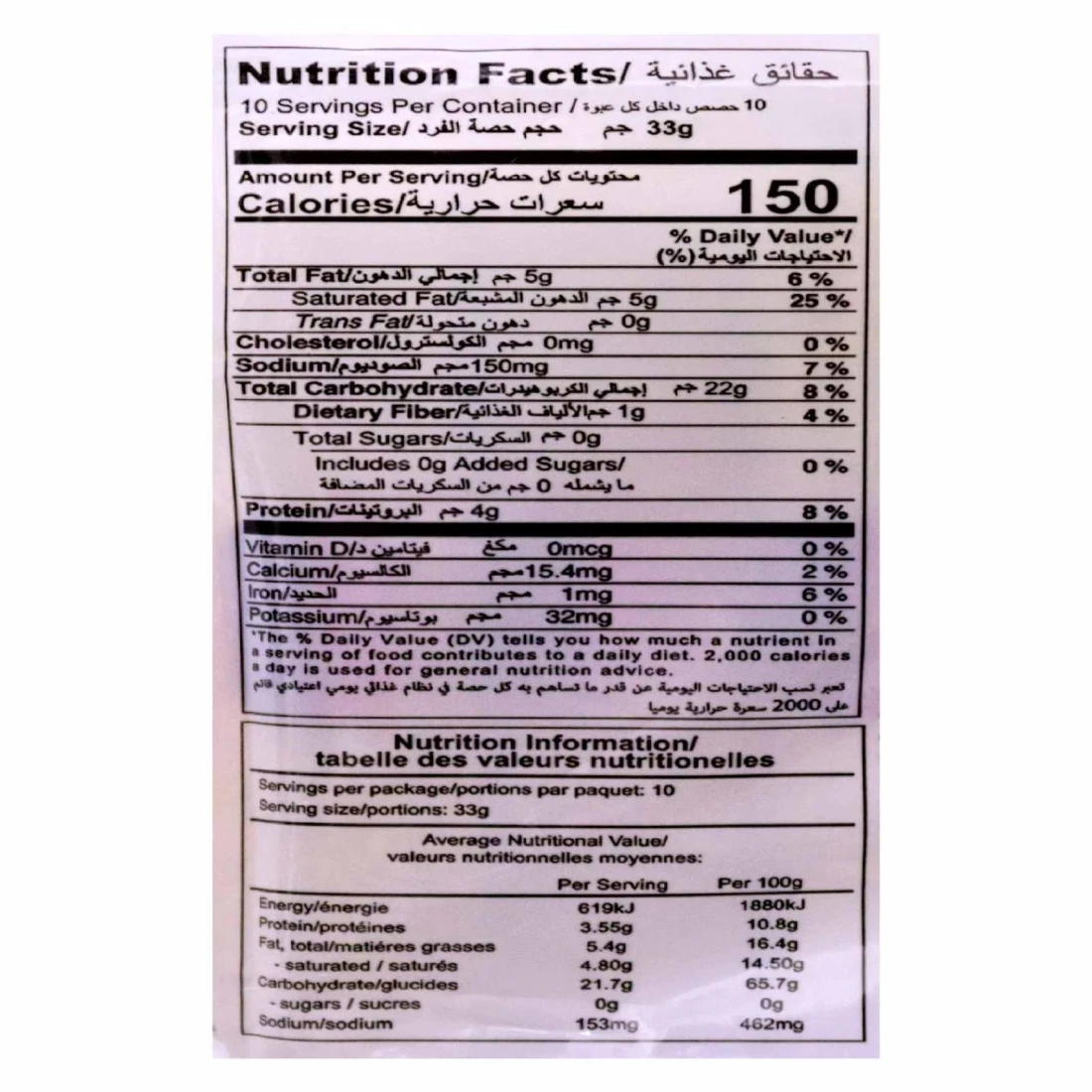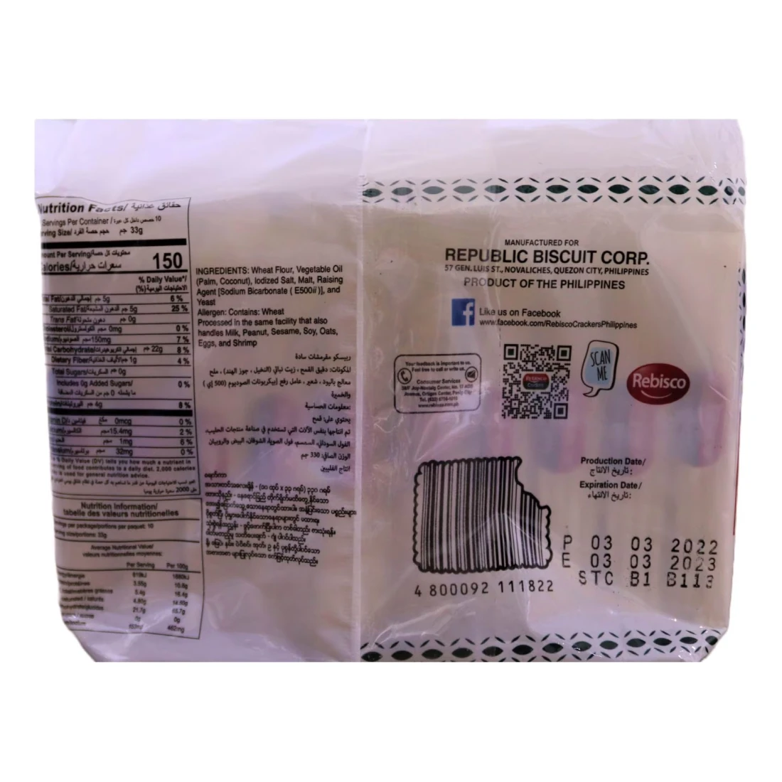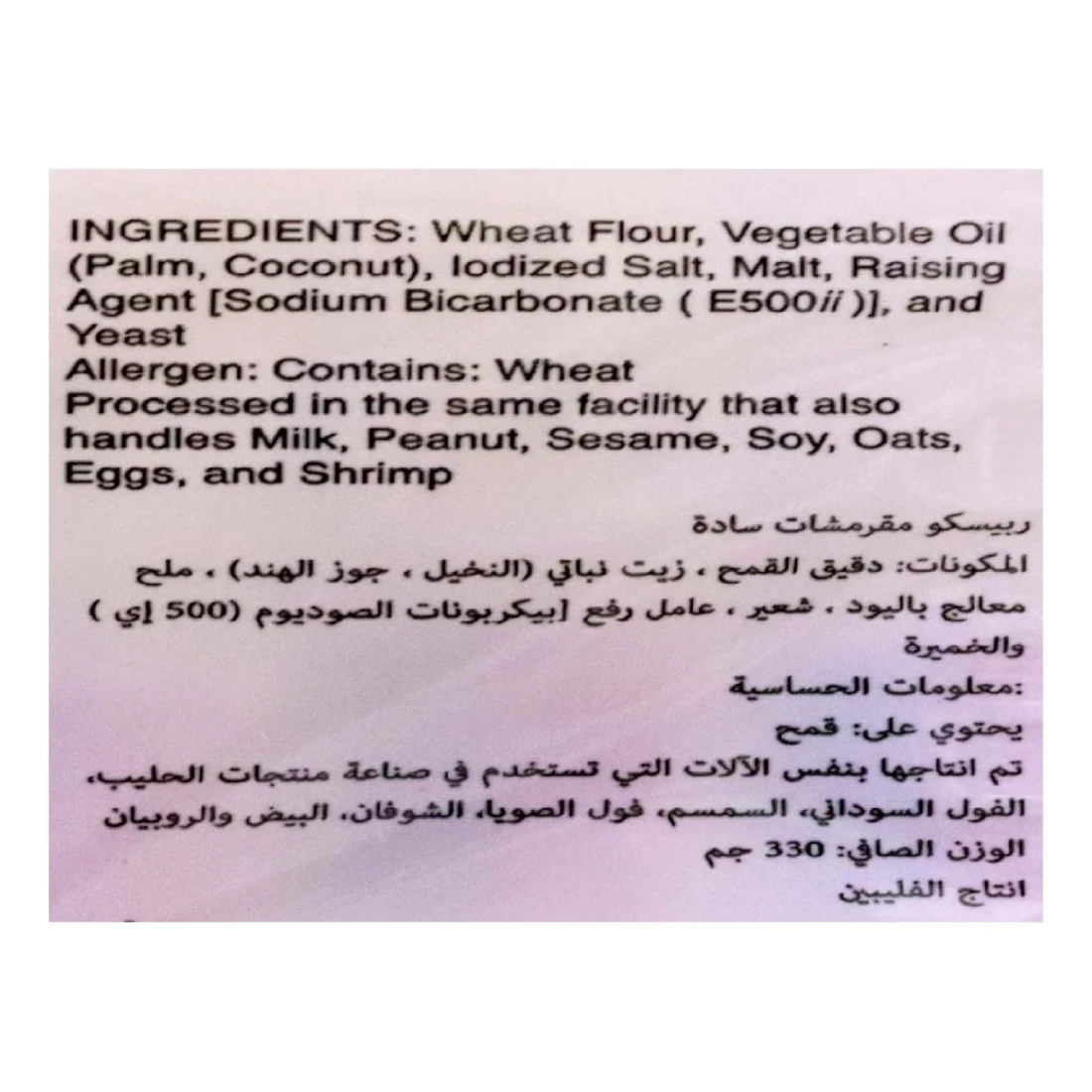 ingredients : دقيق غني غير مبيض (دقيق القمح ، نياسين ، حديد مخفض ، أحادي نترات الثيامين [فيتامين B1] ، ريبوفلافين [فيتامين B2] ، حمض الفوليك) ، دقيق القمح الكامل ، زيت فول الصويا ، سكر محول ، ملح البحر ، سكر ، ملح ، دقيق الشعير المملح ، صودا الخبز ، خميرة