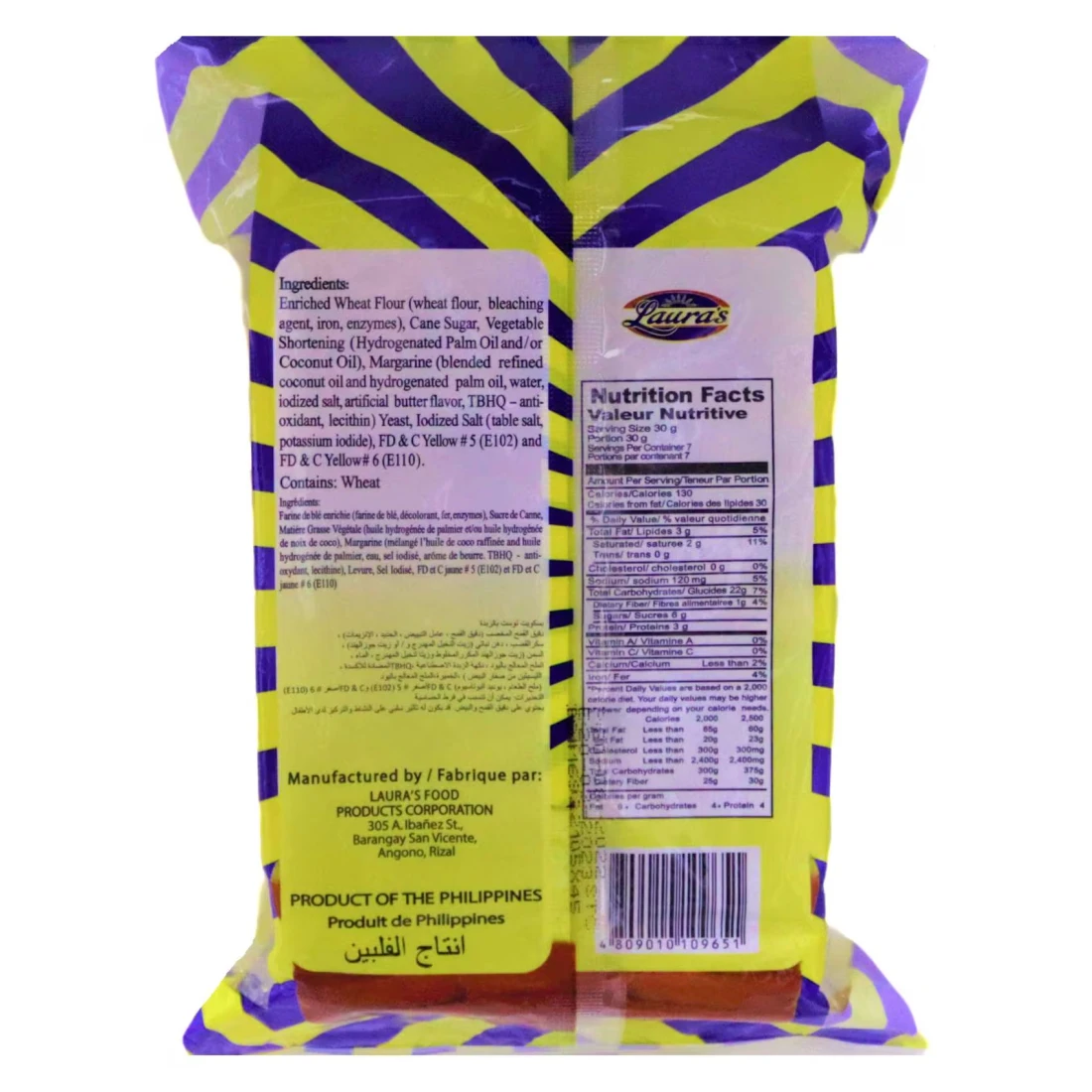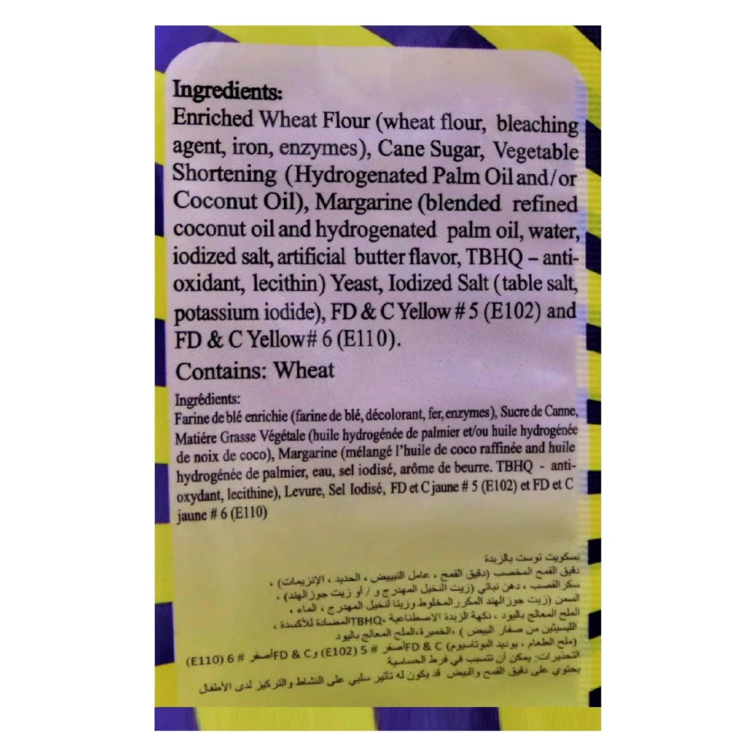 ingredients : دقيق قمح مدعم (47%) (دقيق قمح، نياسين، حديد، ثيامين، لون: ريبوفلافين)، سكر، سمن نباتي (زيت نخيل وجوز هند مهدرج جزئيًا)، سمن نباتي (4%) (زيت جوز الهند، زيت نخيل، ماء، ملح، مستحلب E471، نكهات، لون بيتا كاروتين)، خميرة، ملح معالج باليود (ملح، يود)