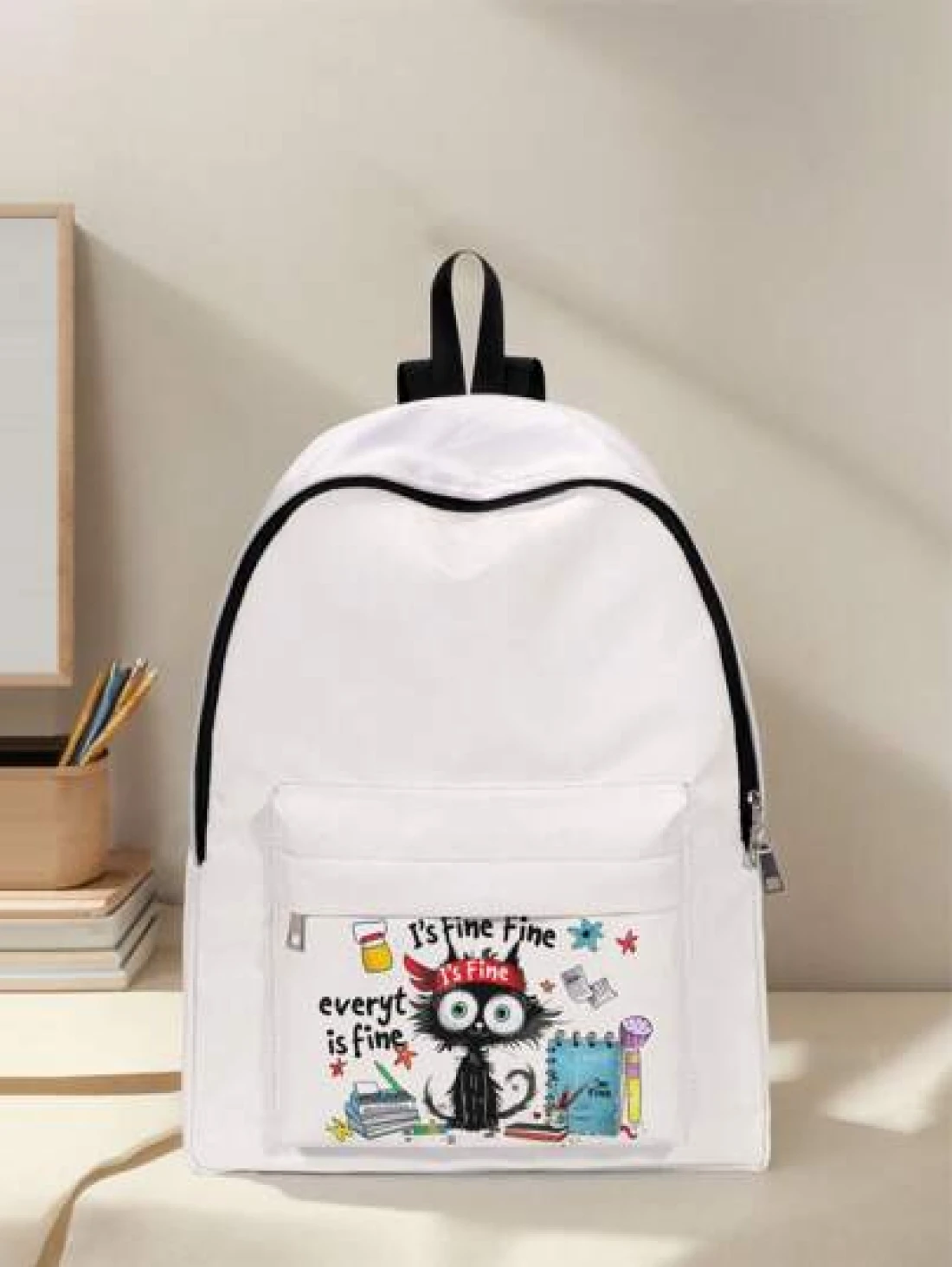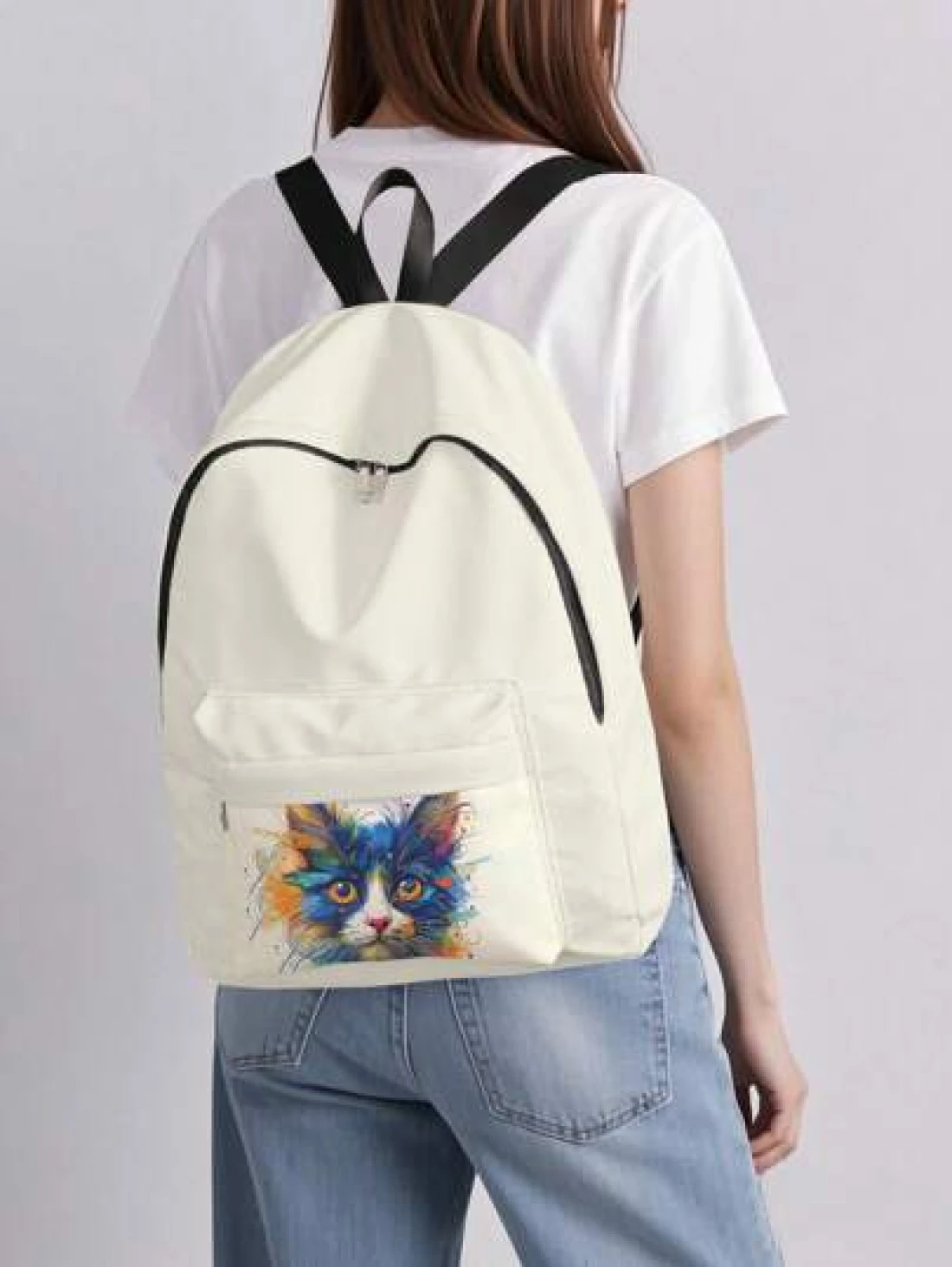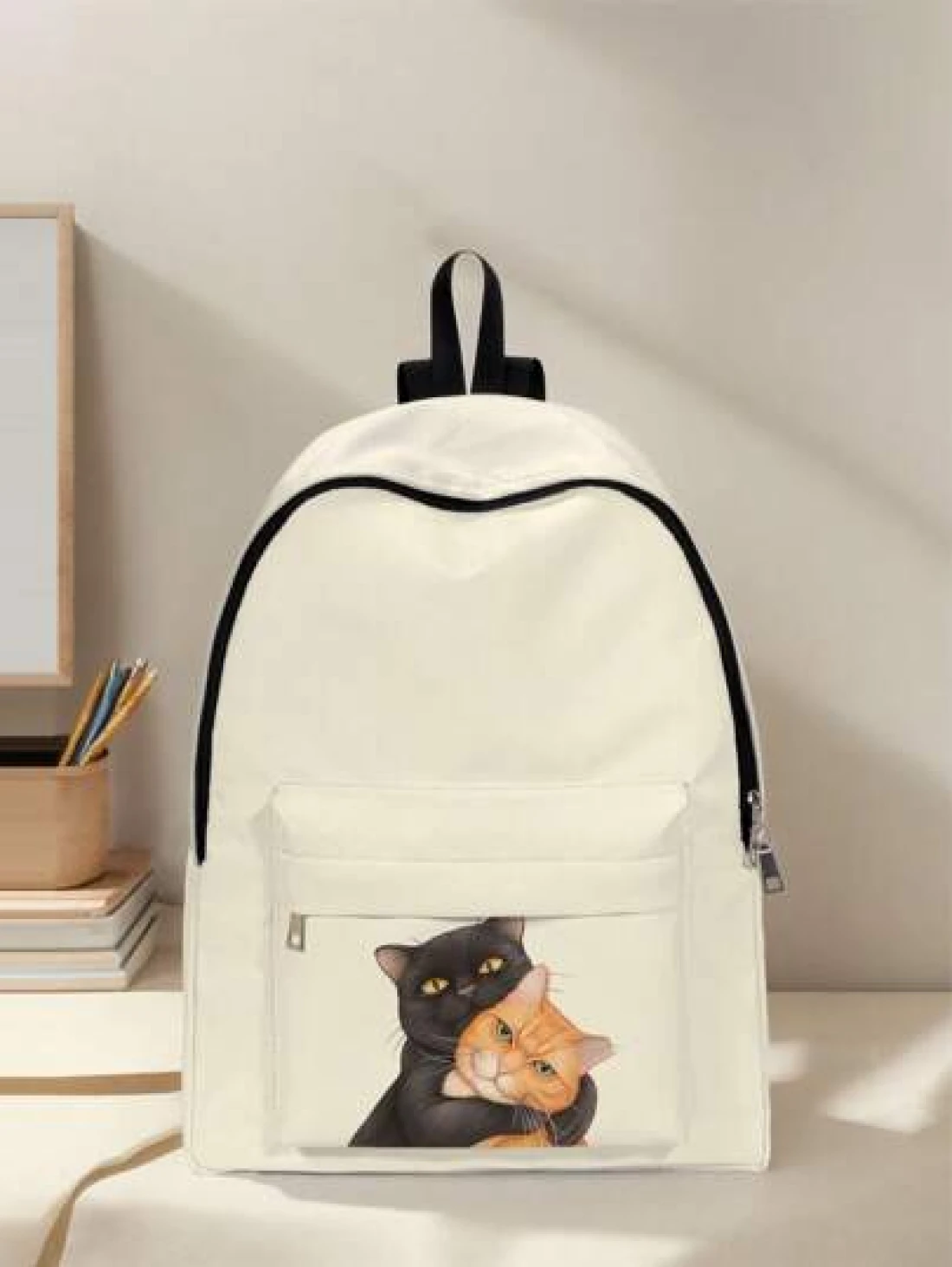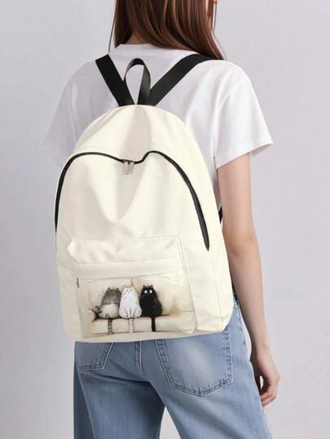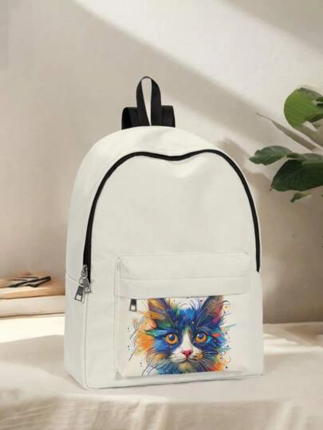 قطعة واحدة حقيبة ظهر صغيرة مطبوع عليها قطة كيوت، مزودة بسحاب إغلاق، جيوب، حقيبة ظهر عصرية للأولاد والبنات، مناسبة للمدرسة والأنشطة الخارجية