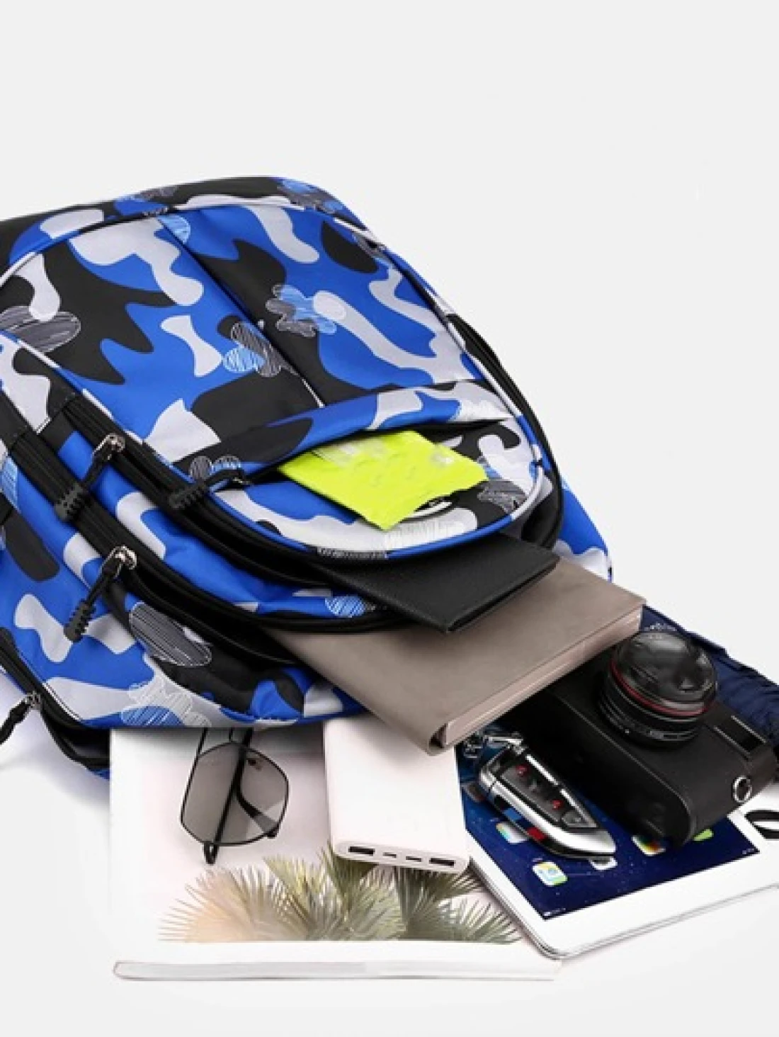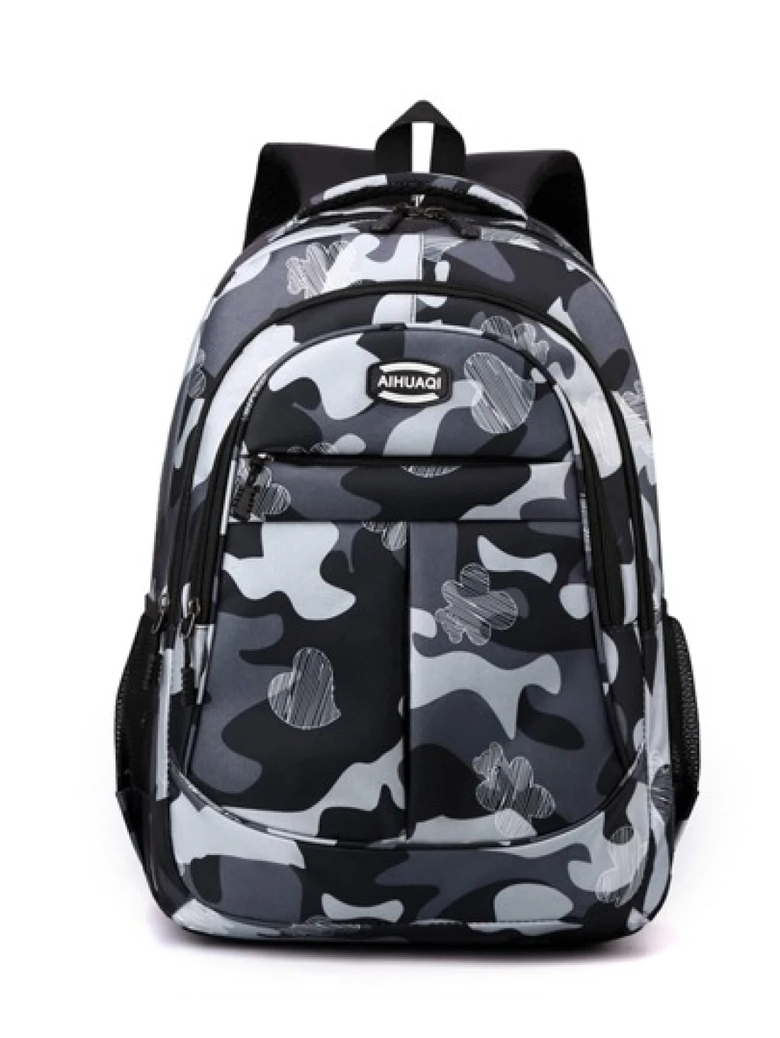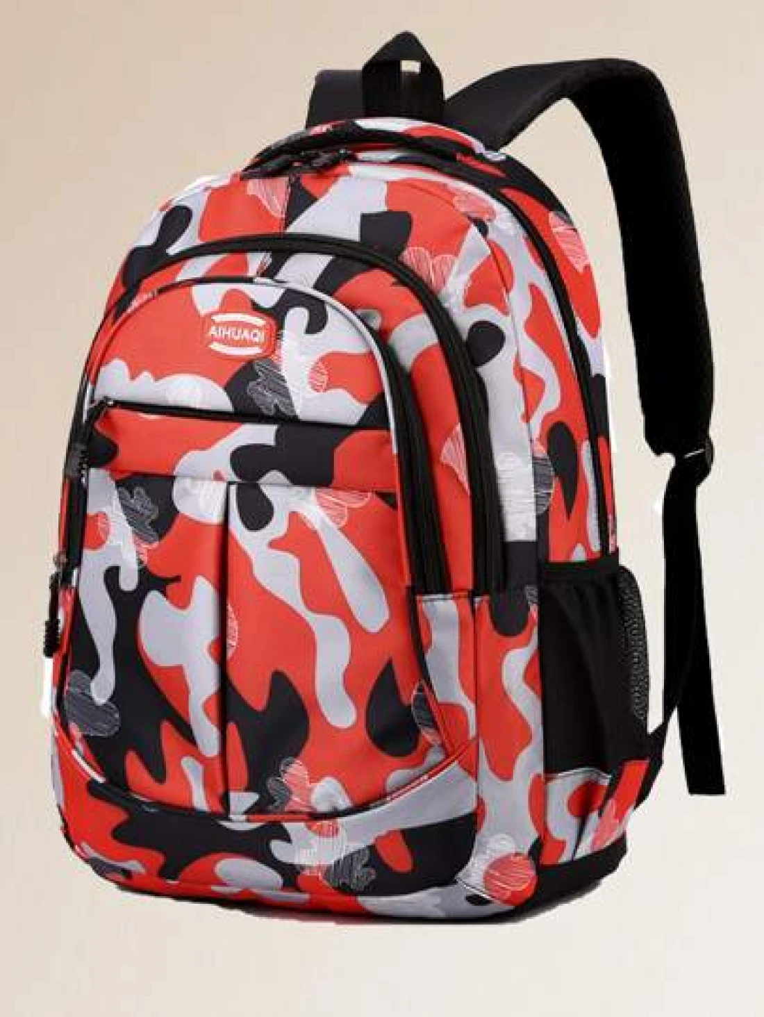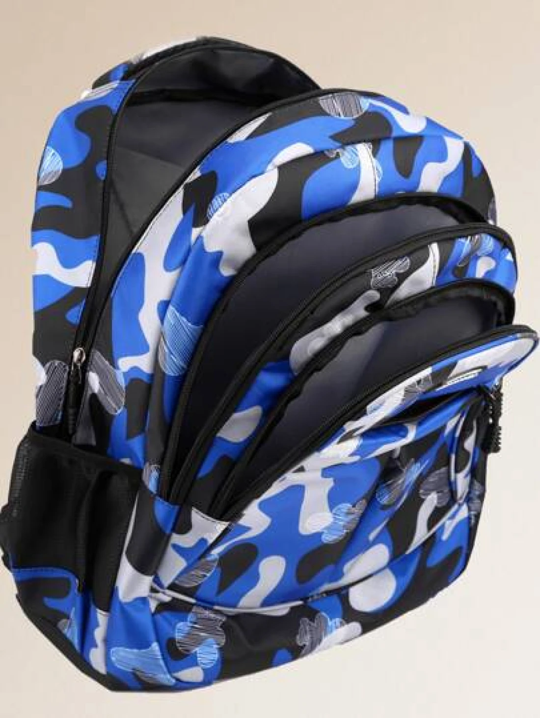 حقيبة ظهر أساسية للأولاد في موسم المدرسة، بتصميم بألوان الكامفلاج. متوفرة بأربعة ألوان: أسود وأزرق وأحمر وأخض