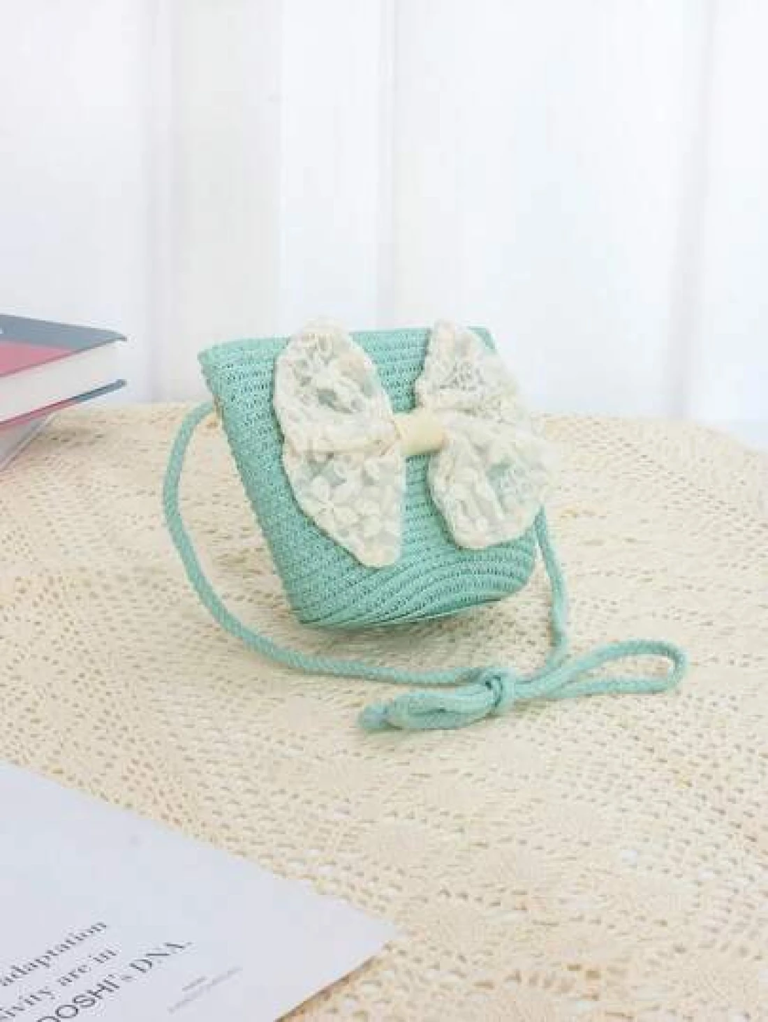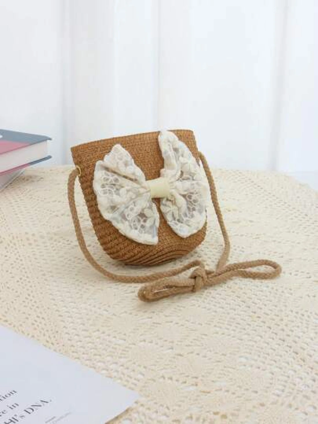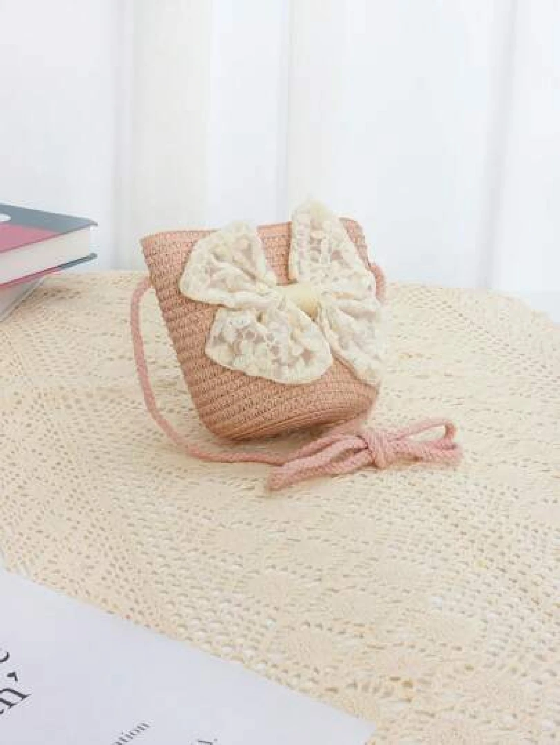 حقيبة كتف للأطفال بشكل أميرة مزينة بفيونكة شريطية وقش ،مناسبة للخروجات اليومية، قطعة واحدة