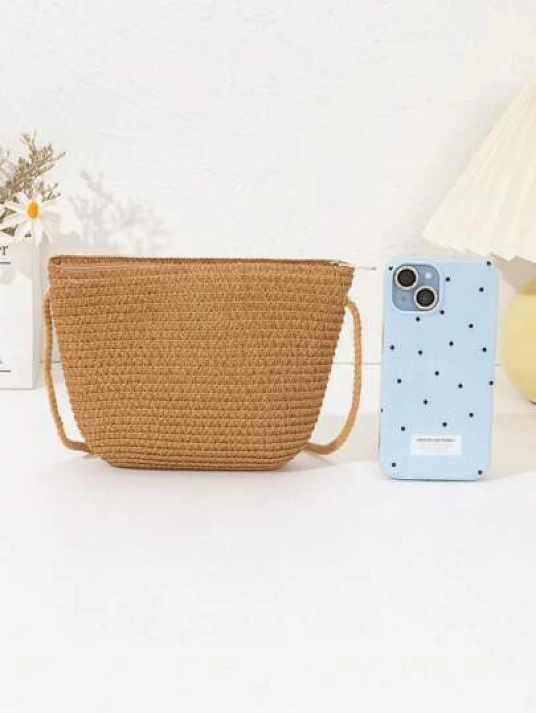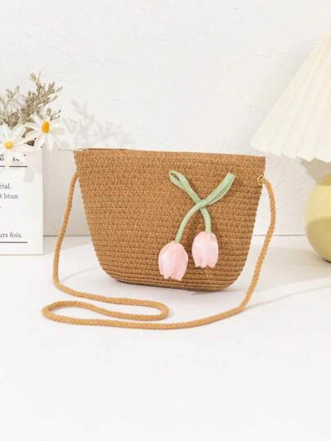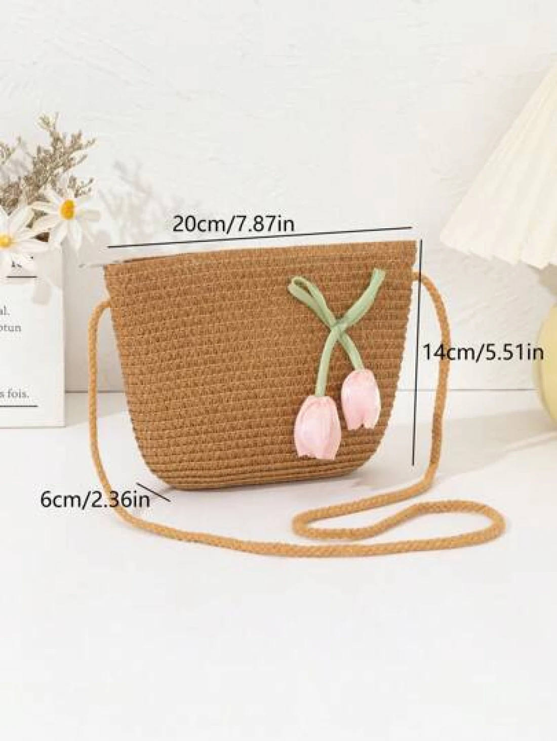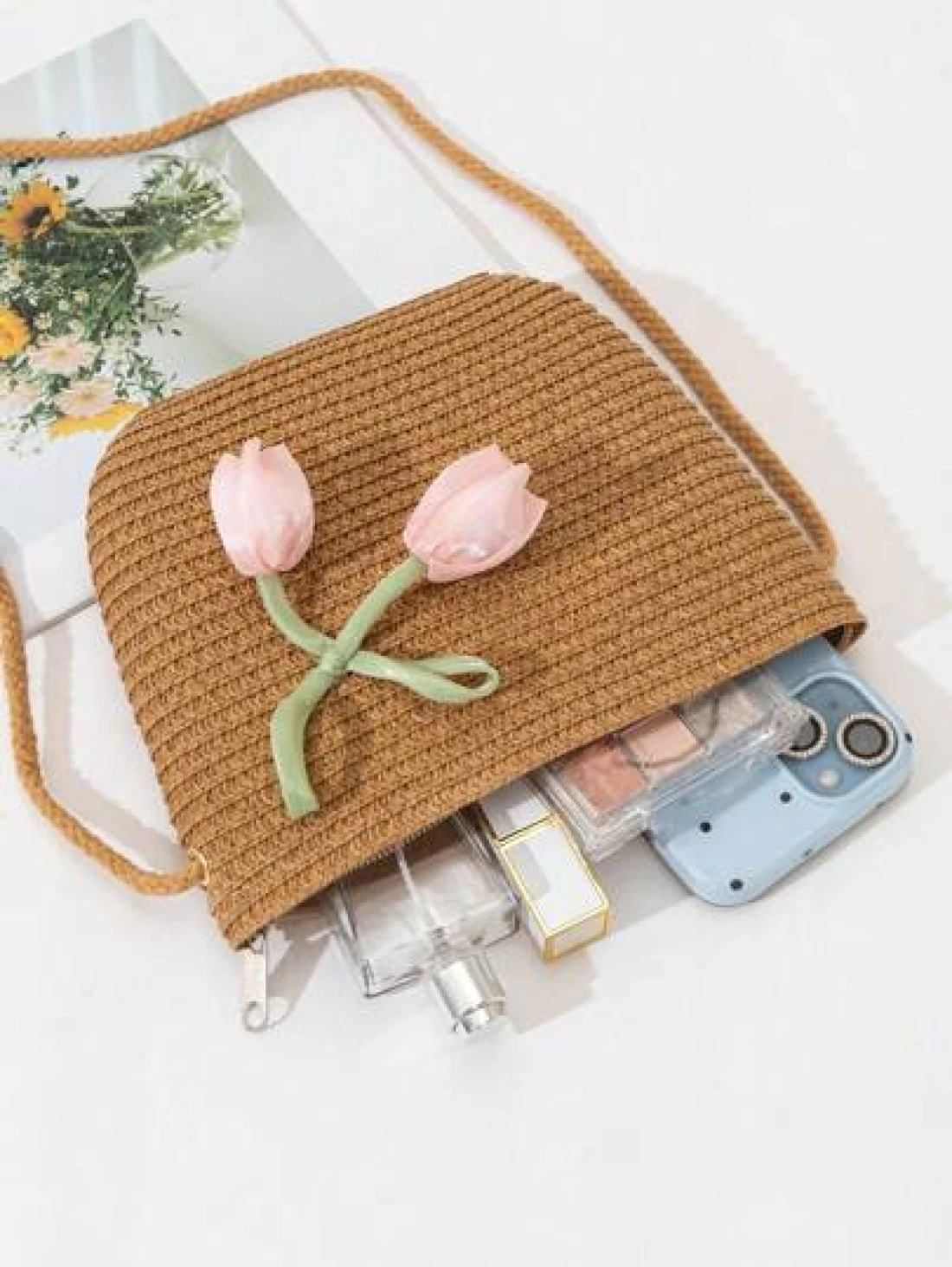 حقيبة قش جديدة للبنات، خفيفة الوزن وعصرية، مناسبة للشاطئ والسفر والتسوق، مزينة بأزهار وردية جميلة، حقيبة هاتف متقاطعة للفتيات