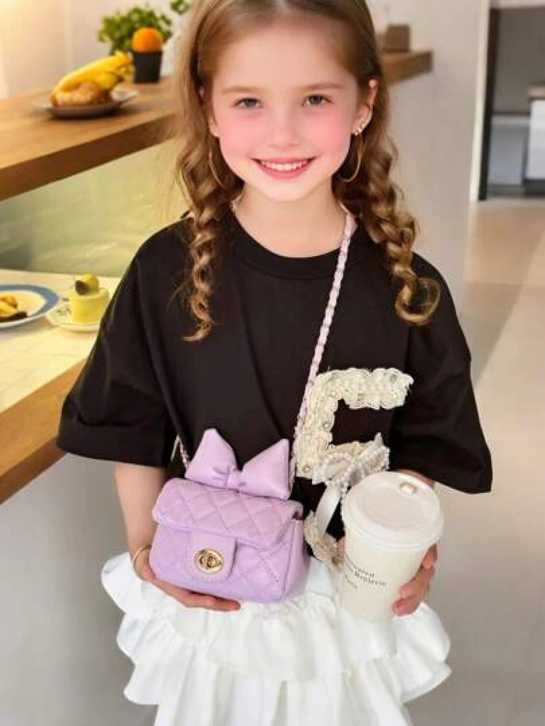 قطعة واحدة محفظة عملة مزينة بالفيونكة للأطفال، حقيبة صغيرة مطرزة بشكل معين مع سلسلة، حقيبة كروس بودي أنيقة للبنات