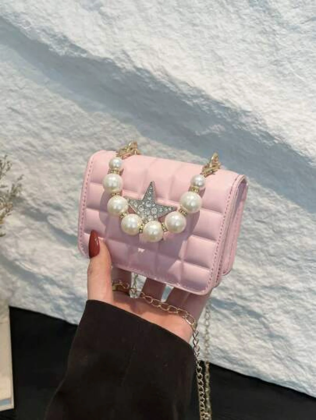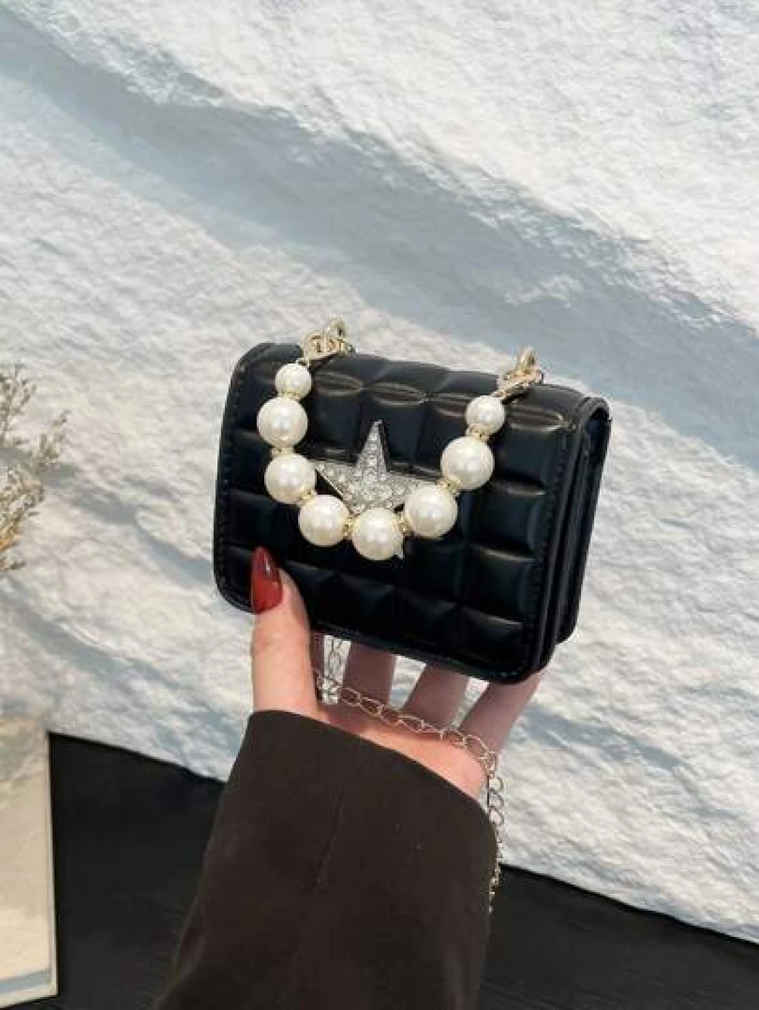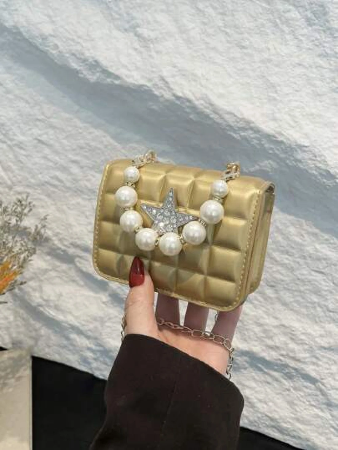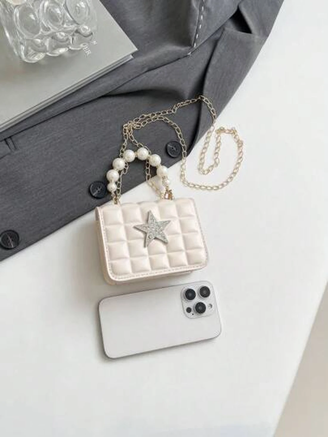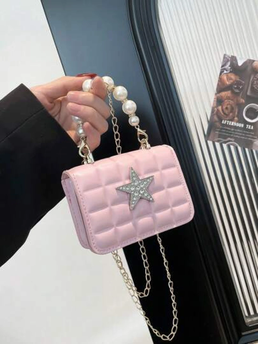 1 قطعة حقيبة مسائية مربعة ذات نجمة خماسية من اللؤلؤ وشبكة الماس، بتصميم فريد مزود بسلسلة كتف، مريحة وقابلة للاستخدام الشامل عبر الجسم أو الكتف، سلسة وملائمة، مناسبة للخروجات اليومية والمدرسة واللعب، هدية مثالية للفتيات