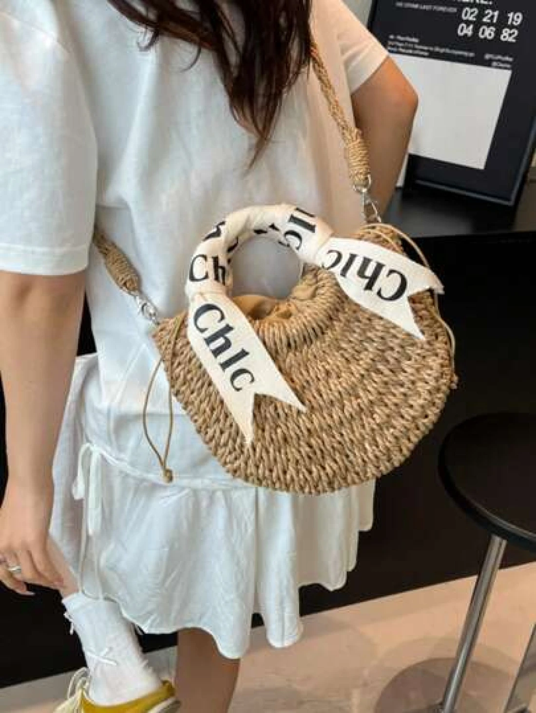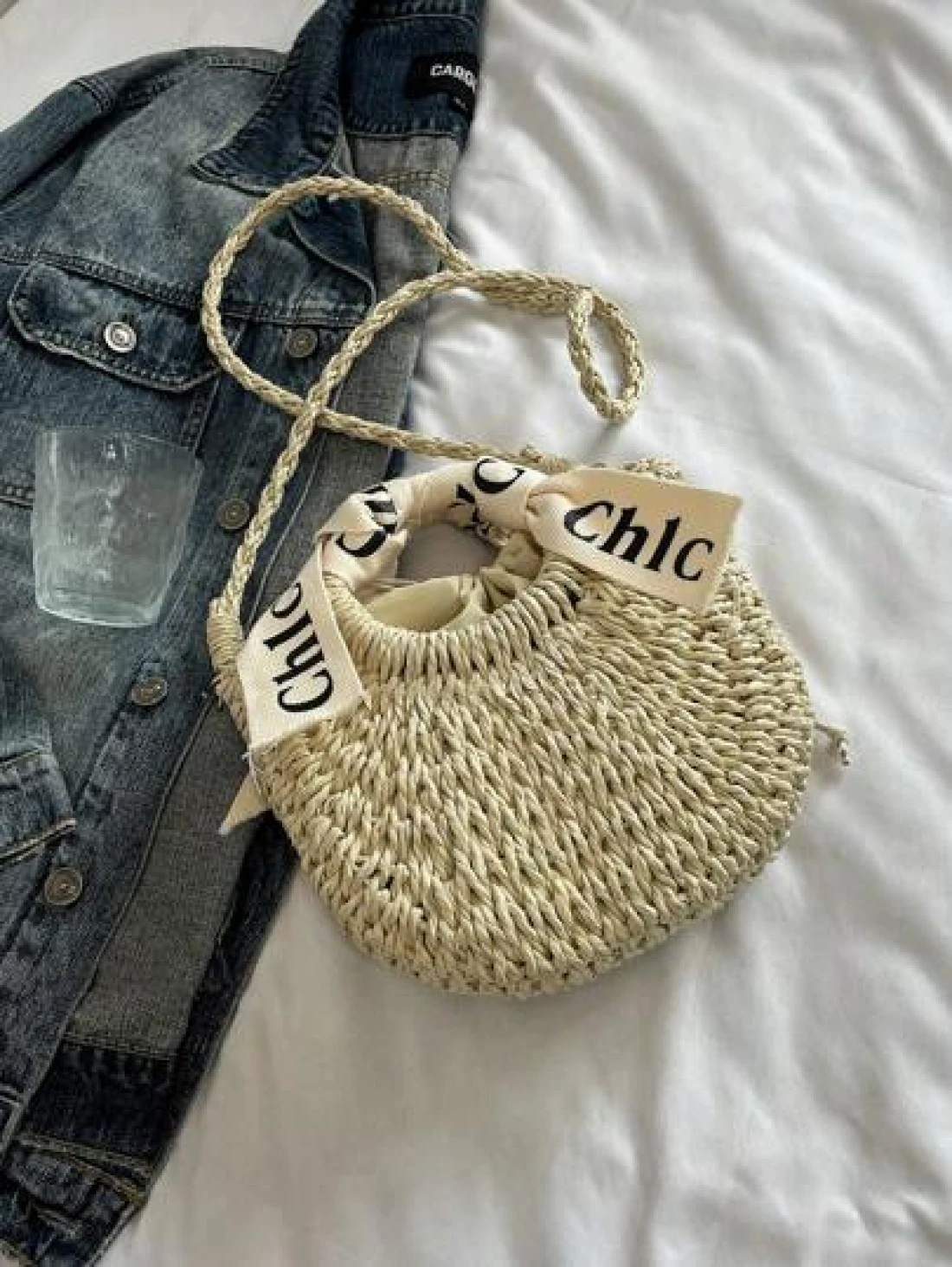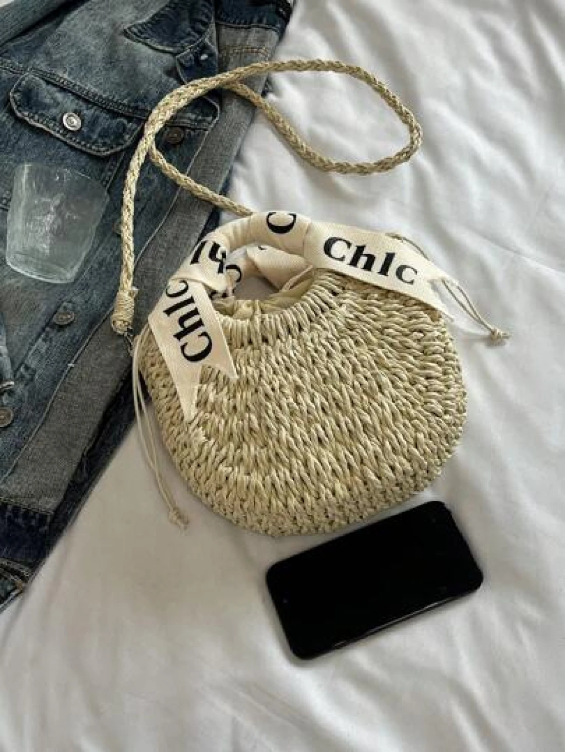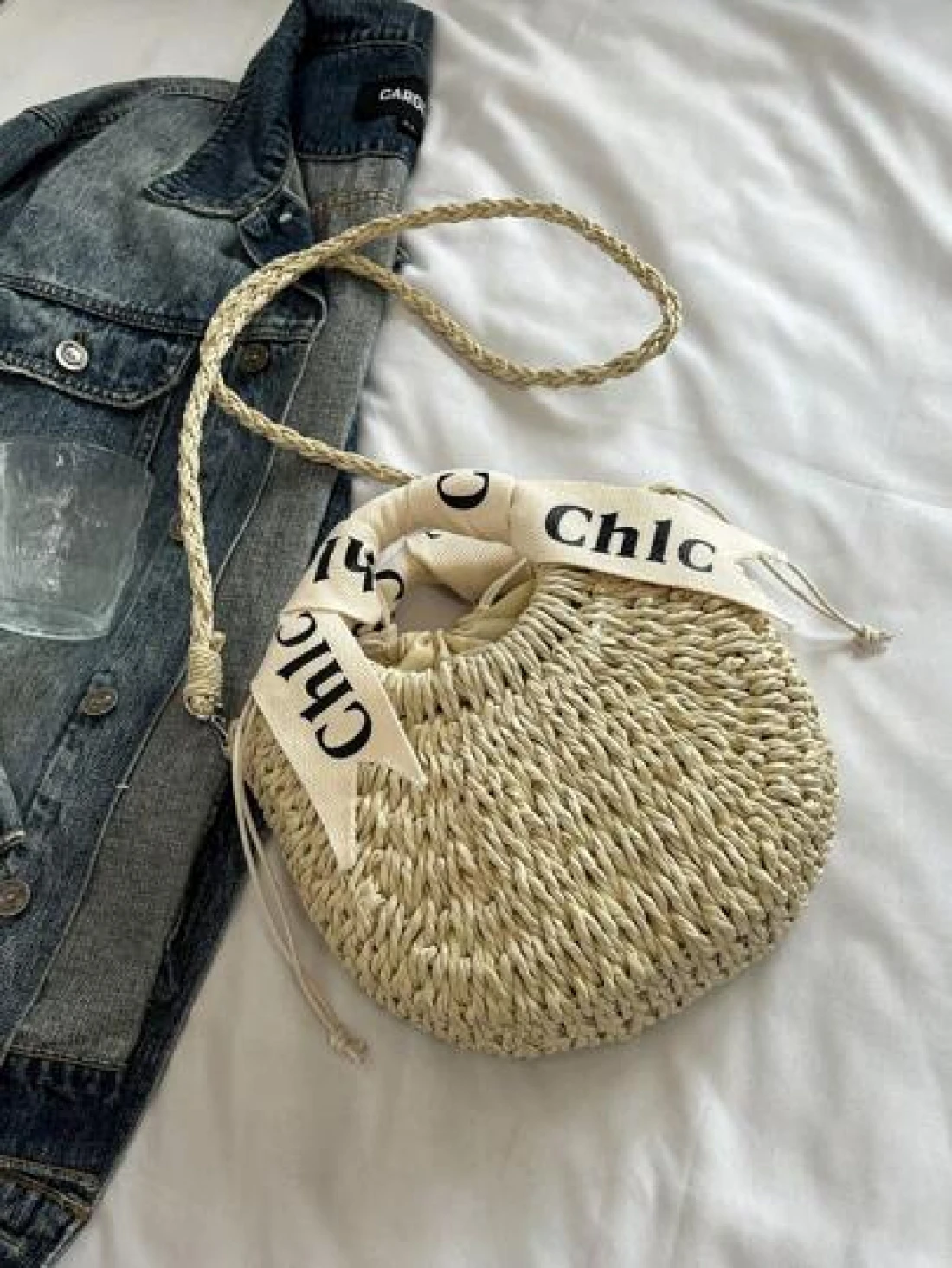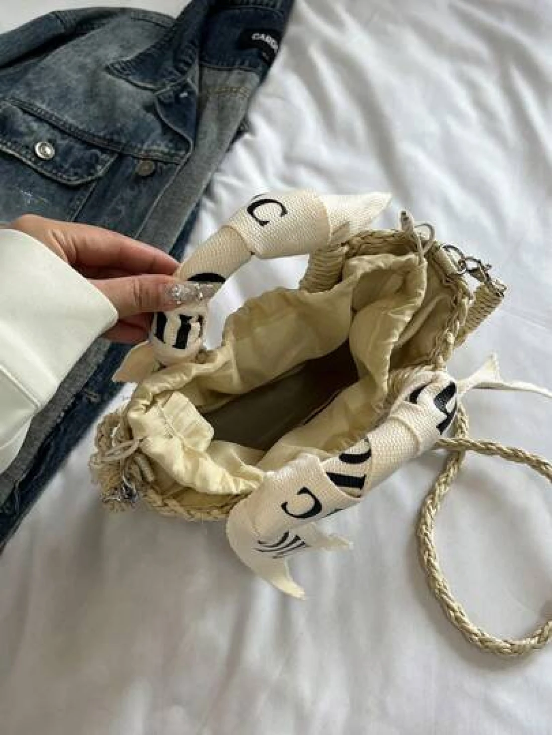 حقيبة كتف/متقاطعة بمقبض منسوج مطرز بالأحرف، حقيبة شاطئ/عطلة