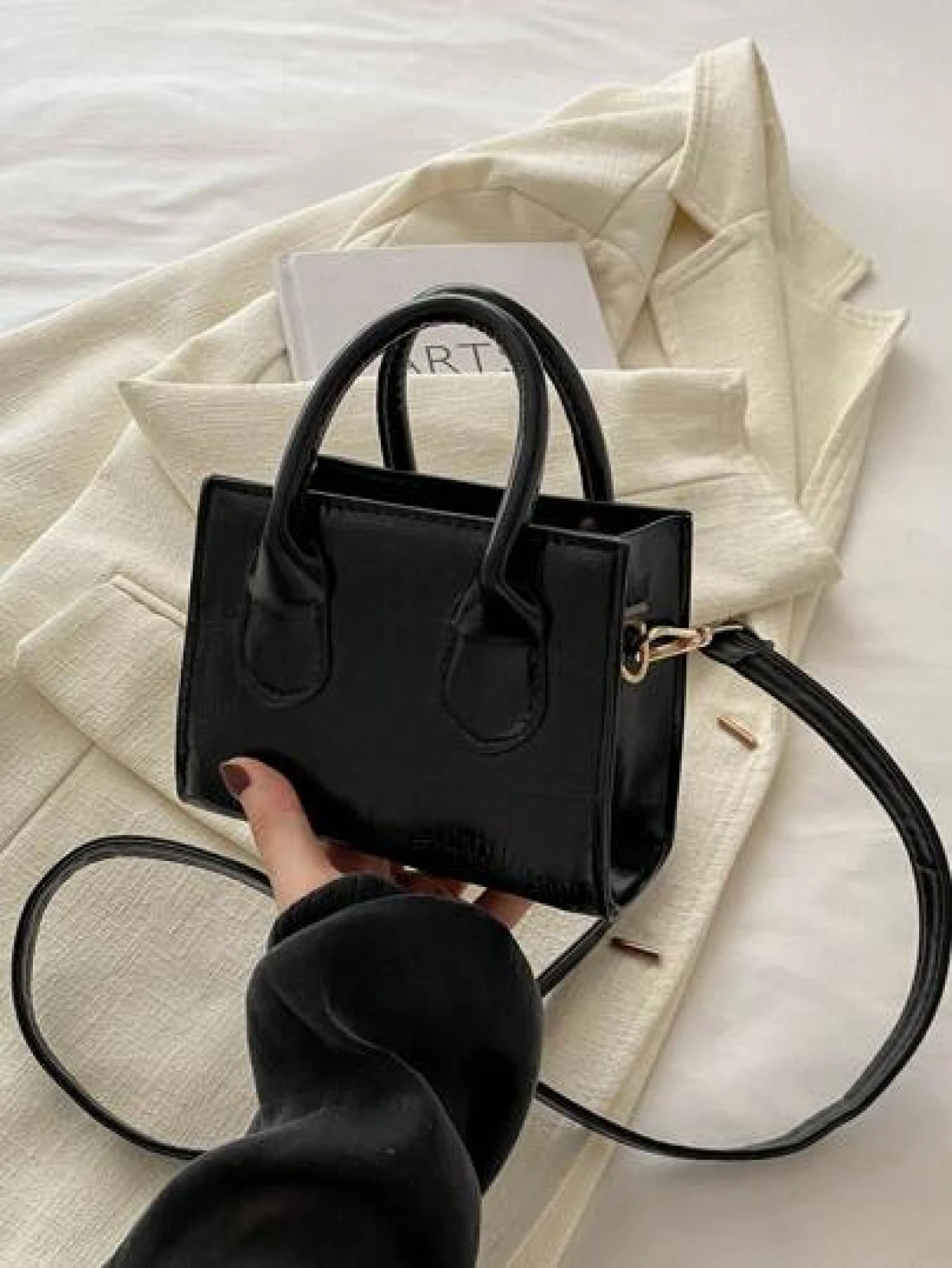 حقيبة كتف/حقيبة عبر الجسم أنيقة وعصرية بتصميم أنيق، ذات موحد اللون، لامع، قوام قماش الإبط مع سلسلة ، بطبعة تمس