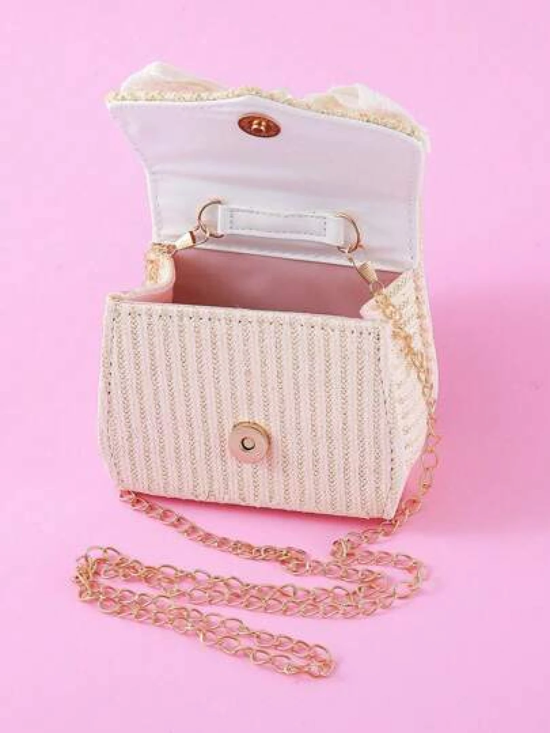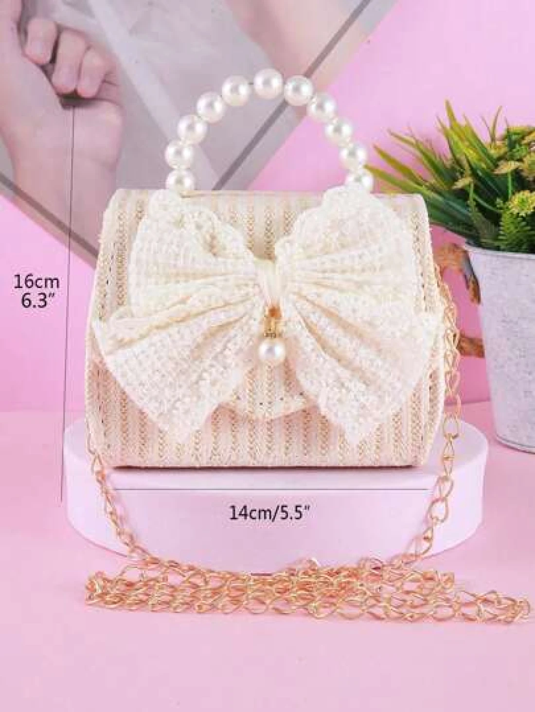 قطعة واحدة حقيبة كتف ذات غلق بشريط وفيونكة مزينة باللؤلؤ ومقبض لؤلؤي مصنوعة من القش وال- PU، إكسسوار حقيبة أمير