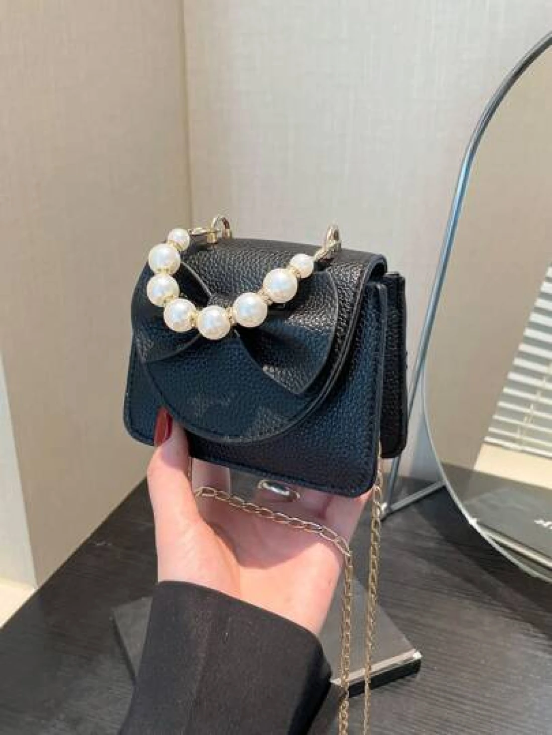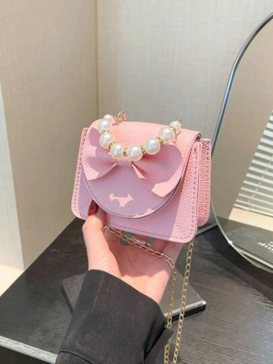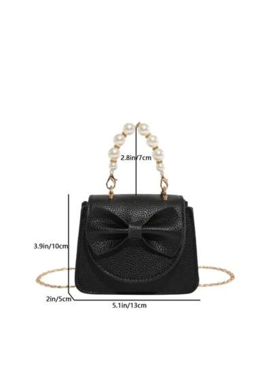 1 Piece Pu Magnet Closure Fashion Sweet Lychee Pattern Faux Pearl Bow Handbag Niche Design Highly Attractive Chain Mini Shoulder Crossbody Change Lipstick Bag Suitable For Teenagers Travel Shopping Pa