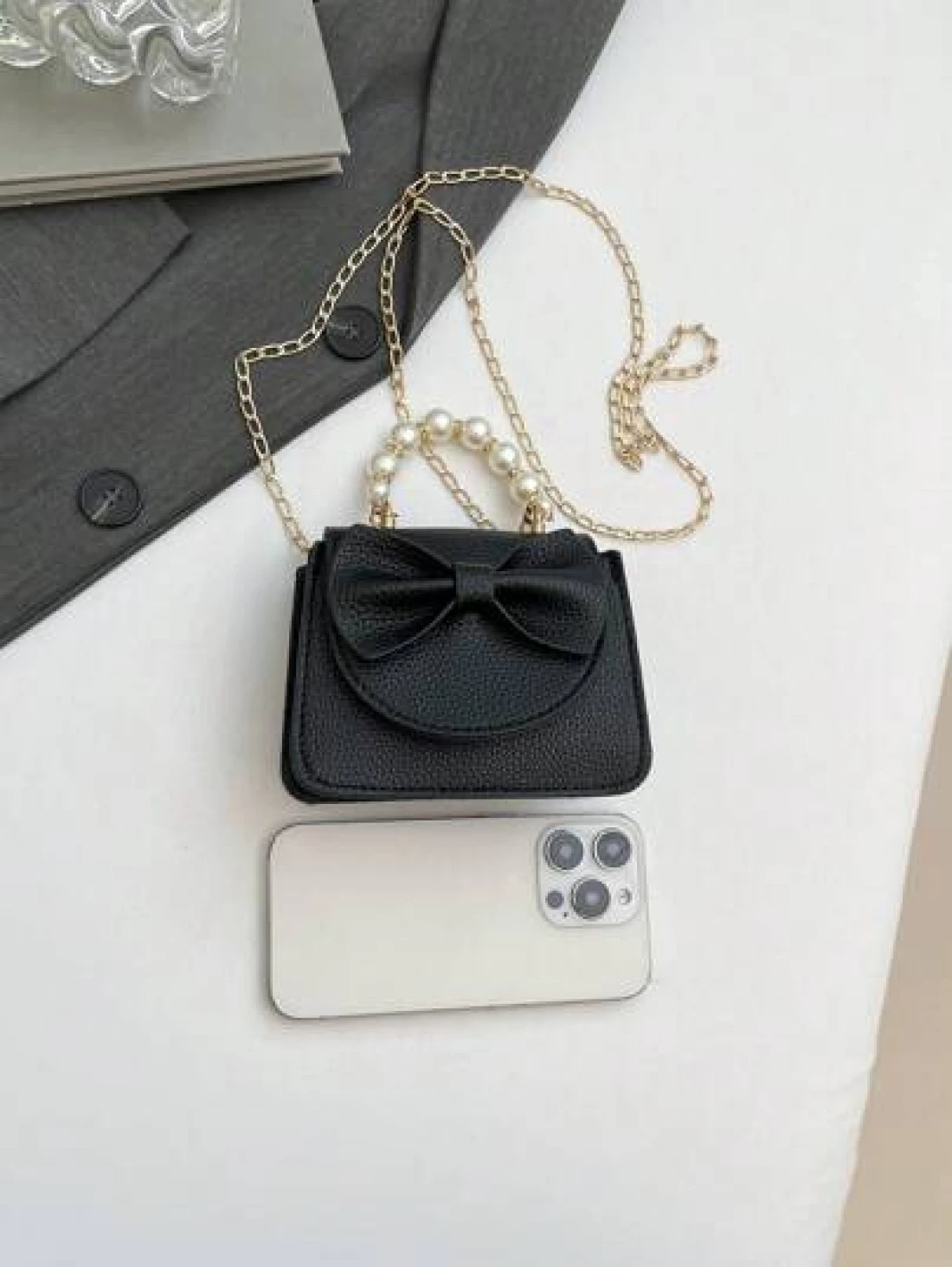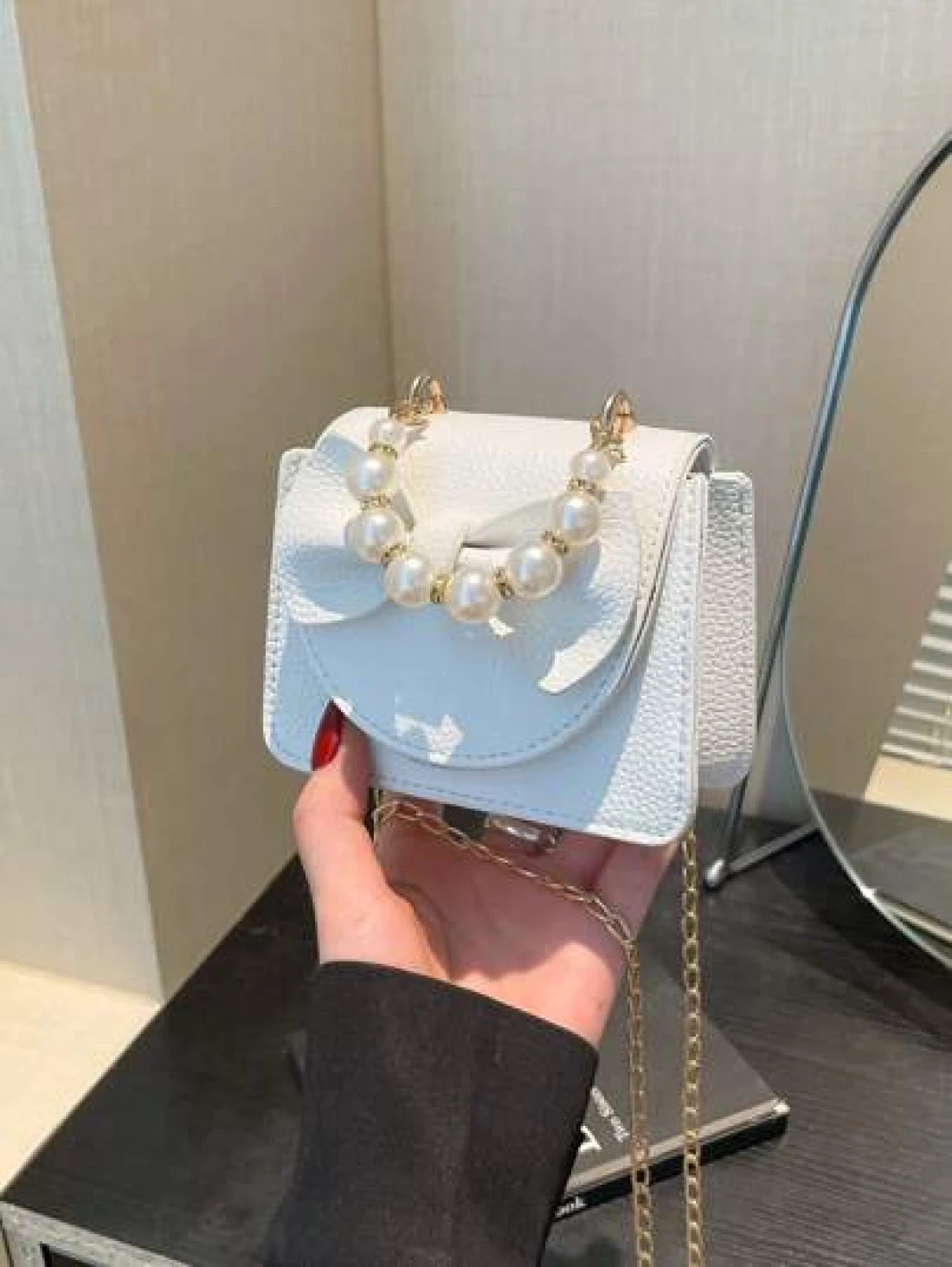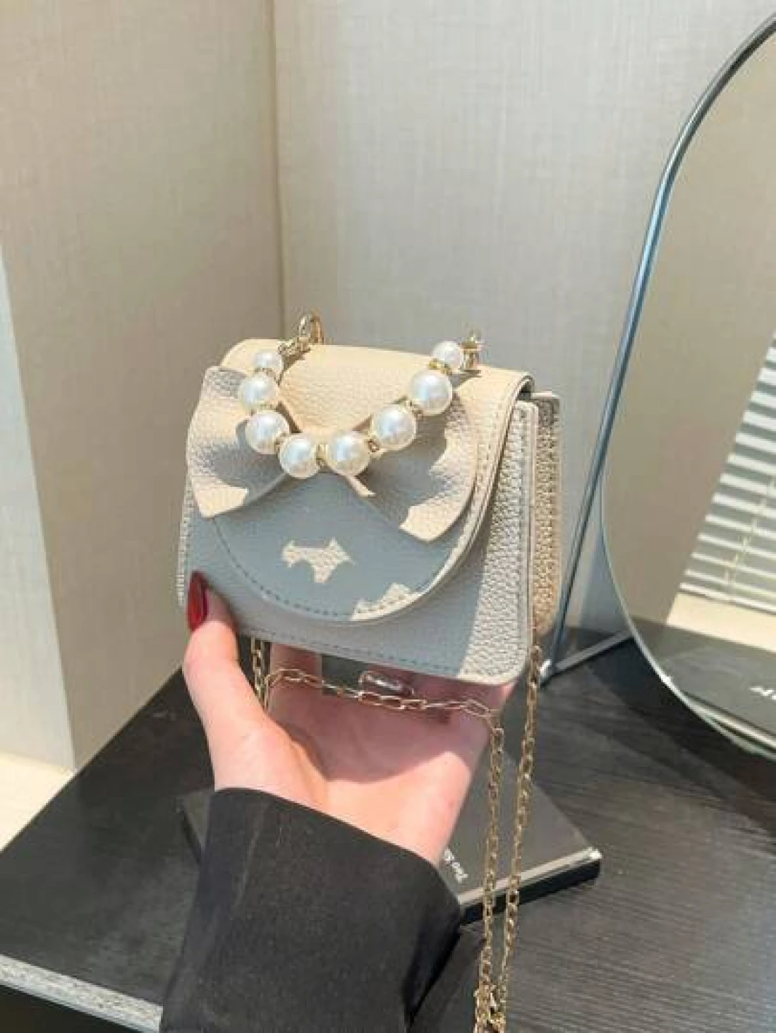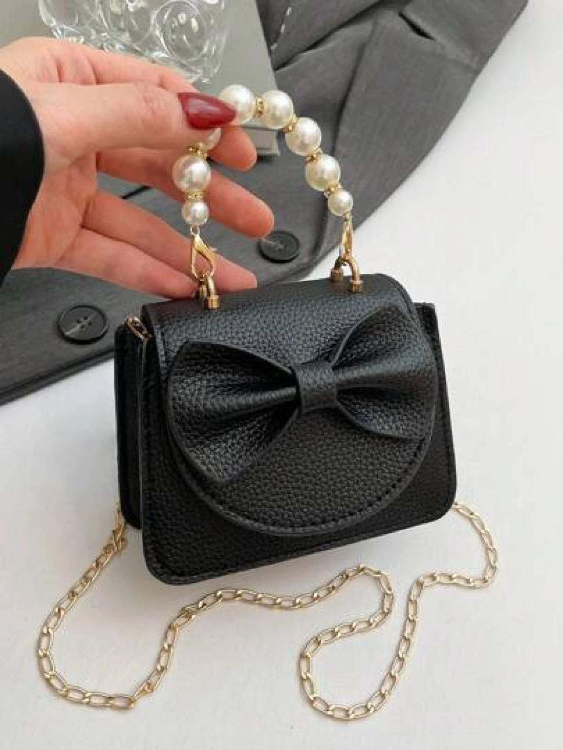 1 Piece Pu Magnet Closure Fashion Sweet Lychee Pattern Faux Pearl Bow Handbag Niche Design Highly Attractive Chain Mini Shoulder Crossbody Change Lipstick Bag Suitable For Teenagers Travel Shopping Pa