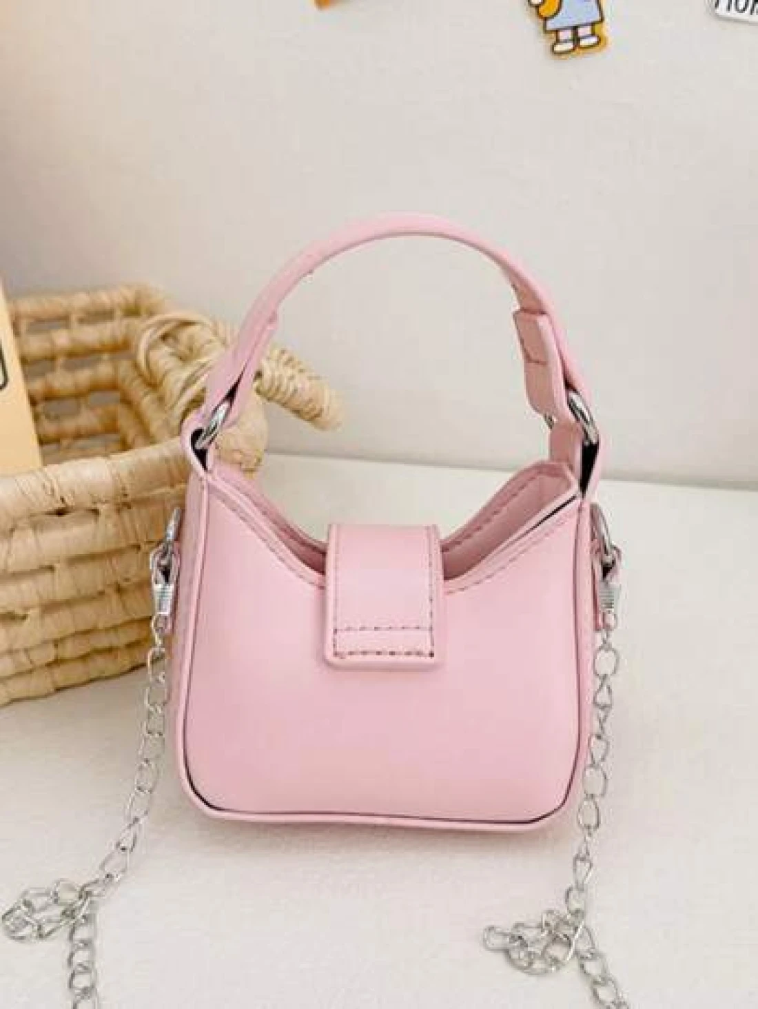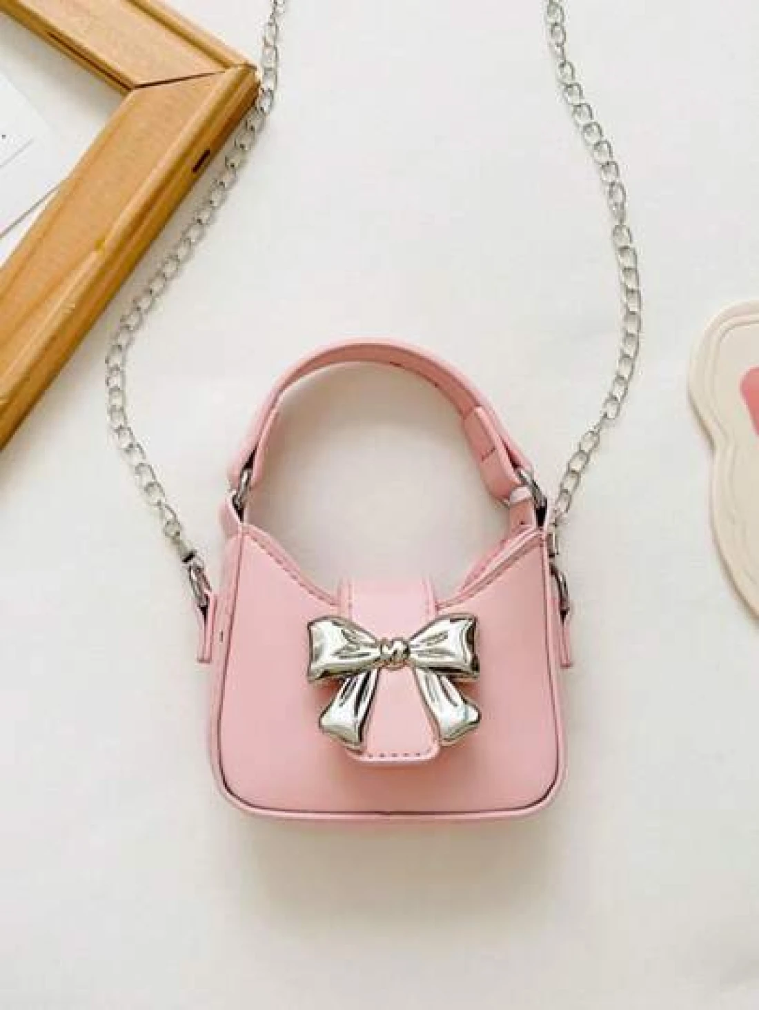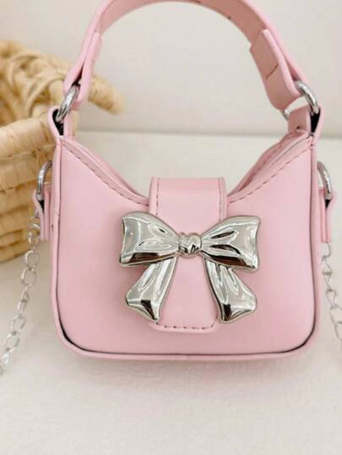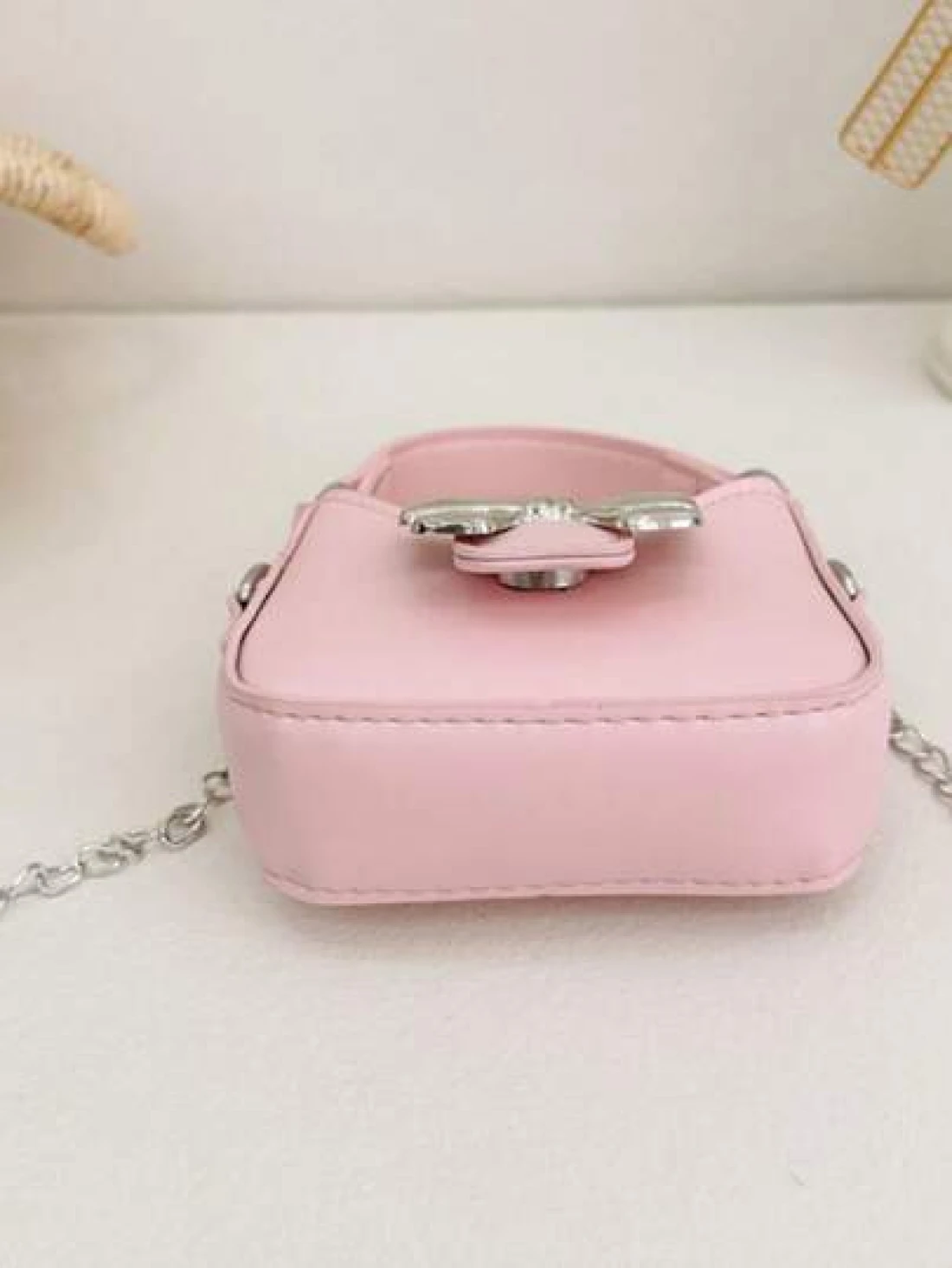 قطعة واحدة حقيبة يد صغيرة جديدة مزينة بفيونكة من مواد البولي يوريثان للبنات، مع حزام معدني قابل للتبديل للحمل