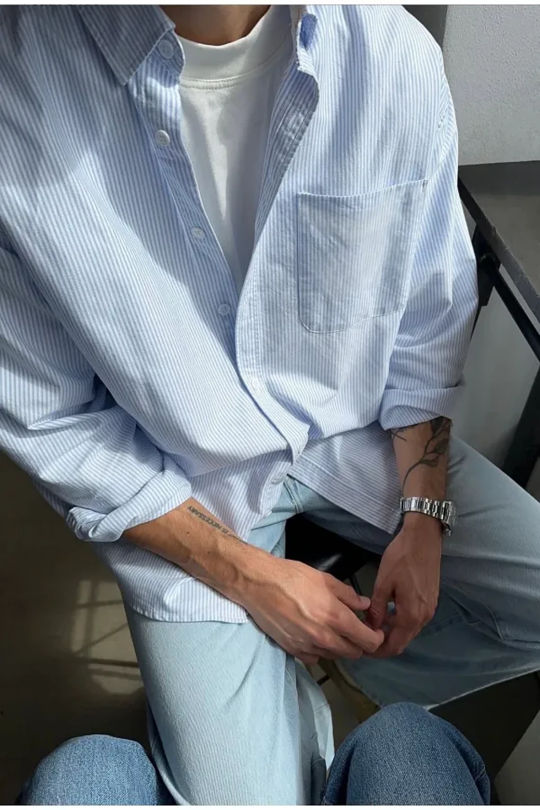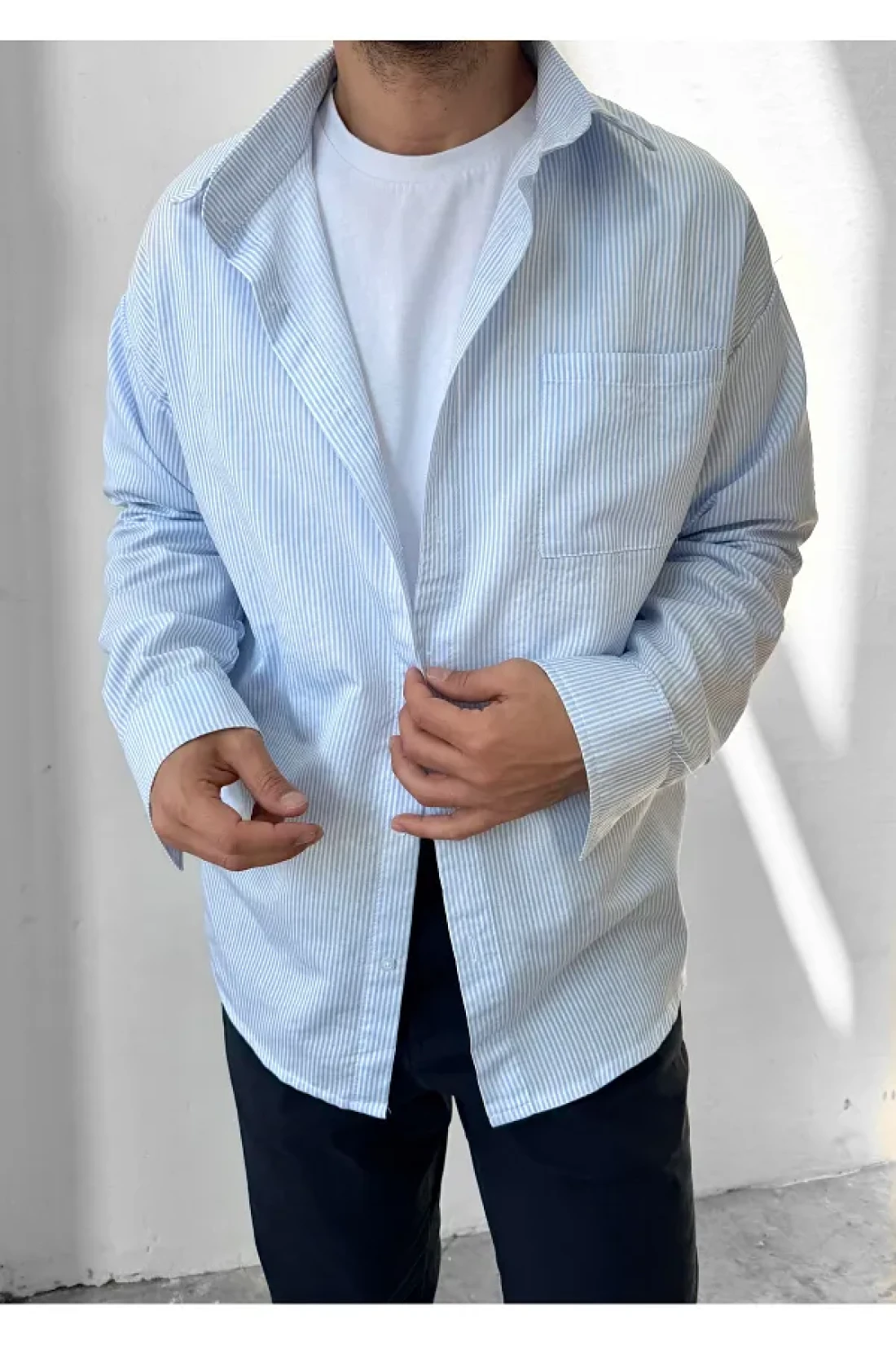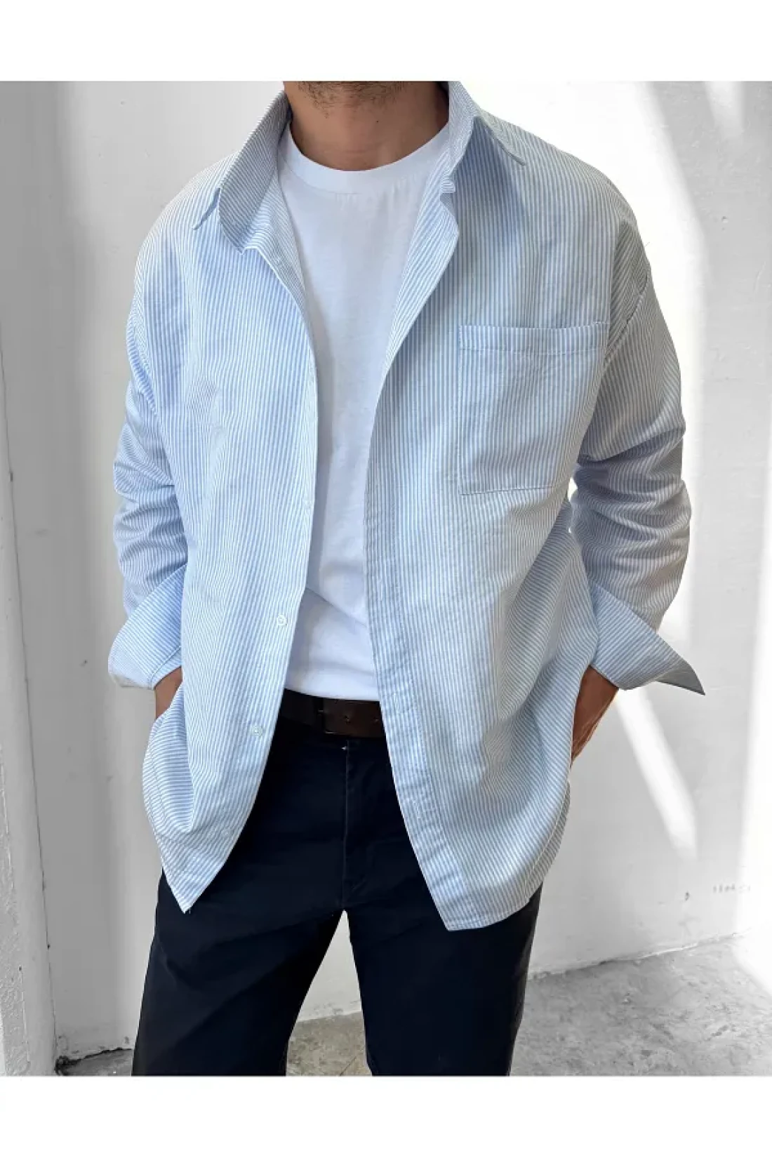King Brothers قميص رجالي قطني مخطط باللون الأزرق بأكمام طويلة - مع جيوب