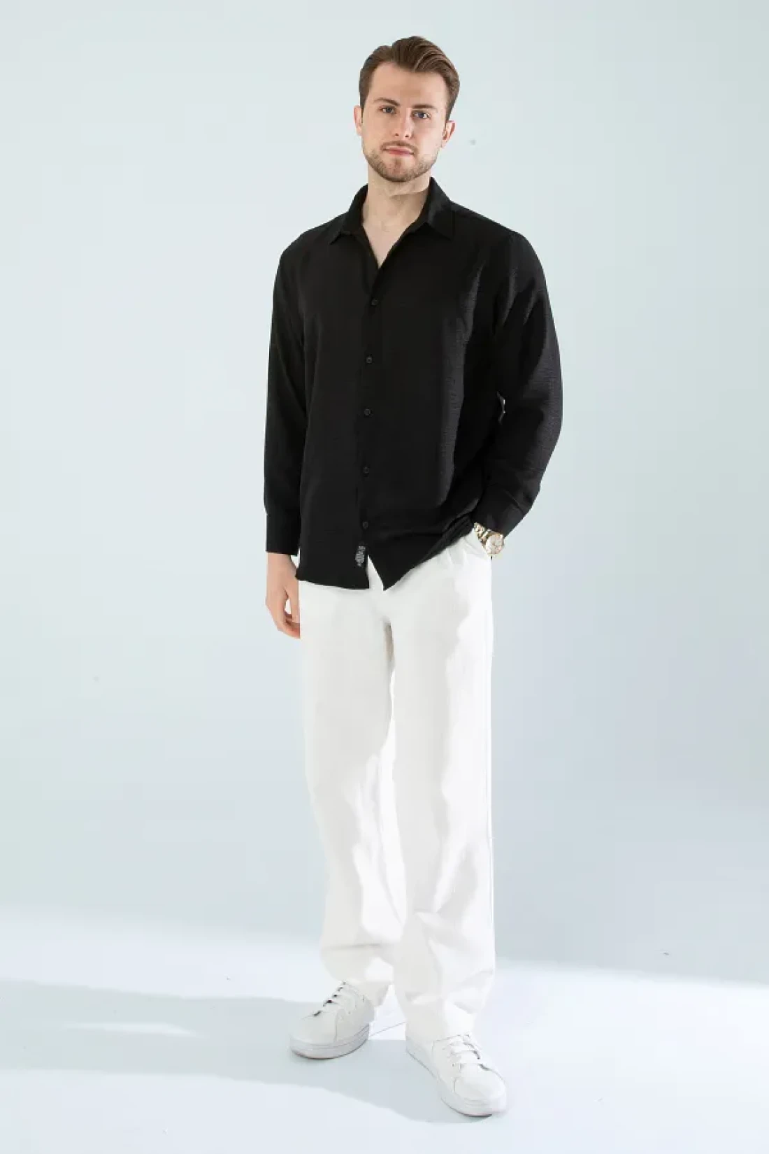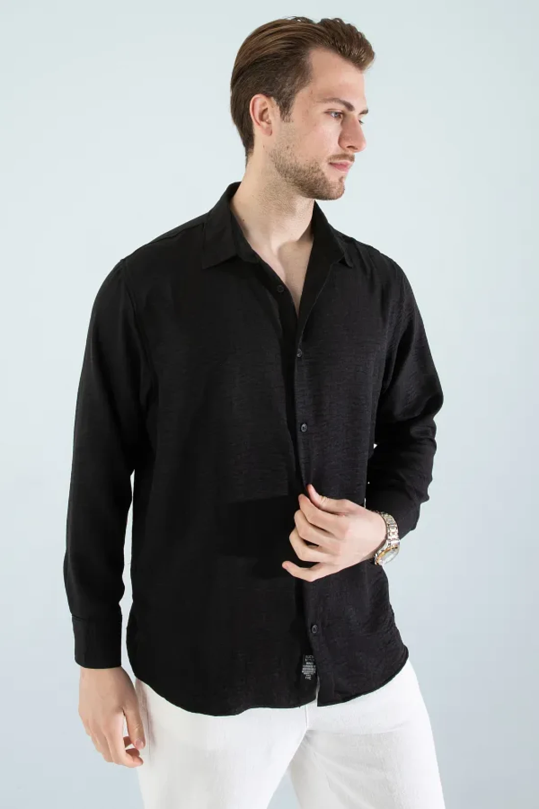 قميص رجالي موسمي من الكتان ذو نسيج طويل الأكمام كبير الحجم باللون الأسود