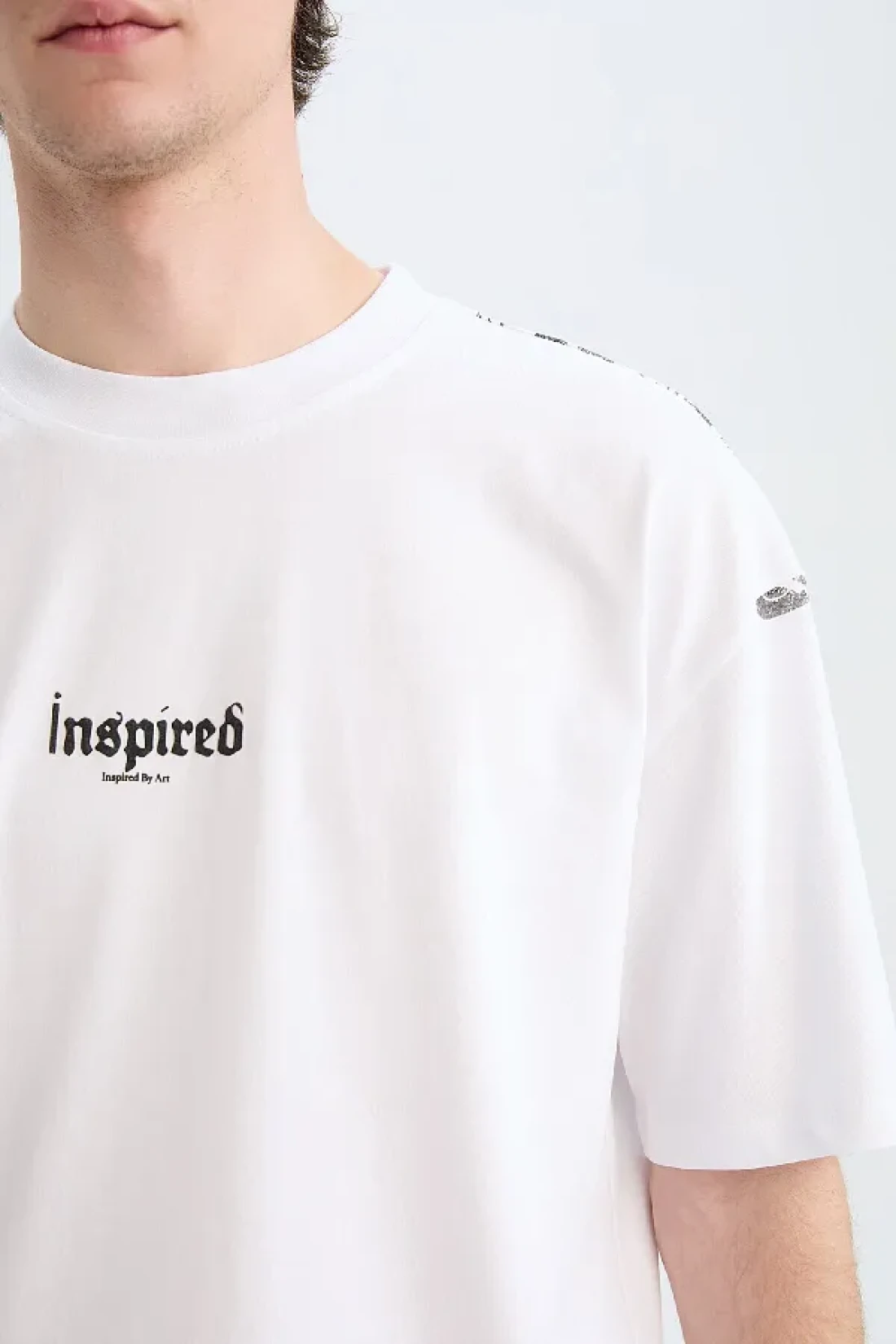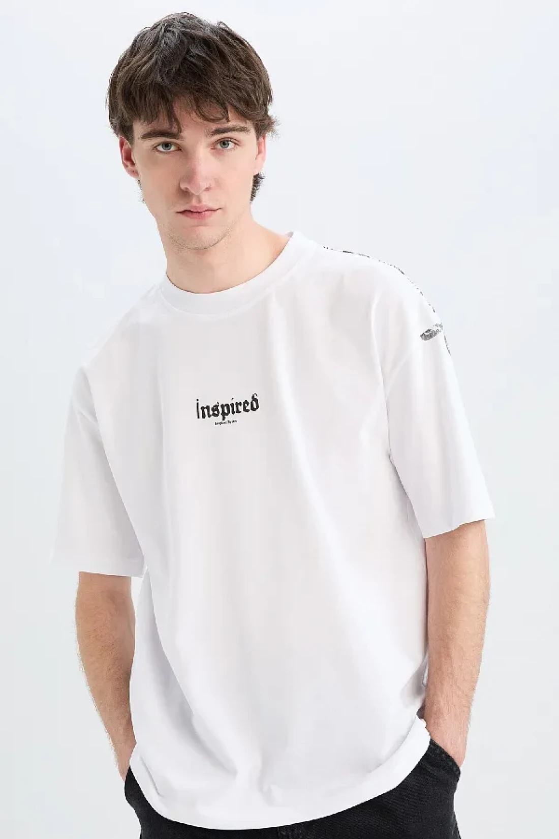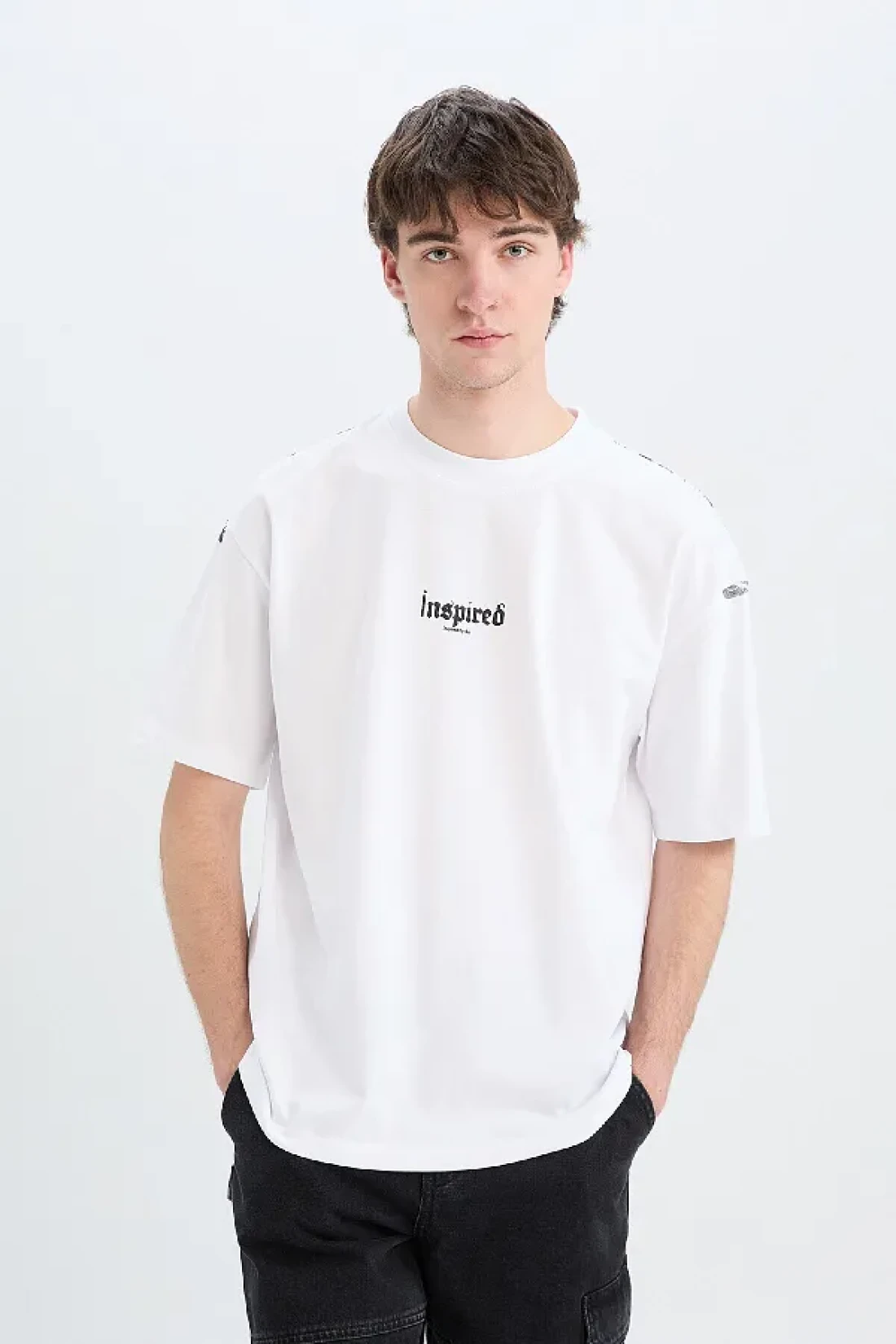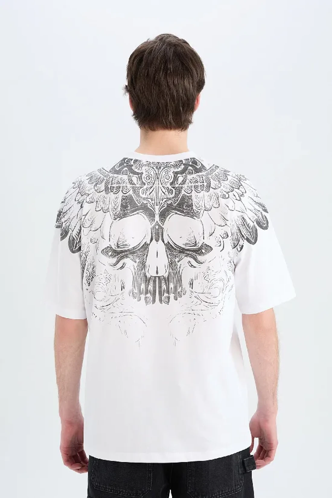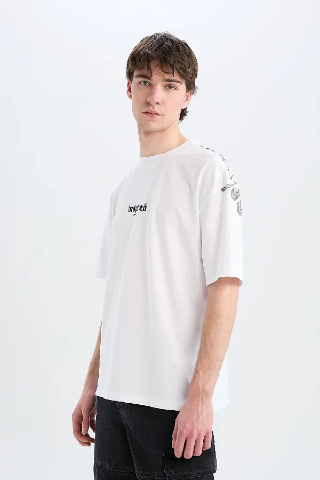 Defacto تي شيرت قطن 100% كبير الحجم بقصة واسعة وياقة دائرية وطباعة خلفية وأكمام قصيرة D5600ax25sp
