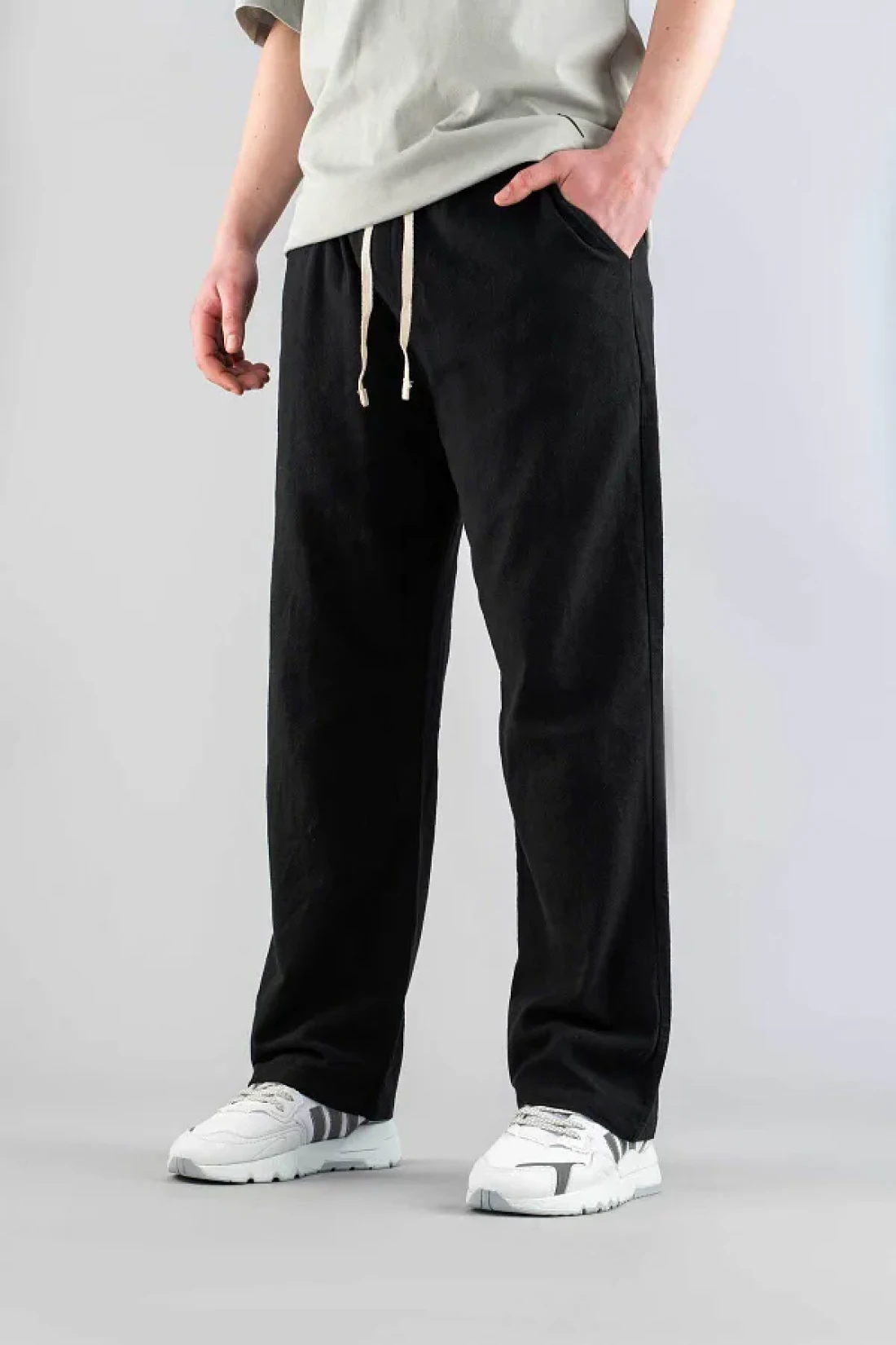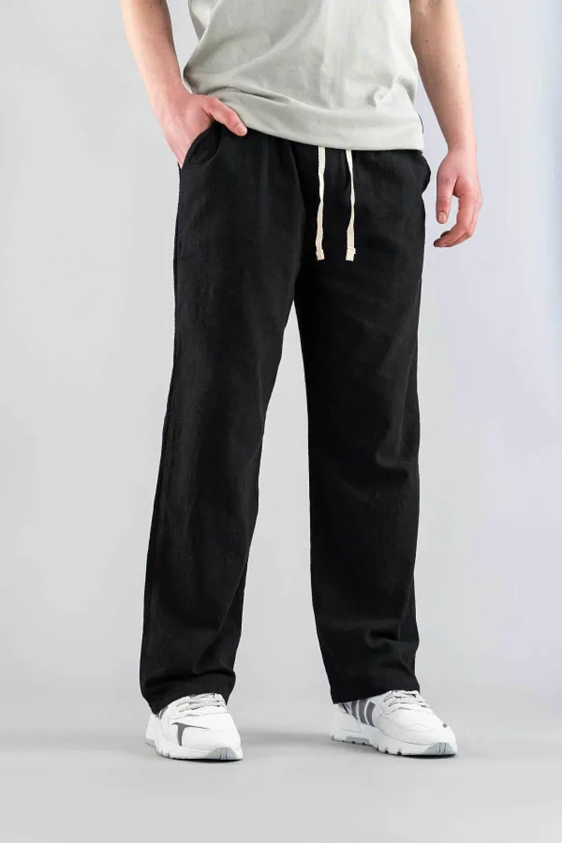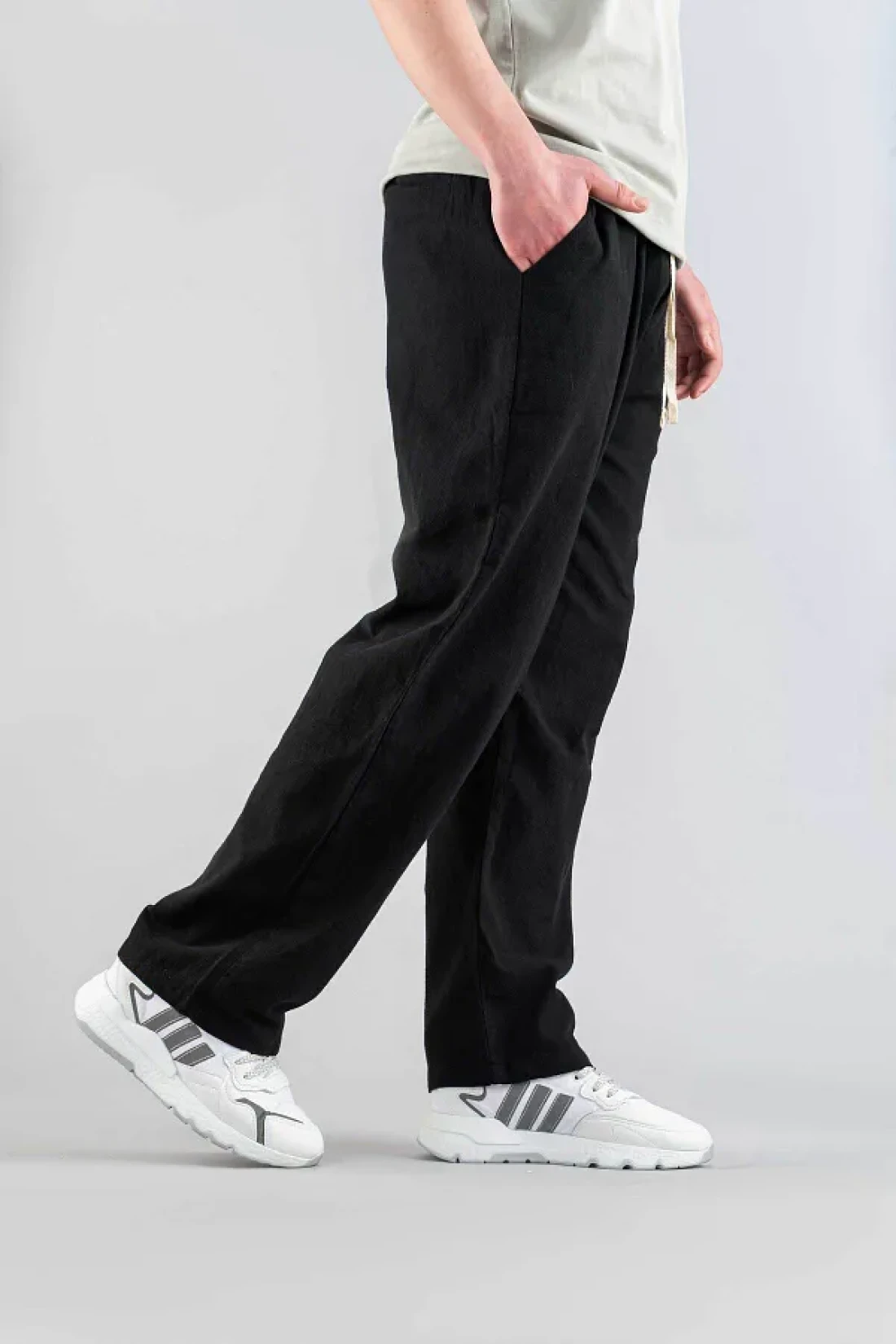 bombe بنطال رجالي أسود مريح بقصة ضيقة من الكتان بحزام من القماش الناعم