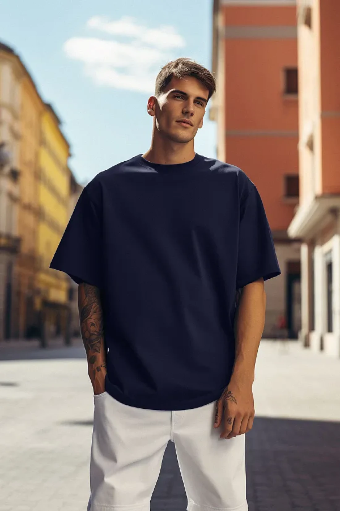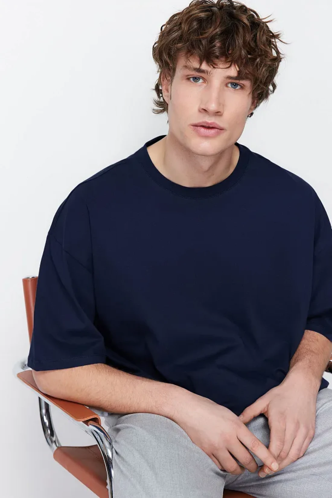 Collection تي شيرت أزرق داكن كبير الحجم برقبة دائرية 100% قطن - TMNSS22TS0318