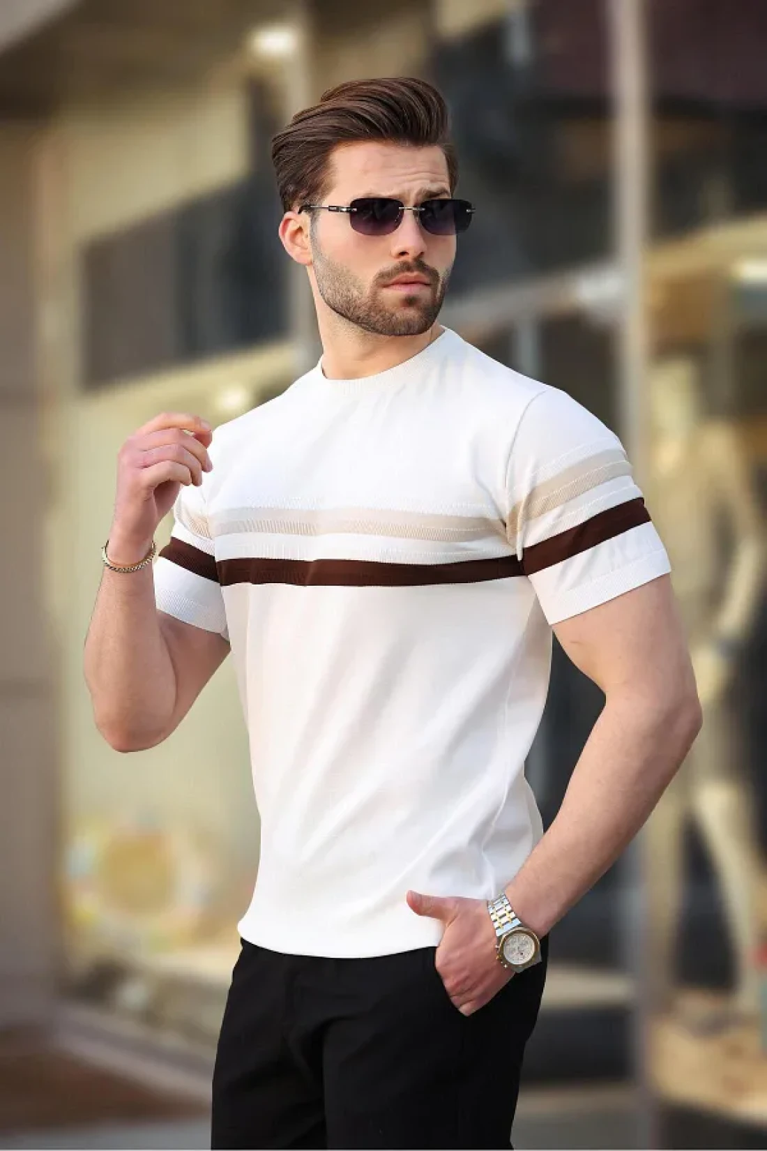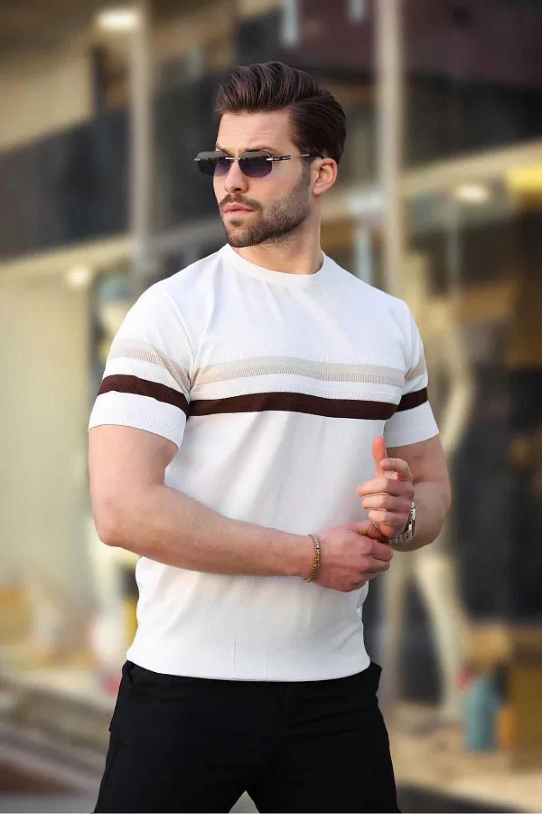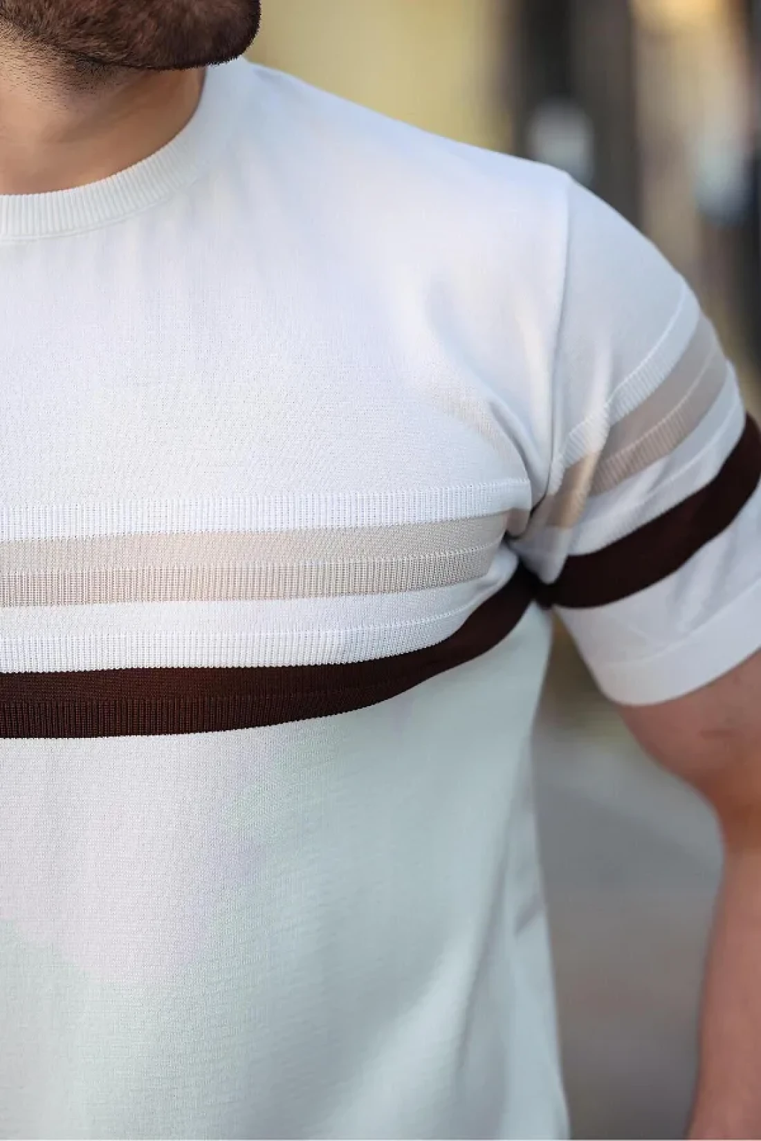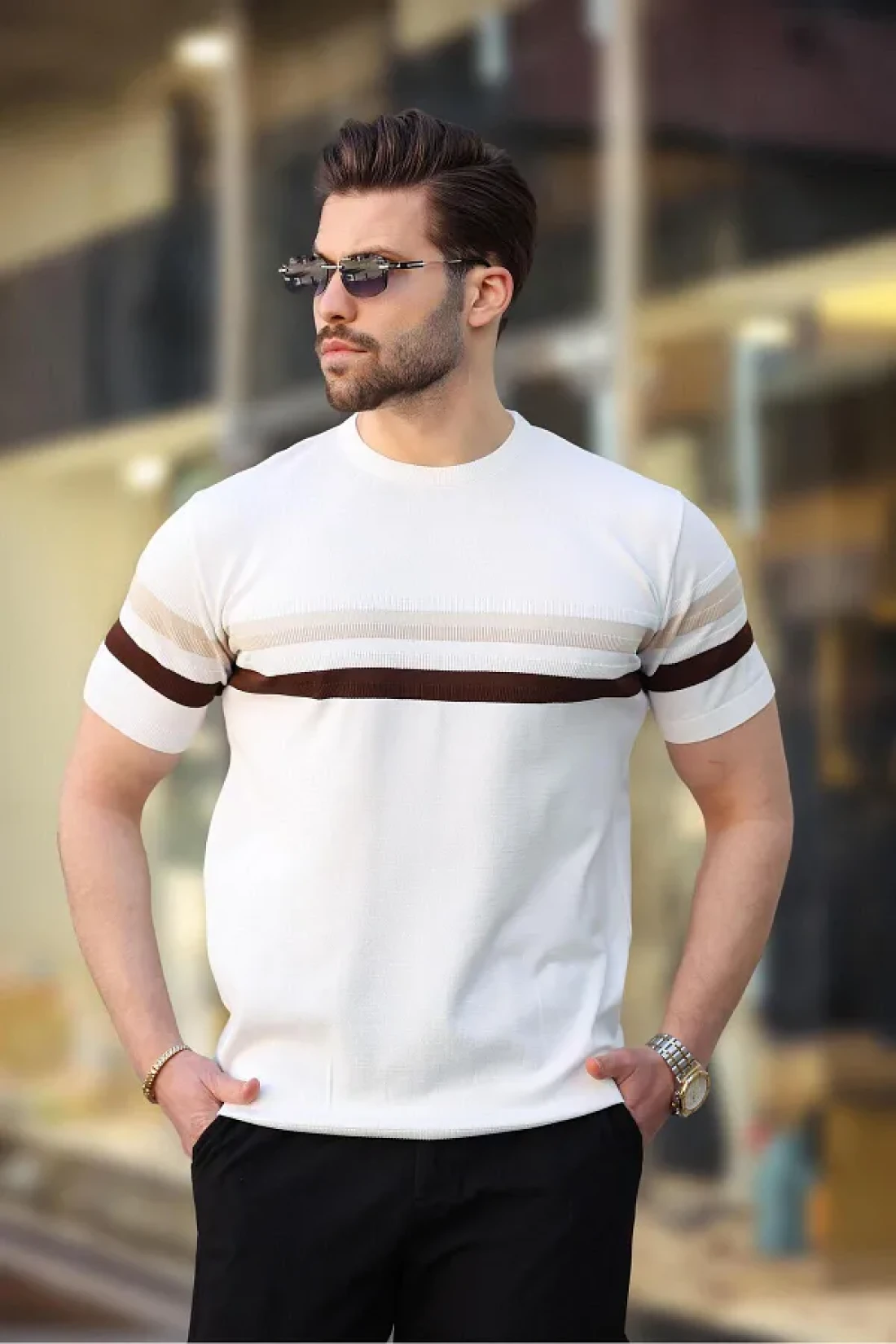 Madmext تي شيرت أبيض مخطط برقبة دائرية للرجال E7412