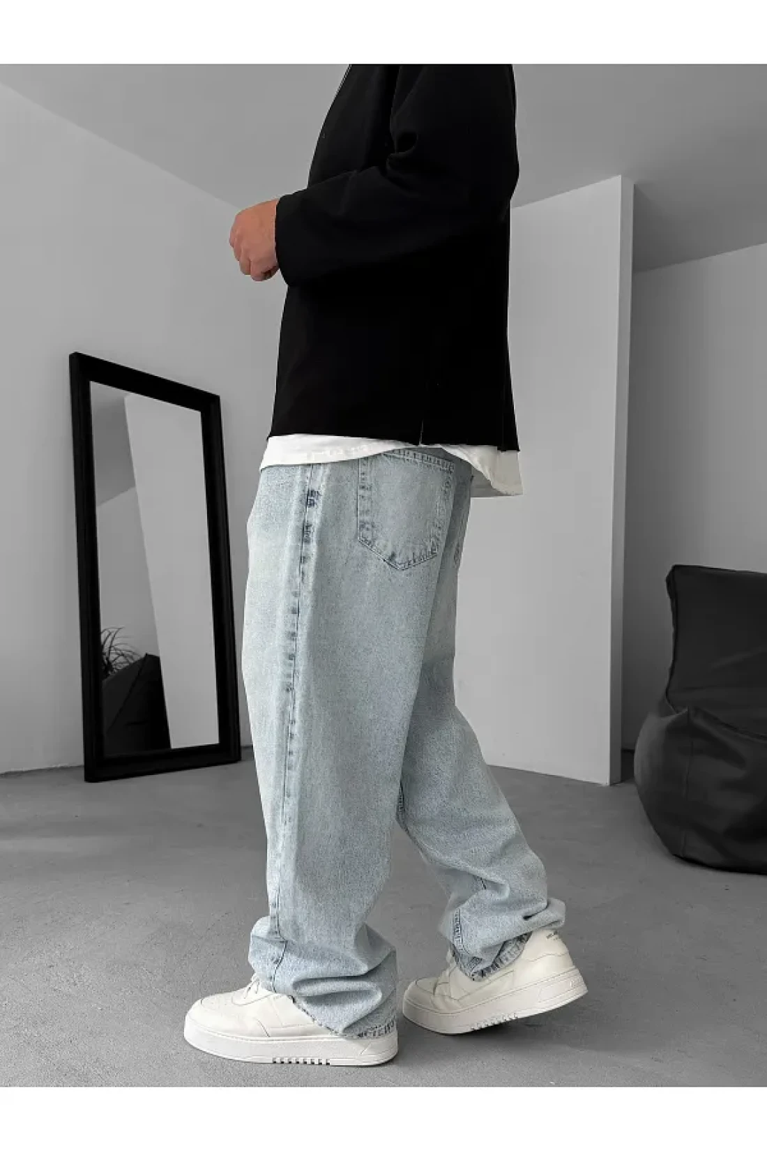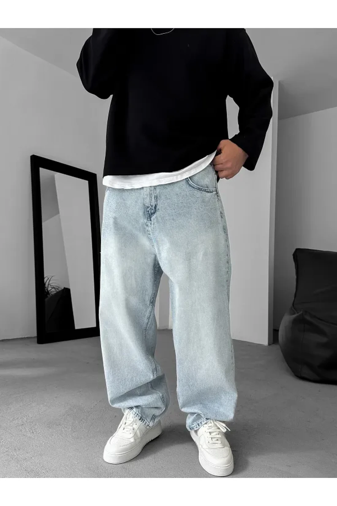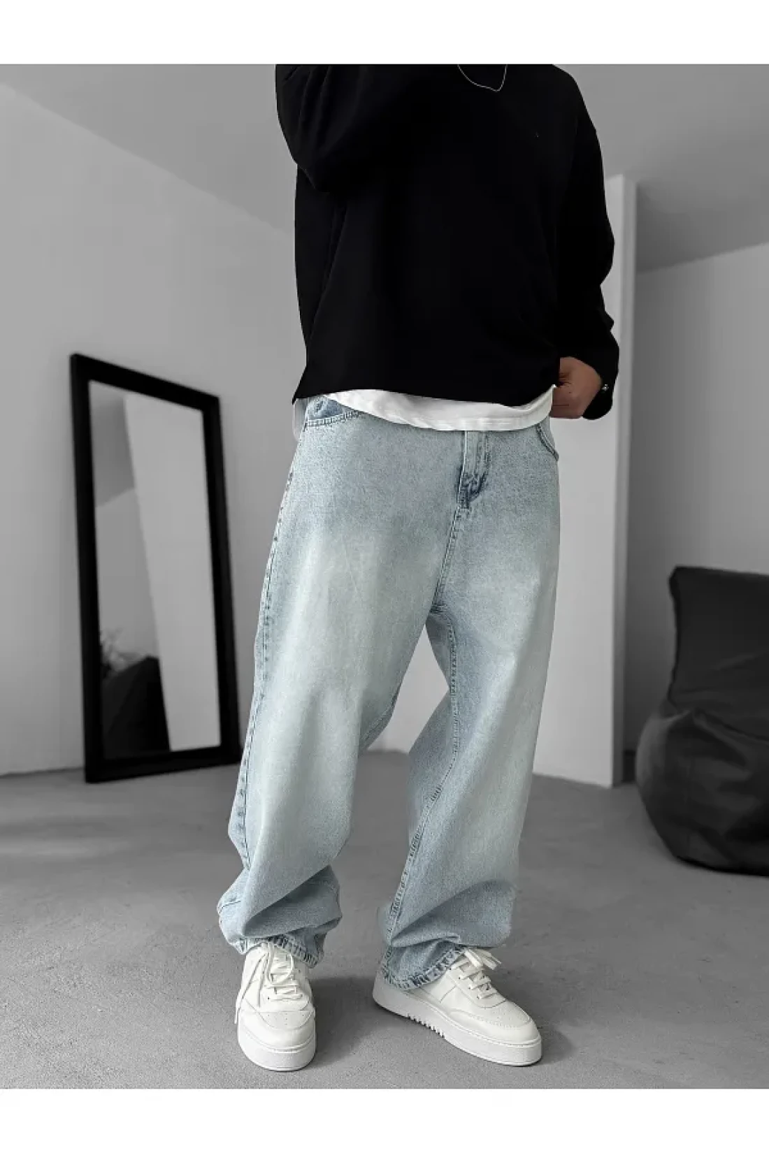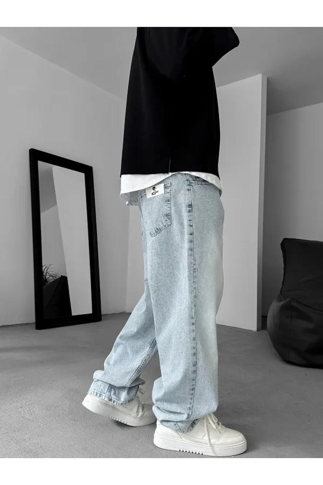BYBASICMAN جينز فضفاض مطحون باللون الأزرق الجليدي KE-783