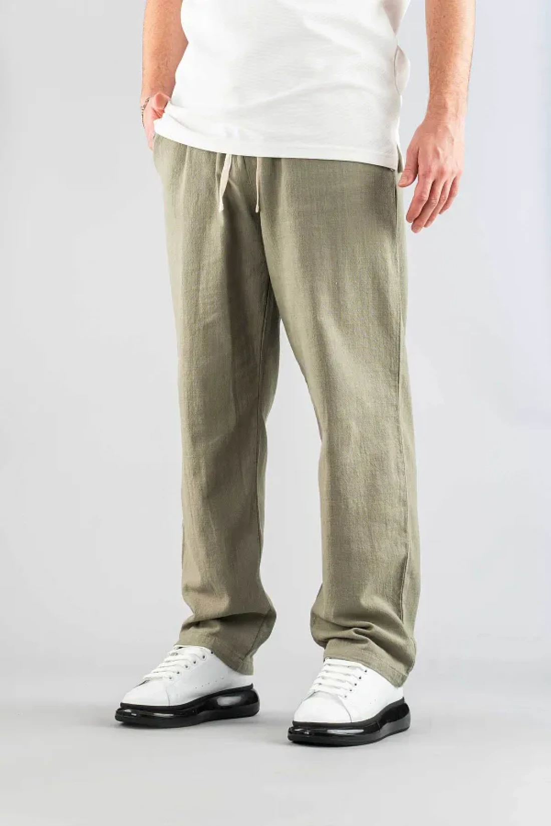 bombe بنطال رجالي كاكي مريح بقصة باغي من الكتان بحزام من القماش الناعم