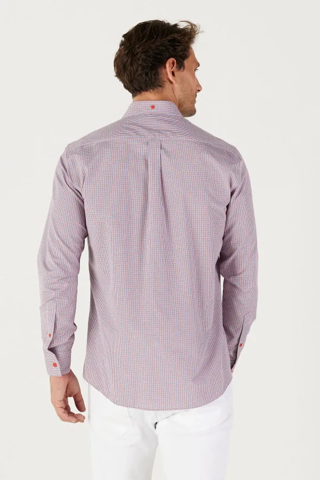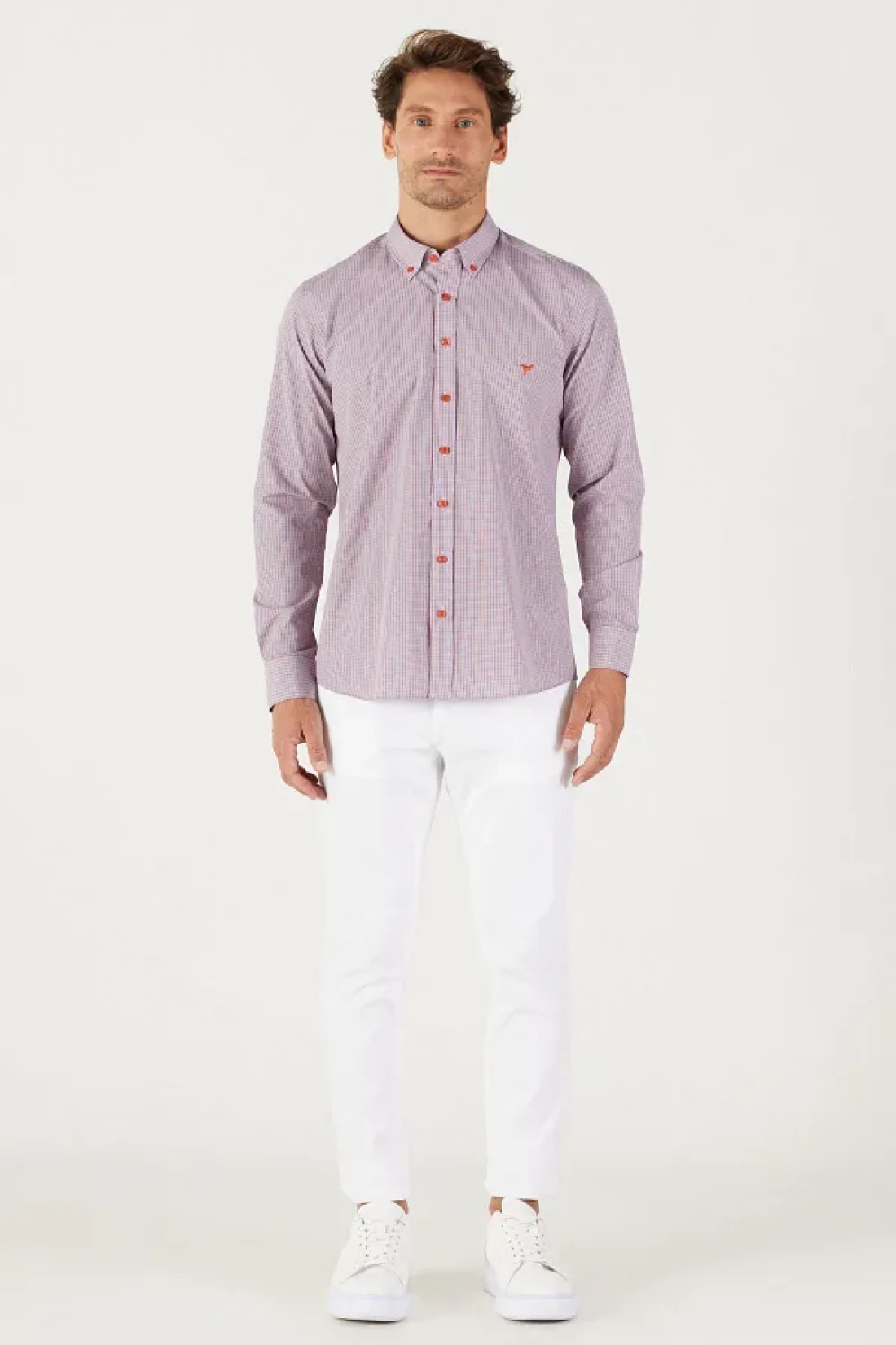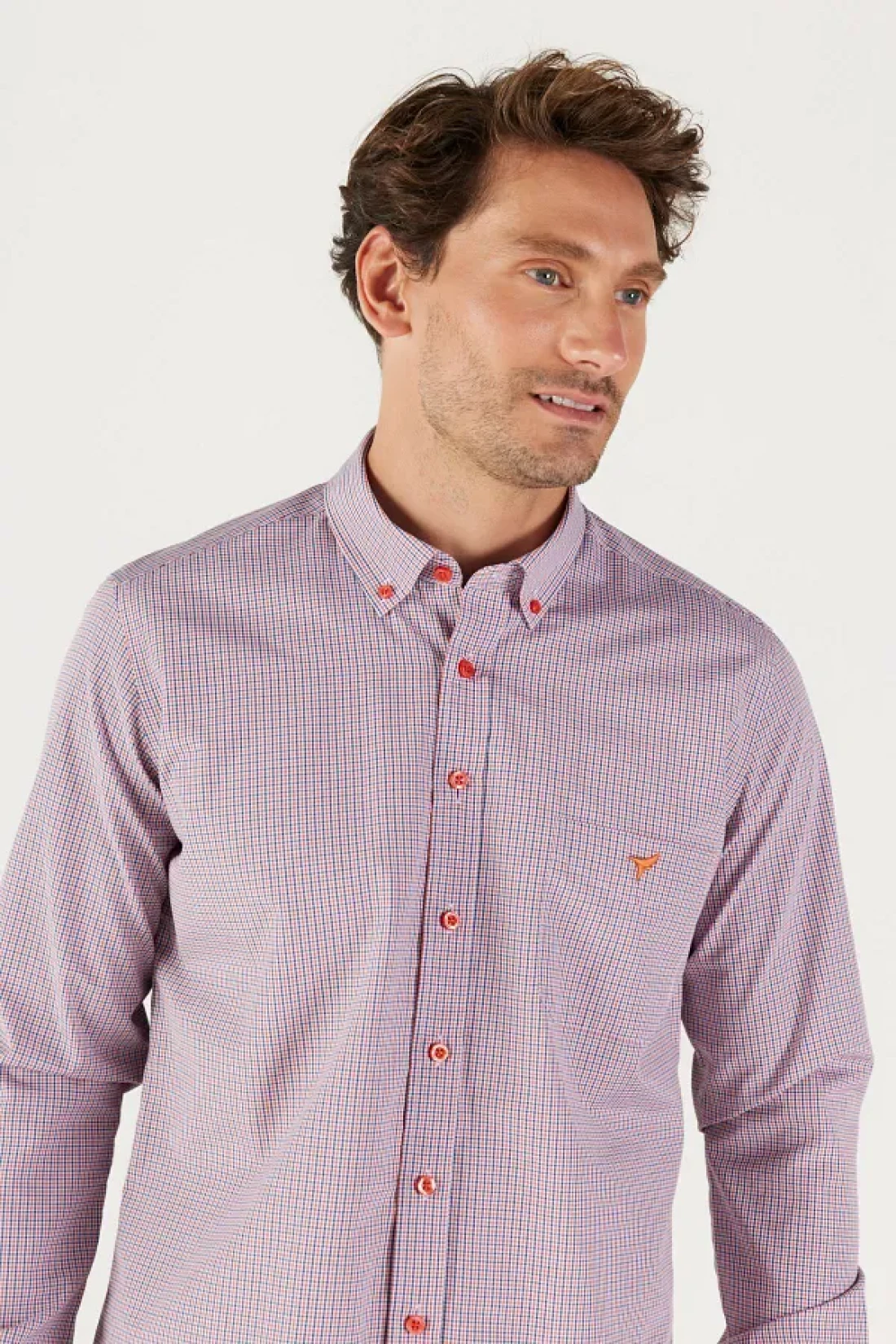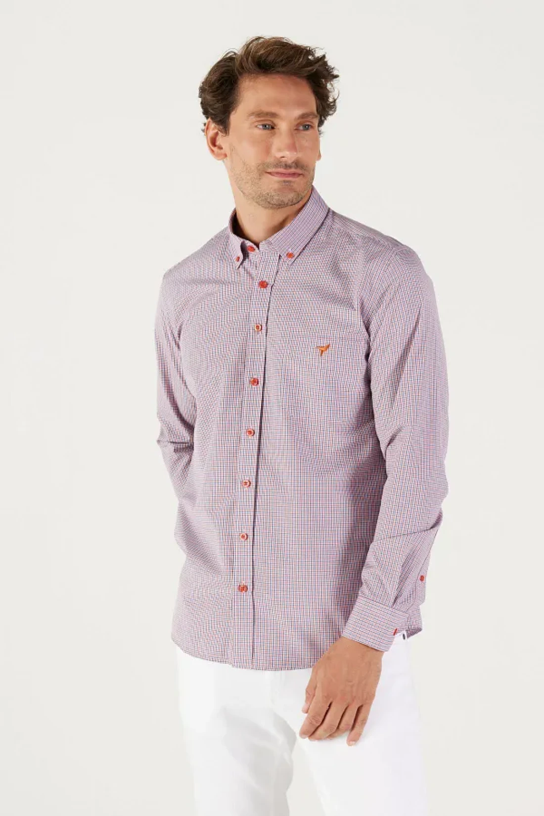 AC&Co / Altınyıldız Classics قميص رجالي مخطط بقصة ضيقة باللون الأزرق الداكن والأحمر وياقة بأزرار وياقة بأزرار وشعار قطن وجيب