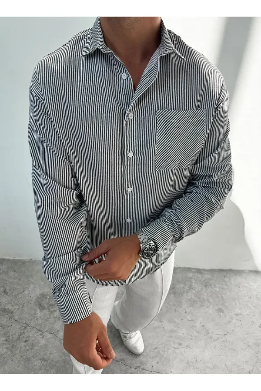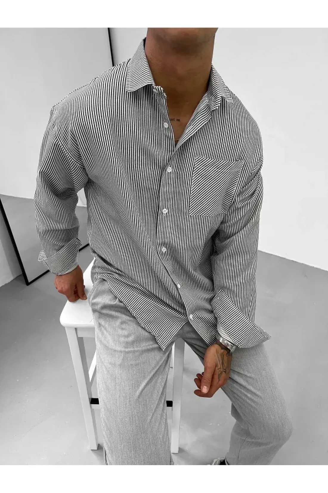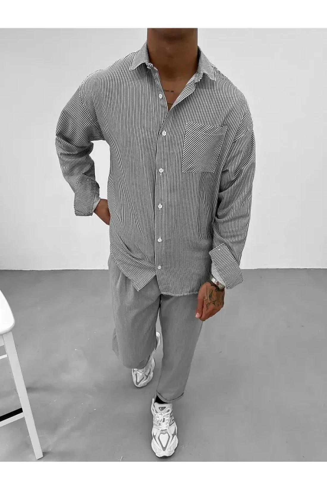 King Brothers قميص رجالي قطني مخطط باللون الأسود - جيب، كم طويل، مقاس فضفاض