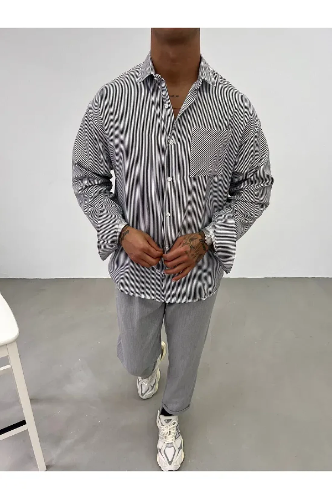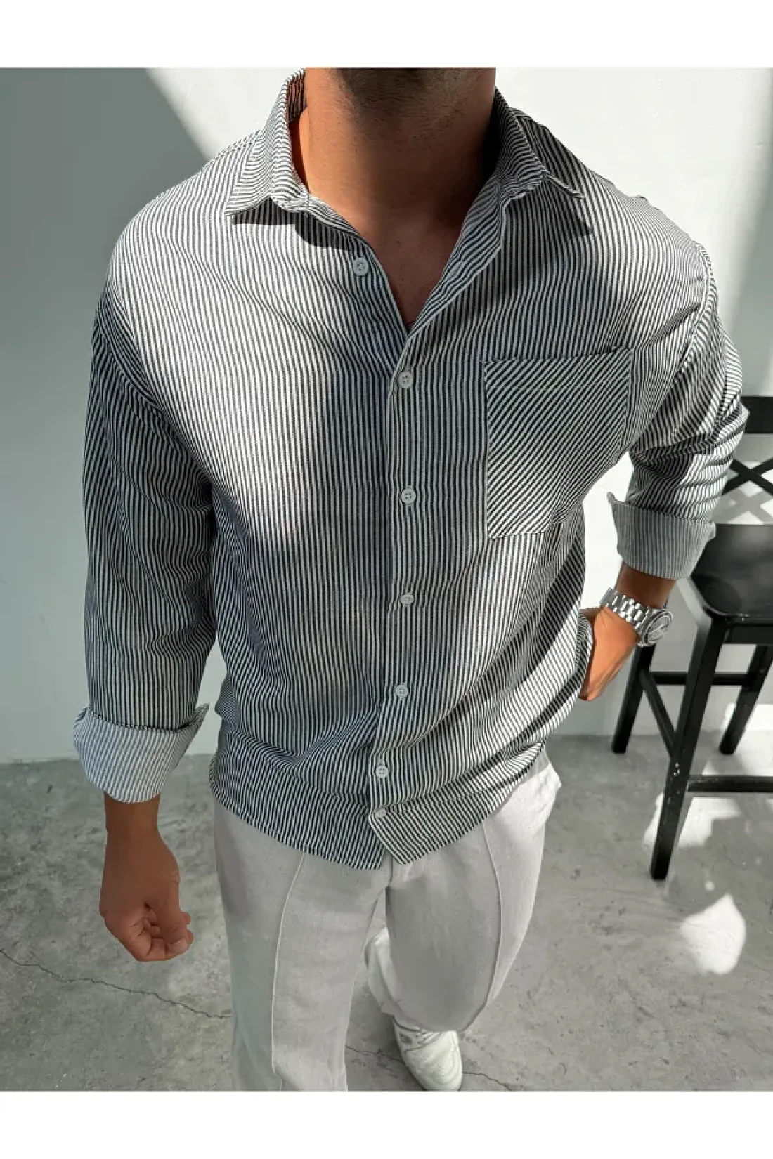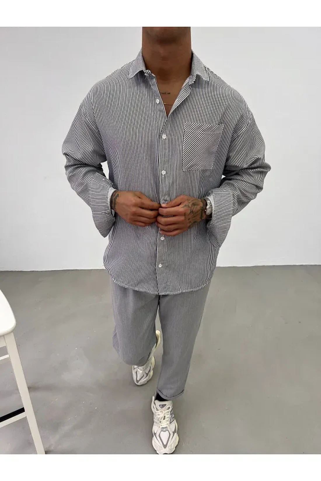 King Brothers قميص رجالي قطني مخطط باللون الأسود - جيب، كم طويل، مقاس فضفاض