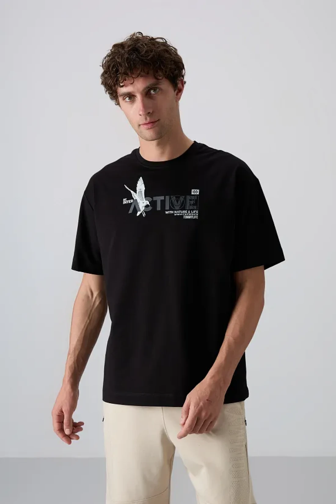 Tommy Life تي شيرت رجالي من القطن الأسود السميك الناعم المطبوع مقاس كبير - 88344