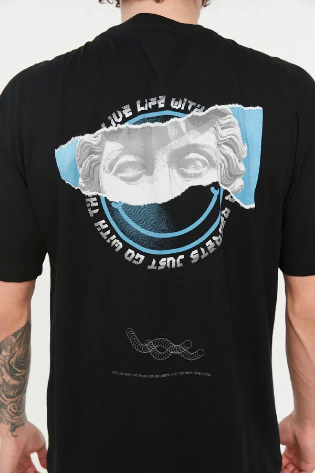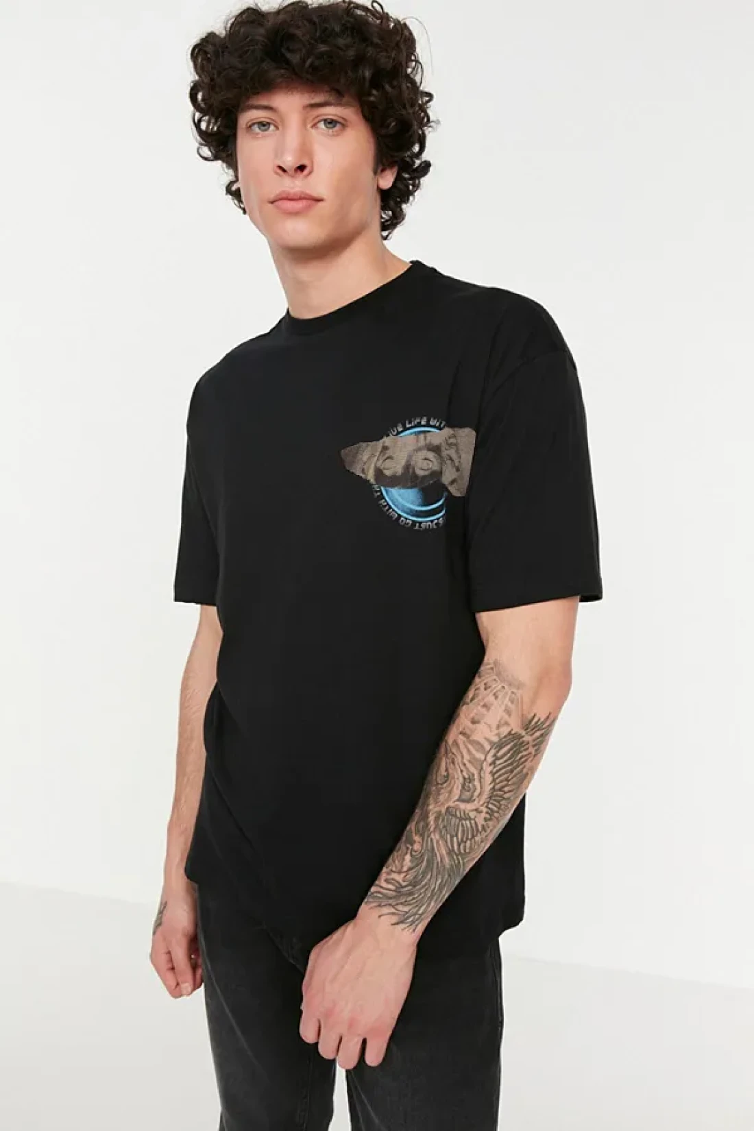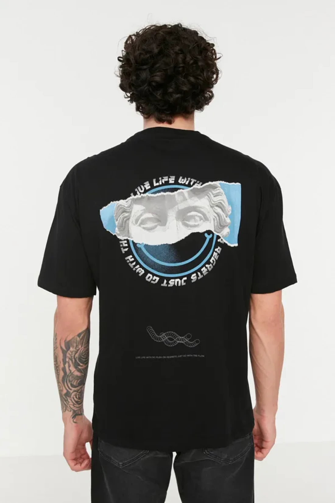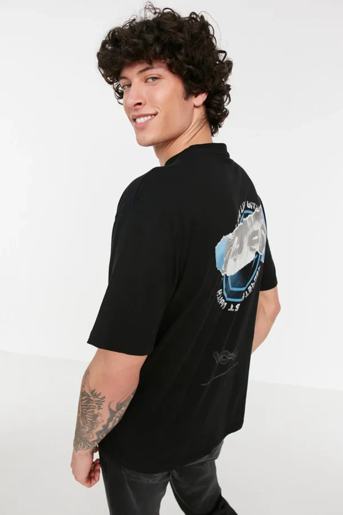 Collection تي شيرت أسود كبير الحجم بطبعة فنية - كم قصير، نسيج 100% TMNSS21TS3668