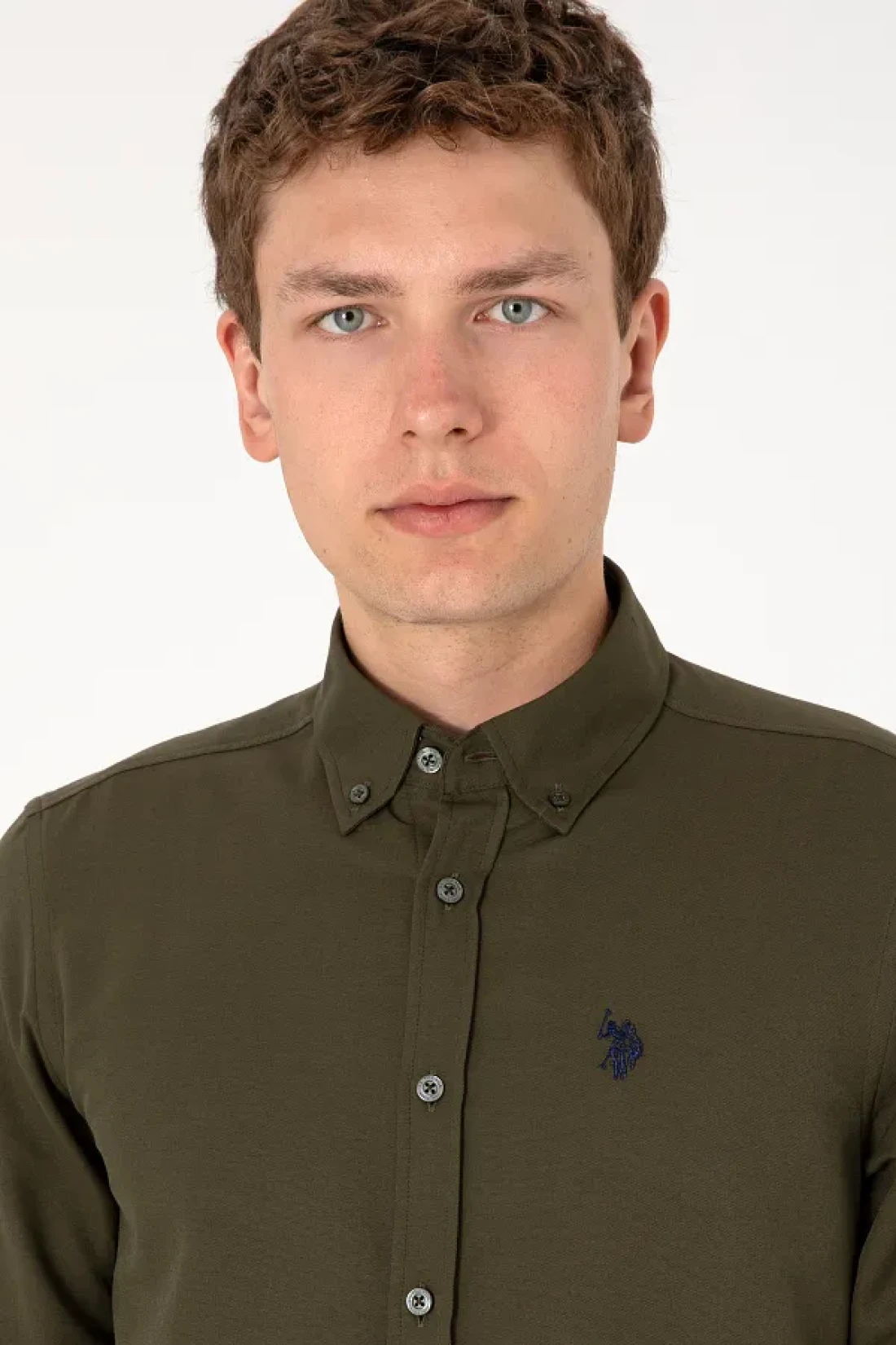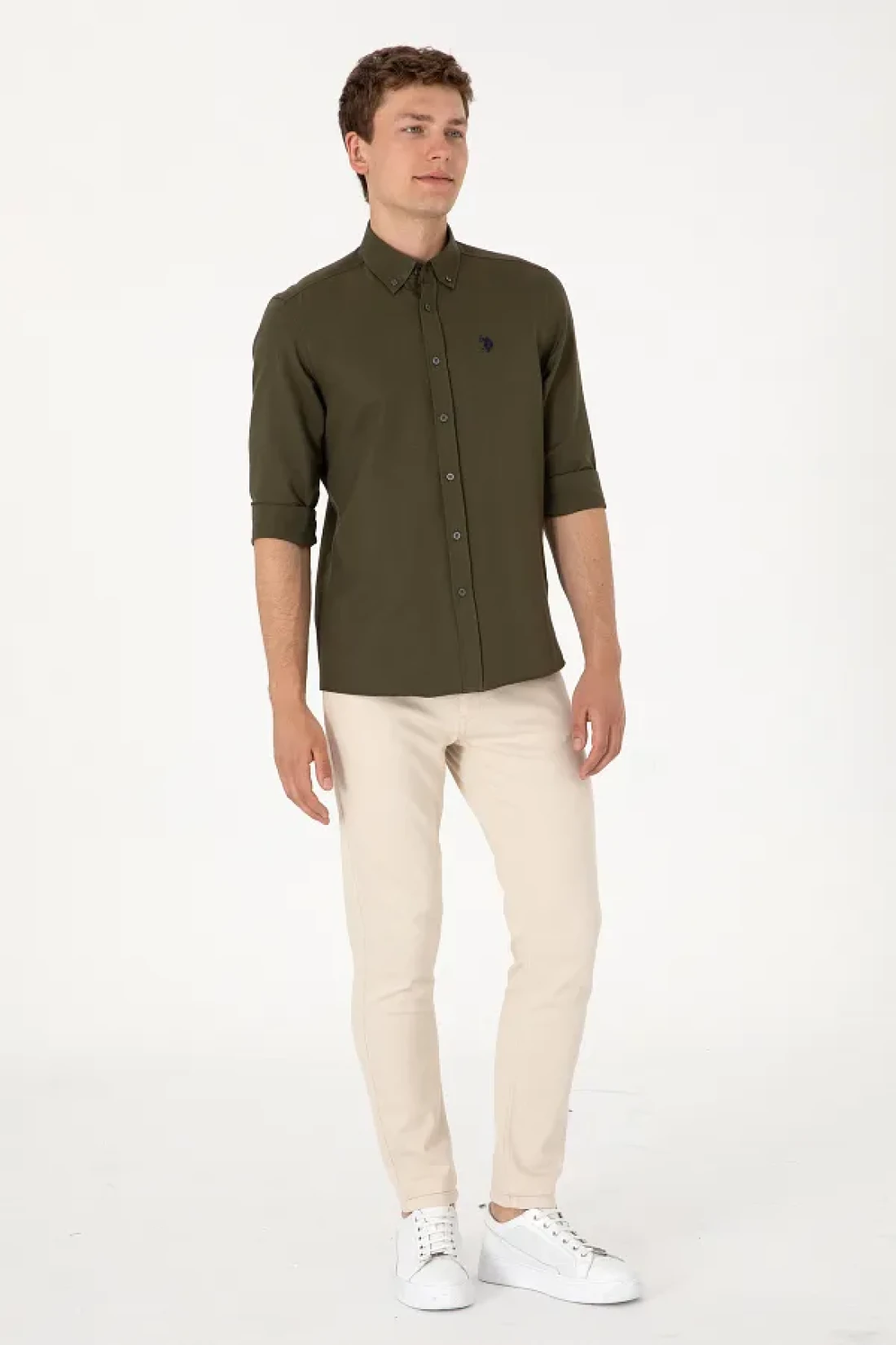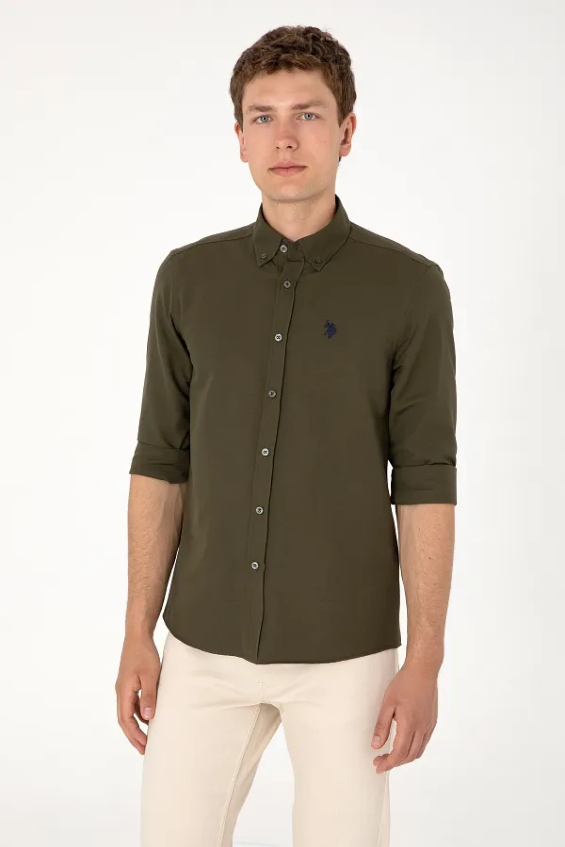 U.S. Polo Assn. قميص أساسي بأكمام طويلة كاكي داكن للرجال 50306338 -VR111