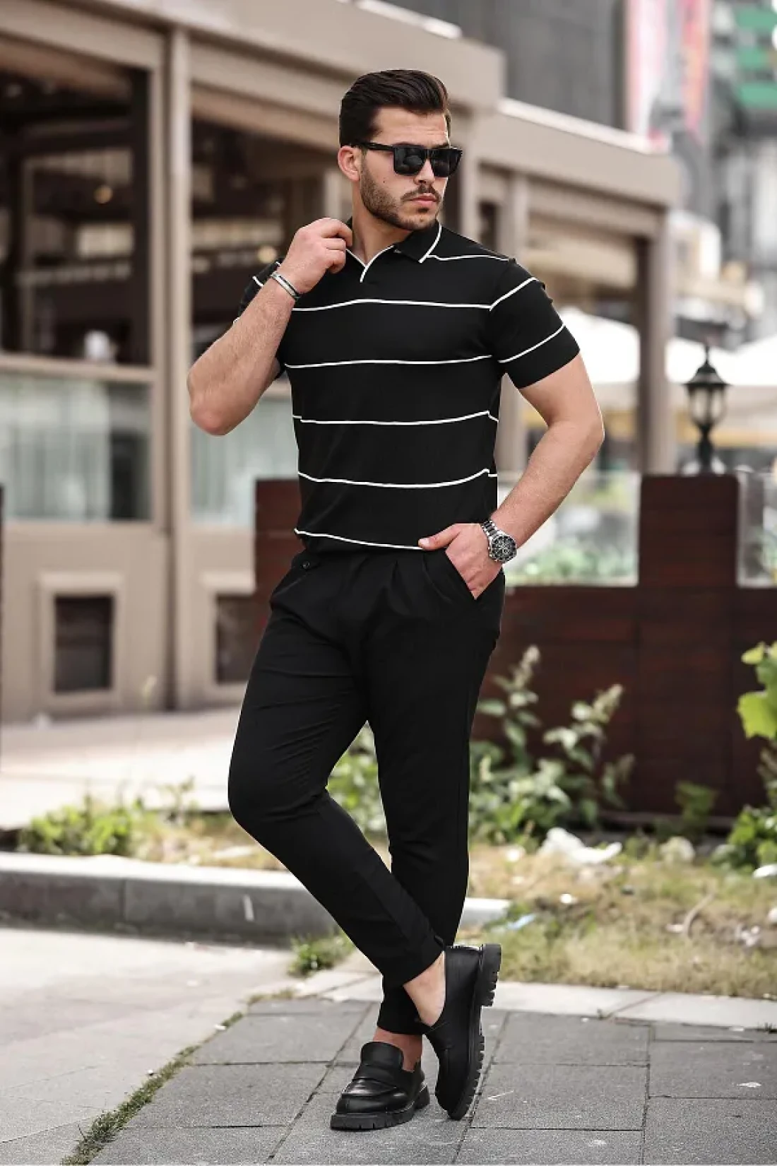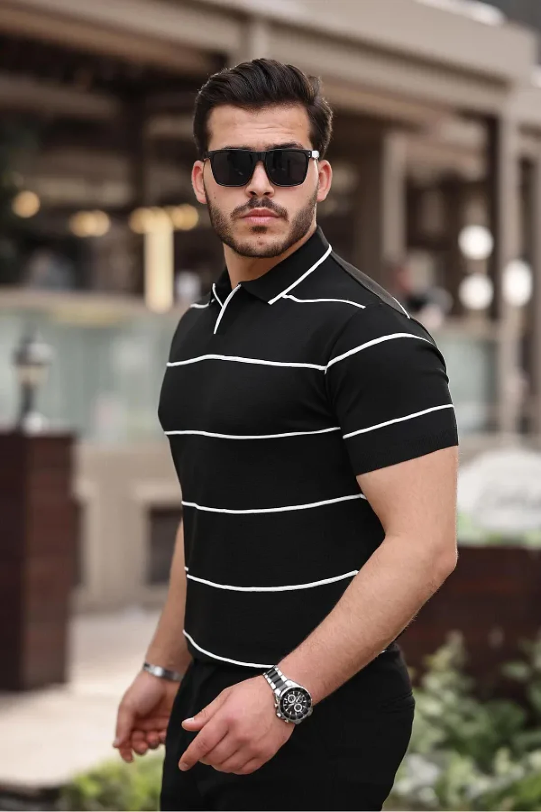 Miron تي شيرت تريكو مخطط باللون الأسود بياقة بولو - 2427
