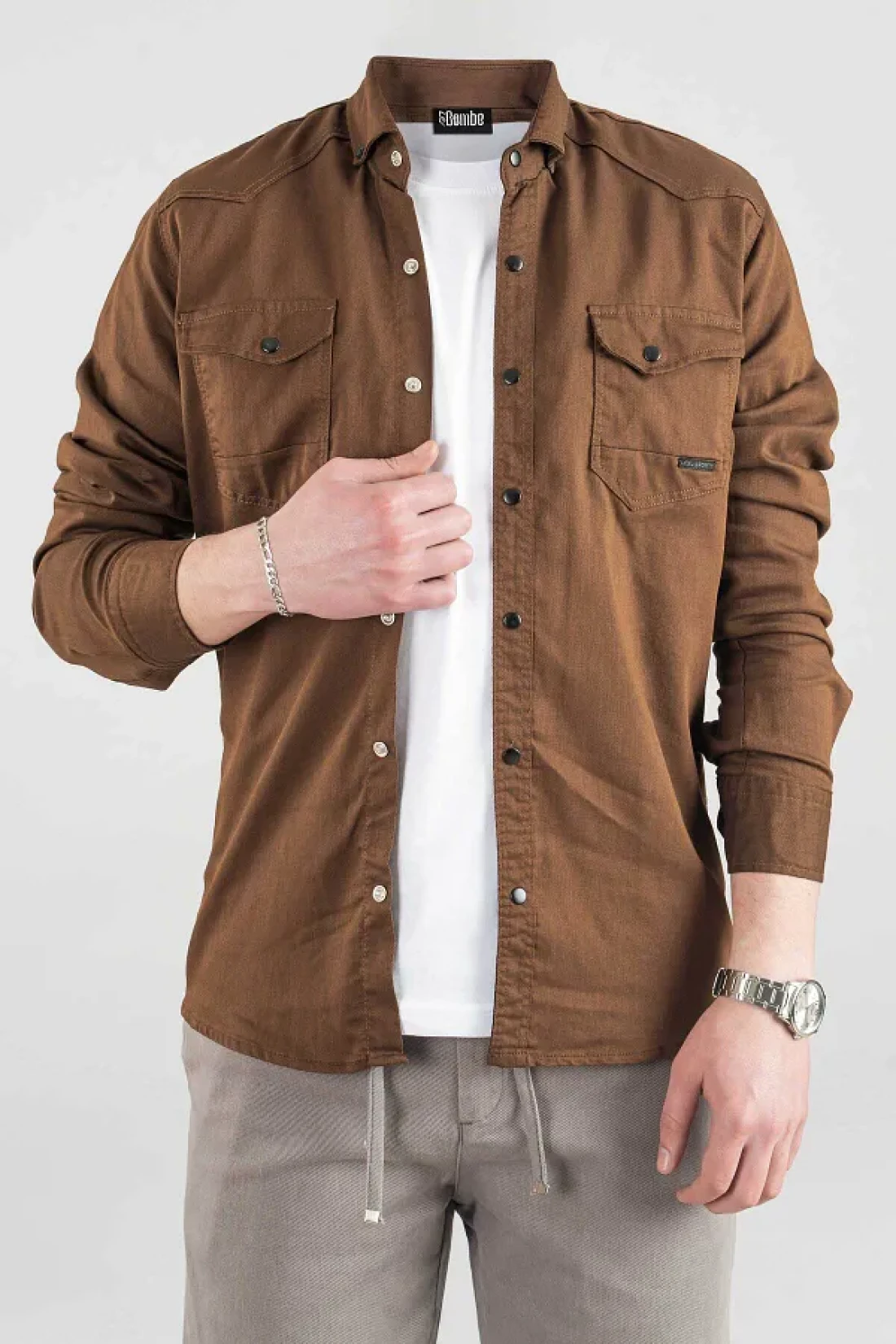 bombe قميص دينم رجالي بقصة ضيقة باللون البني