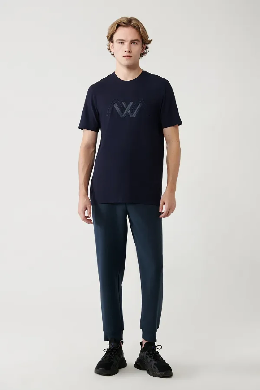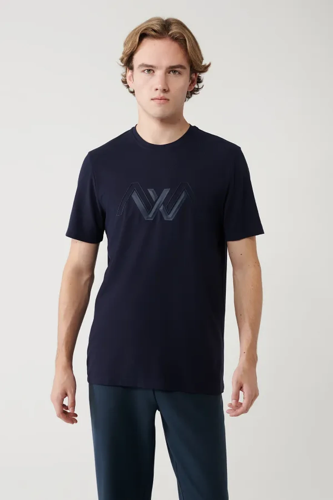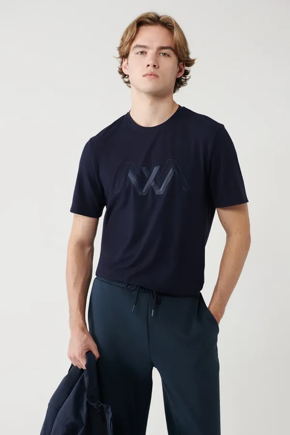 Avva تي شيرت رجالي باللون الأزرق الداكن برقبة دائرية وطبعة ناعمة الملمس A41y1037